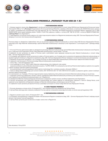 REGULAMIN PROMOCJI „PIERWSZY FILM VOD ZA 1 ZŁ” I. POSTANOWIENIA OGÓLNE 1.Niniejszy regulamin, (zwany dalej „Regulaminem”), określa warunki promocji organizowanej w ramach Usługi VOD-Domowa Wypożyczalnia Filmowa pod nazwą „Pierwszy film VOD za 1 zł”, („Promocja”). Organizatorem Promocji jest Cyfrowy Polsat S.A. z siedzibą w Warszawie, ul. Łubinowa 4a, 03-878 Warszawa, wpisana do rejestru przedsiębiorców prowadzonego przez Sąd Rejonowy dla m.st. Warszawy, XIII Wydział Gospodarczy Krajowego Rejestru Sądowego pod nr KRS 0000010078, której kapitał zakładowy wynosi 13.934.113,44 PLN, opłacony w całości, o numerze NIP 796-18-10-732, o numerze REGON: 670925160, („Cyfrowy Polsat” lub „Organizator”). 2.Jeżeli Regulamin nie stanowi inaczej, pojęcia w nim użyte mają znaczenia nadane im w Regulaminie świadczenia usługi „VOD - Domowa Wypożyczalnia Filmowa” dostępnym na stronie internetowej www.cyfrowypolsat.pl. II. POSTANOWIENIA OGÓLNE Promocja polega na udostępnianiu Użytkownikowi, który po raz pierwszy wypożycza Materiał Audiowizualny w ramach Usługi VOD Domowa Wypożyczalnia Filmowa, wybranego przez niego Materiału Audiowizualnego, spośród Materiałów Audiowizualnych wskazanych przez Organizatora, w promocyjnej cenie 1 (jednego) złotego brutto. III. ZASADY PROMOCJI 1.W ramach Promocji, jednorazowa opłata za udostępnienie pierwszego Materiału Audiowizualnego spośród Materiałów Audiowizualnych wskazanych przez Organizatora, tj. wybranych przez Organizatora filmów z Bazy Materiałów Audiowizualnych, wynosić będzie 1 zł brutto. 2.Użytkownik nie jest uprawniony do udziału w Promocji, jeżeli w jakimkolwiek czasie wypożyczył przynajmniej jeden Materiał Audiowizualny w ramach Usługi VOD – Domowa Wypożyczalnia Filmowa. 3.W przypadku, gdy Użytkownik nie jest uprawniony do udziału w Promocji zgodnie z ust. 2 powyżej, jest on uprawniony do wypożyczenia Materiału Audiowizualnego na zasadach ogólnych określonych w Regulaminie świadczenia usługi „VOD - Domowa Wypożyczalnia Filmowa” dostępnym na stronie internetowej www.cyfrowypolsat.pl. 4.Niezależnie od ograniczeń wynikających z ust. 2 powyżej, Promocja nie dotyczy Materiałów Audiowizualnych przeznaczonych wyłącznie dla widzów dorosłych . 5.Użytkownik może skorzystać z Promocji zamawiając Materiał Audiowizualny za pośrednictwem: • strony: http://www.cyfrowypolsat.pl/vod/; • sms-a wysłanego na numer 7043 z kodem Materiału Audiowizualnego, który Użytkownik może uzyskać: a) poprzez wciśnięcie na pilocie Dekodera dwukrotnie przycisku „I” lub EPG/GUIDE/G na wskazanych przez Cyfrowy Polsat kanałach (opłata za wysłanie sms-a zgodnie z planem taryfowym operatora telekomunikacyjnego); b) za pośrednictwem www.cyfrowypolsat.pl/vod po wybraniu konkretnego filmu i wciśnięciu przycisku „Zamawiam SMS-em”; • Centrum Obsługi Klienta dostępnego pod numerem telefonu 801 08 08 08, 222 127 222, 699 00 22 22, (opłata za połączenie zgodnie z planem taryfowym operatora telekomunikacyjnego). 6.Z zastrzeżeniem ust. 4 powyżej, z Promocji mogą skorzystać wszyscy Użytkownicy, którzy dokonują zamówienia Materiału Audiowizualnego po raz pierwszy. 7.Organizator poinformuje Użytkownika o okresie, w którym udostępniony będzie Materiał Audiowizualny zamówiony przez Użytkownika w ramach Promocji w sposób, w jaki Użytkownik zamówił Materiał Audiowizualny (patrz ust. 5 Regulaminu). 8.Udostępnienie Materiału Audiowizualnego jest równoznaczne z pozytywnym wynikiem procesu weryfikacji Użytkownika przez Organizatora. 9.Zamiana zamówionego przez Użytkownika Materiału Audiowizualnego jest możliwa wyłącznie za pośrednictwem połączenia z Centrum Obsługi Klienta, przed uzyskaniem przez Użytkownika od Organizatora dostępu do Materiału Audiowizualnego, zamówionego w ramach Promocji. 10. Użytkownik nie jest uprawniony do łączenia Promocji z pozostałymi promocjami w ramach Usługi VOD Domowej Wypożyczalni Filmowej IV. CZAS TRWANIA PROMOCJI 1. Promocja obowiązuje w okresie od dnia 16 listopada 2011 roku od godziny 6:00 do jej odwołania przez Cyfrowy Polsat. 2.Cyfrowy Polsat zastrzega sobie możliwość przedłużenia Promocji, poprzez umieszczenie stosownego komunikatu na stronie www.cyfrowypolsat.pl/VOD. V. POSTANOWIENIA KOŃCOWE 1.Regulamin wchodzi w życie z dniem 16 listopada 2011 roku. 2.W kwestiach nieuregulowanych w Regulaminie będzie miał zastosowanie Regulamin świadczenia Usługi „VOD – Domowa Wypożyczalnia Filmowa” znajdujący się pod adresem internetowym www.cyfrowypolsat.pl. 3.Cyfrowy Polsat uprawniony jest do dokonania w każdym czasie zmian w Regulaminie. Data aktualizacji: 18 luty 2012 1