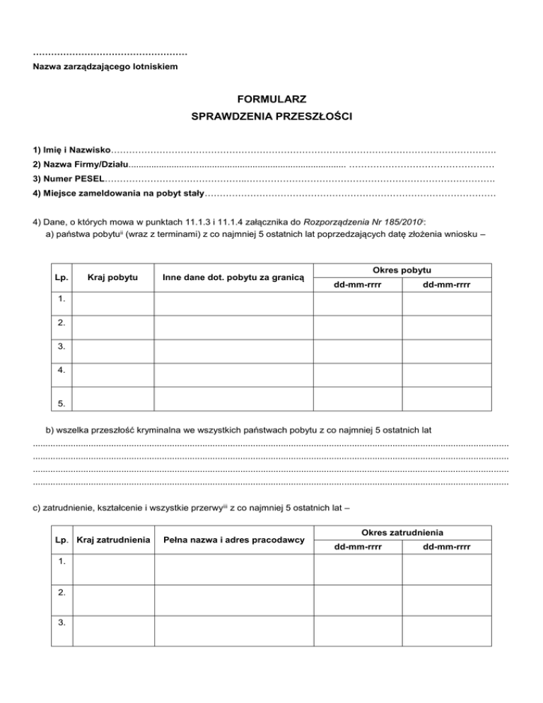 …………………………………………… Nazwa zarządzającego lotniskiem FORMULARZ SPRAWDZENIA PRZESZŁOŚCI 1) Imię i Nazwisko………………………………………………………………………………………………………………. 2) Nazwa Firmy/Działu...................................................................................... ………………………………………… 3) Numer PESEL………………………………………..………………………………………………………………………. 4) Miejsce zameldowania na pobyt stały…………………………………………………………………………………… 4) Dane, o których mowa w punktach 11.1.3 i 11.1.4 załącznika do Rozporządzenia Nr 185/2010i: a) państwa pobytuii (wraz z terminami) z co najmniej 5 ostatnich lat poprzedzających datę złożenia wniosku – Lp. Kraj pobytu Inne dane dot. pobytu za granicą Okres pobytu dd-mm-rrrr dd-mm-rrrr 1. 2. 3. 4. 5. b) wszelka przeszłość kryminalna we wszystkich państwach pobytu z co najmniej 5 ostatnich lat ............................................................................................................................................................................................ ............................................................................................................................................................................................ ............................................................................................................................................................................................ ............................................................................................................................................................................................ c) zatrudnienie, kształcenie i wszystkie przerwyiii z co najmniej 5 ostatnich lat – Lp. Kraj zatrudnienia 1. 2. 3. Pełna nazwa i adres pracodawcy Okres zatrudnienia dd-mm-rrrr dd-mm-rrrr 4. 5. 6. Lp. Kraj kształcenia Okres kształcenia Pełna nazwa i rodzaj szkoły/uczelni dd-mm-rrrr dd-mm-rrrr 1. 2. 3. 4. 5. 6. Informacje dotyczące przerw w zatrudnieniu i kształceniu trwających dłużej niż 28 dni: ............................................................................................................................................................................................ ............................................................................................................................................................................................ ............................................................................................................................................................................................ ............................................................................................................................................................................................ Data ...................... podpis ......................................... Wynik sprawdzenia przeszłości: Sprawdzenia dokonał: pozytywny / negatywnyiv Data ...................... podpis ......................................... Rozporządzenie Komisji (UE) Nr 185/2010 z dn. 04.03.10. ustanawiającego szczegółowe środki w celu wprowadzenia w życie wspólnych podstawowych norm ochrony lotnictwa cywilnego. ii „Państwo pobytu” oznacza każdy kraj, w którym osoba przebywała stale przez 6 miesięcy lub dłużej. iii „Przerwa w udokumentowanym kształceniu lub zatrudnieniu” oznacza przerwę przekraczającą 28 dni. i iv Niepotrzebne skreślić