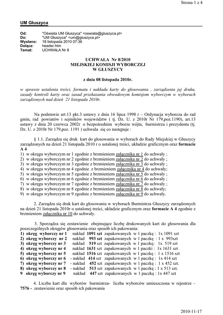 Strona 1 z 4 UM Głuszyca Od: Do: Wysłano: Dołącz: Temat: "Oświata UM Głuszyca" <[email protected]> "UM Głuszyca" <[email protected]> 18 listopada 2010 07:36 header.htm UCHWAŁA Nr 8 UCHWAŁA Nr 8/2010 MIEJSKIEJ KOMISJI WYBORCZEJ W GŁUSZYCY z dnia 08 listopada 2010r. w sprawie ustalenia treści, formatu i nakładu karty do głosowania , zarządzenia jej druku, zasady kontroli karty oraz zasad przekazania obwodowym komisjom wyborczym w wyborach zarządzonych nad dzień 21 listopada 2010r. Na podstawie art.13 pkt.3 ustawy z dnia 16 lipca 1998 r – Ordynacja wyborcza do rad gmin, rad powiatów i sejmików województw ( tj. Dz. U. z 2010r Nr 179,poz.1190), art.13 ustawy z dnia 20 czerwca 2002r o bezpośrednim wyborze wójta, burmistrza i prezydenta (tj. Dz. U. z 2010r Nr 179,poz. 1191 ) uchwala się co następuje : § 1.1. Zarządza się druk kart do głosowania w wyborach do Rady Miejskiej w Głuszycy zarządzonych na dzień 21 listopada 2010 r o ustalonej treści, układzie graficznym oraz formacie A4 1) w okręgu wyborczym nr 1 zgodnie z brzmieniem załącznika nr 1 do uchwały ; 2) w okręgu wyborczym nr 2 zgodnie z brzmieniem załącznika nr 2 do uchwały ; 3) w okręgu wyborczym nr 3 zgodnie z brzmieniem załącznika nr 3 do uchwały ; 4) w okręgu wyborczym nr 4 zgodnie z brzmieniem załącznika nr 4 do uchwały; 5) w okręgu wyborczym nr 5 zgodnie z brzmieniem załącznika nr 5 do uchwały ; 6) w okręgu wyborczym nr 6 zgodnie z brzmieniem załącznika nr 6 do uchwały ; 7) w okręgu wyborczym nr 7 zgodnie z brzmieniem załącznika nr 7 do uchwały ; 8) w okręgu wyborczym nr 8 zgodnie z brzmieniem załącznika nr 8 do uchwały; 9) w okręgu wyborczym nr 9 zgodnie z brzmieniem załącznika nr 9 do uchwały. 2. Zarządza się druk kart do głosowania w wyborach Burmistrza Głuszycy zarządzonych na dzień 21 listopada 2010r o ustalonej treści, układzie graficznym oraz formacie A 4 zgodnie z brzmieniem załącznika nr 10 do uchwały. 3. Sporządza się zestawienie obejmujące liczbę drukowanych kart do głosowania dla poszczególnych okręgów głosowania oraz sposób ich pakowania: 1) okręg wyborczy nr 1 nakład 1091 szt zapakowanych w 1 paczkę : 1x 1091 szt 2) okręg wyborczy nr 2 nakład 993 szt zapakowanych w 1 paczkę : 1 x 993szt 3) okręg wyborczy nr 3 nakład 519 szt zapakowanych w 1 paczkę: 1x 519 szt 4) okręg wyborczy nr 4 nakład 1631 szt zapakowanych w 1 paczki : 1x 1631 szt 5) okręg wyborczy nr 5 nakład 1516 szt zapakowanych w 1 paczkę : 1 x 1516 szt 6) okręg wyborczy nr 6 - nakład 414 szt zapakowanych w 1 paczkę : 1x 414 szt 7) okręg wyborczy nr 7 - nakład 452 szt zapakowanych w 1 paczkę : 1 x 452 szt. 8) okręg wyborczy nr 8 - nakład 513 szt zapakowanych w 1 paczkę : 1 x 513 szt. 9 okręg wyborczy nr 9 nakład 447 szt zapakowanych w 1 paczkę : 1x 447 szt 4. Liczba kart dla wyborów burmistrza- liczba wyborców umieszczona w rejestrze – 7576 - zestawienie oraz sposób ich pakowania 2010-11-17 Strona 2 z 4 1) obwód nr 1 2) obwód nr 2 3) obwód nr 3 4) obwód nr 4 5) obwód nr 5 6) obwód nr 6 nakład nakład nakład nakład nakład nakład 2084 szt zapakowanych w 1 paczkę : 1 x 2084 szt 2150 szt zapakowanych w 1 paczkę : 1x 2150 szt 1516 szt zapakowanych w 1 paczkę : 1x 1516 szt, 866 szt zapakowanych w 1 paczkę : 1x 866 szt, 513 szt zapakowanych w 1 paczkę : 1 x 513 szt, 447 szt zapakowanych w 1 paczkę: 1 x 447 szt. § 2 Karty do glosowania, o których mowa w §1 ust.1 drukuje się na papierze w kolorze białym, a karty o których mowa ust.2 drukuje się na papierze różowym . § 3. Zobowiązuje się Burmistrza Głuszycy do : 1) zlecenia druku kart do głosowania, 2) zlecenia zapakowania paczek z wydrukowanymi kartami do głosowania według okręgów głosowania o których mowa w § 1 ust.3, oraz według obwodów o których mowa w§ 1 ust.4 4) należytego zabezpieczenia przed uszkodzeniem, zniszczeniem lub utratą kart do głosowania podczas przewozu do Urzędu Miejskiego w Głuszycy, 5) przekazania w formie protokolarnej , odpowiednio oznakowanych paczek z kartami do głosowania obwodowym komisjom wyborczym .wg harmonogramu , zgodnie z brzmieniem załącznika nr 11 do uchwały. § 4. Druk kart do głosowania odbywa się z zachowaniem warunków najwyższej staranności wg następujących zasad kontroli : 1) korektę składu karty do głosowania przeprowadzą dwa niezależne od siebie zespoły kontrolne składające się z pracowników Urzędu Miejskiego w Głuszycy w zakresie czy : a. karty opracowano w odpowiednim formacie, b. przy oznaczeniu numeru okręgu wyborczego na kartach zamieszczono dokładną nazwę karty, c. kart do głosowania w wyborach burmistrza, u góry po lewej stronie ma oznaczenie : „ „Wybory Burmistrz Głuszycy „ d. napis na środku karty do głosowania odpowiada wyborom, których karta dotyczy, e. wielkość i rodzaj czcionek użytych do druku kart do głosowania dla danego rodzaju kart list kandydatów i kandydatów na tych listach oraz dla oznaczeń list a wyborach burmistrza kandydatów. f. karty do głosowania opatrzone są pieczęcią Miejskiej Komisji Wyborczej w Głuszycy, g. każda lista kandydatów na radnych zawiera oznaczenie ‘ List Nr …. oraz skrót nazwy komitetu, h. listy na karcie do głosowania są uszeregowane w kolumnach w kolejności nadanych im na podstawie losowania, i. nazwiska i imiona kandydatów są uszeregowane w kolejności identycznej, jak w zarejestrowanych protokołach, j. w wyborach burmistrza nazwiska kandydatów na karcie są uszeregowane w kolejności alfabetycznej , imieniem, imionami każdego kandydata, umieszczono adnotację „ zgłoszony przez … „( nazwa komitetu wyborczego, który zgłosił kandydata.) k. w pisowni nazwisk i imion kandydatów nie ma błędów, l. na karcie do głosowania nie pominięto któregokolwiek zarejestrowanego kandydata, m. karta zawiera właściwą treść informacji o sposobie głosowania, n. oznaczono miejsce na odcisk obwodowej komi