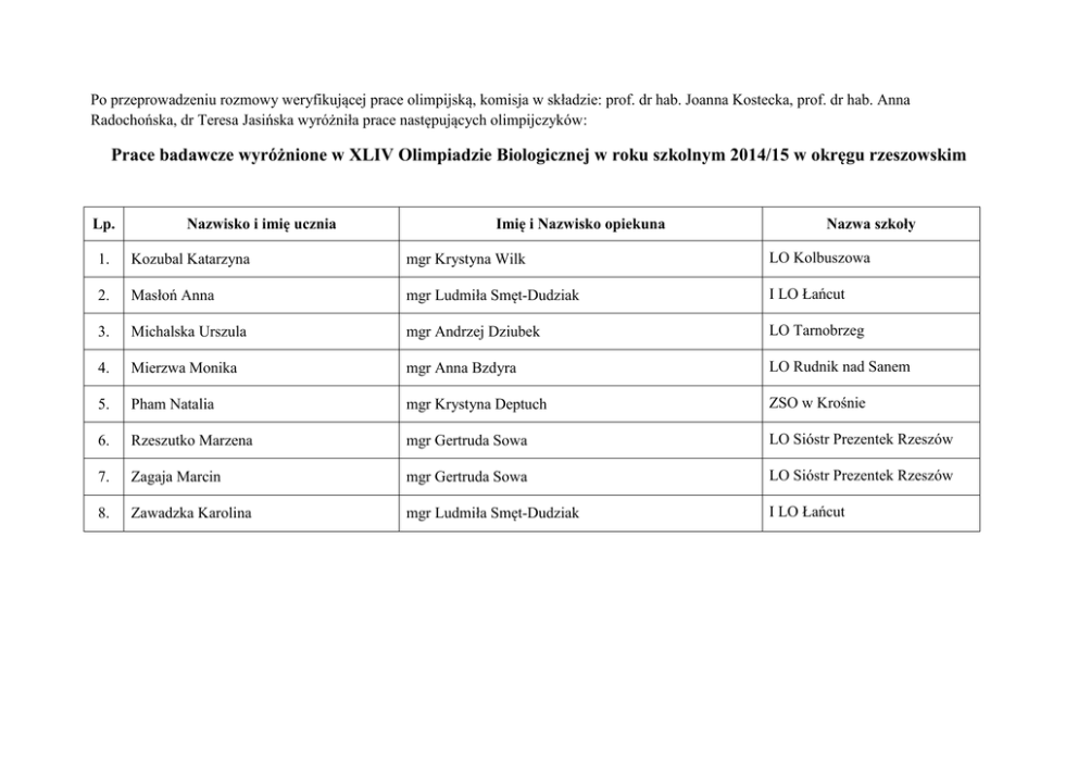Po przeprowadzeniu rozmowy weryfikującej prace olimpijską, komisja w składzie: prof. dr hab. Joanna Kostecka, prof. dr hab. Anna Radochońska, dr Teresa Jasińska wyróżniła prace następujących olimpijczyków: Prace badawcze wyróżnione w XLIV Olimpiadzie Biologicznej w roku szkolnym 2014/15 w okręgu rzeszowskim Lp. Nazwisko i imię ucznia Imię i Nazwisko opiekuna Nazwa szkoły 1. Kozubal Katarzyna mgr Krystyna Wilk LO Kolbuszowa 2. Masłoń Anna mgr Ludmiła Smęt-Dudziak I LO Łańcut 3. Michalska Urszula mgr Andrzej Dziubek LO Tarnobrzeg 4. Mierzwa Monika mgr Anna Bzdyra LO Rudnik nad Sanem 5. Pham Natalia mgr Krystyna Deptuch ZSO w Krośnie 6. Rzeszutko Marzena mgr Gertruda Sowa LO Sióstr Prezentek Rzeszów 7. Zagaja Marcin mgr Gertruda Sowa LO Sióstr Prezentek Rzeszów 8. Zawadzka Karolina mgr Ludmiła Smęt-Dudziak I LO Łańcut