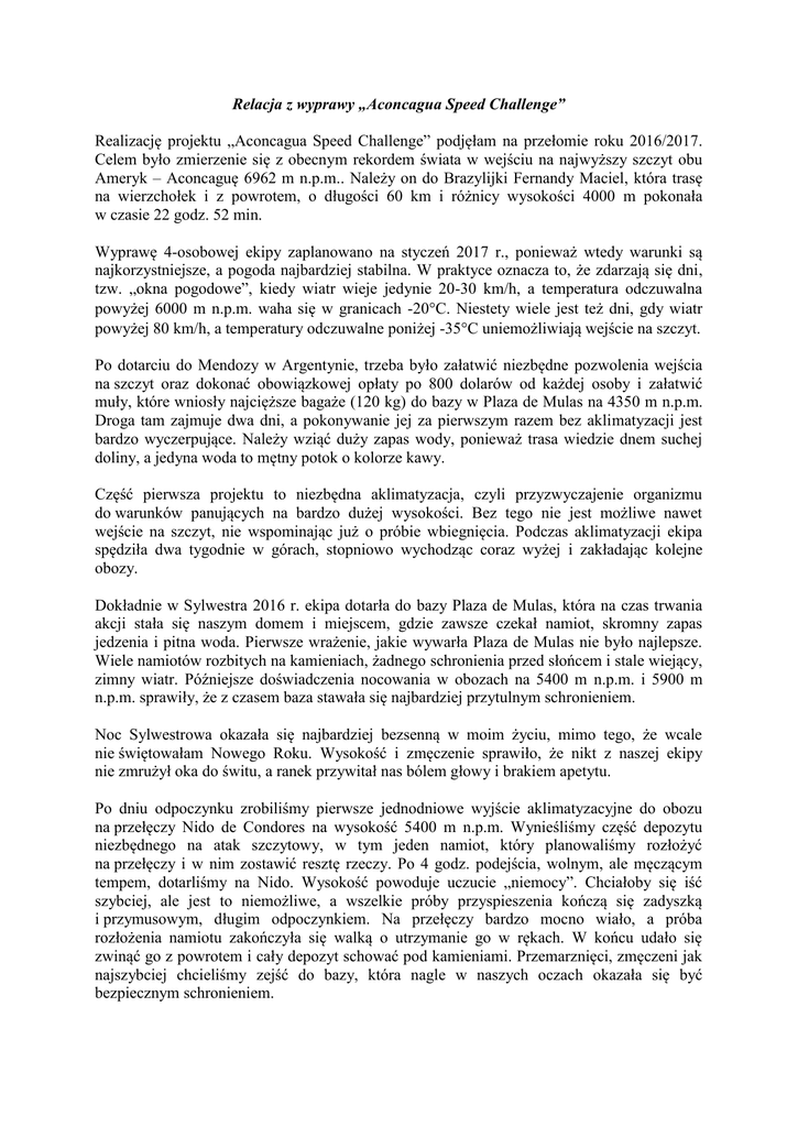 Relacja z wyprawy „Aconcagua Speed Challenge” Realizację projektu „Aconcagua Speed Challenge” podjęłam na przełomie roku 2016/2017. Celem było zmierzenie się z obecnym rekordem świata w wejściu na najwyższy szczyt obu Ameryk – Aconcaguę 6962 m n.p.m.. Należy on do Brazylijki Fernandy Maciel, która trasę na wierzchołek i z powrotem, o długości 60 km i różnicy wysokości 4000 m pokonała w czasie 22 godz. 52 min. Wyprawę 4-osobowej ekipy zaplanowano na styczeń 2017 r., ponieważ wtedy warunki są najkorzystniejsze, a pogoda najbardziej stabilna. W praktyce oznacza to, że zdarzają się dni, tzw. „okna pogodowe”, kiedy wiatr wieje jedynie 20-30 km/h, a temperatura odczuwalna powyżej 6000 m n.p.m. waha się w granicach -20C. Niestety wiele jest też dni, gdy wiatr powyżej 80 km/h, a temperatury odczuwalne poniżej -35C uniemożliwiają wejście na szczyt. Po dotarciu do Mendozy w Argentynie, trzeba było załatwić niezbędne pozwolenia wejścia na szczyt oraz dokonać obowiązkowej opłaty po 800 dolarów od każdej osoby i załatwić muły, które wniosły najcięższe bagaże (120 kg) do bazy w Plaza de Mulas na 4350 m n.p.m. Droga tam zajmuje dwa dni, a pokonywanie jej za pierwszym razem bez aklimatyzacji jest bardzo wyczerpujące. Należy wziąć duży zapas wody, ponieważ trasa wiedzie dnem suchej doliny, a jedyna woda to mętny potok o kolorze kawy. Część pierwsza projektu to niezbędna aklimatyzacja, czyli przyzwyczajenie organizmu do warunków panujących na bardzo dużej wysokości. Bez tego nie jest możliwe nawet wejście na szczyt, nie wspominając już o próbie wbiegnięcia. Podczas aklimatyzacji ekipa spędziła dwa tygodnie w górach, stopniowo wychodząc coraz wyżej i zakładając kolejne obozy. Dokładnie w Sylwestra 2016 r. ekipa dotarła do bazy Plaza de Mulas, która na czas trwania akcji stała się naszym domem i miejscem, gdzie zawsze czekał namiot, skromny zapas jedzenia i pitna woda. Pierwsze wrażenie, jakie wywarła Plaza de Mulas nie było najlepsze. Wiele namiotów rozbitych na kamieniach, żadnego schronienia przed słońcem i stale wiejący, zimny wiatr. Późniejsze doświadczenia nocowania w obozach na 5400 m n.p.m. i 5900 m n.p.m. sprawiły, że z czasem baza stawała się najbardziej przytulnym schronieniem. Noc Sylwestrowa okazała się najbardziej bezsenną w moim życiu, mimo tego, że wcale nie świętowałam Nowego Roku. Wysokość i zmęczenie sprawiło, że nikt z naszej ekipy nie zmrużył oka do świtu, a ranek przywitał nas bólem głowy i brakiem apetytu. Po dniu odpoczynku zrobiliśmy pierwsze jednodniowe wyjście aklimatyzacyjne do obozu na przełęczy Nido de Condores na wysokość 5400 m n.p.m. Wynieśliśmy część depozytu niezbędnego na atak szczytowy, w tym jeden namiot, który planowaliśmy rozłożyć na przełęczy i w nim zostawić resztę rzeczy. Po 4 godz. podejścia, wolnym, ale męczącym tempem, dotarliśmy na Nido. Wysokość powoduje uczucie „niemocy”. Chciałoby się iść szybciej, ale jest to niemożliwe, a wszelkie próby przyspieszenia kończą się zadyszką i przymusowym, długim odpoczynkiem. Na przełęczy bardzo mocno wiało, a próba rozłożenia namiotu zakończyła się walką o utrzymanie go w rękach. W końcu udało się zwinąć go z powrotem i cały depozyt schować pod kamieniami. Przemarznięci, zmęczeni jak najszybciej chcieliśmy zejść do bazy, która nagle w naszych oczach okazała się być bezpiecznym schronieniem. W środę 4 stycznia 2017 r. kolejny raz pokonaliśmy podejście na Nido de Condores. Wydeptana ścieżka wiodąca zakosami na przełęcz wydawała się być tym razem dłuższa. Szliśmy z zamiarem spędzenia 2-3 nocy w wyższych obozach, więc plecaki z jedzeniem i ekwipunkiem były bardzo ciężkie. Dodatkowo nieustający, zimny wiatr utrudniał podejście. Tym razem udało się nam rozbić namiot, który niestety okazał się być mniejszy niż się spodziewaliśmy. Roztopiliśmy śnieg, żeby ugotować herbatę i liofilizowany posiłek. Noc okazała się wyjątkowo ciężka. Ciasny namiot, szron osiadający na jego wewnętrznych ścianach i sypiący się na twarz oraz silny wiatr sprawiły, że prawie nie zmrużyliśmy oka. O poranku trudno było zmusić się do wyjścia z namiotu. Było zimno, całe ciało skostniałe i obolałe, a śpiwory i ubrania zawilgnięte. Ledwo zmusiliśmy się, aby zjeść nieco kisielu i kilku herbatników na śniadanie. Im wyżej tym apetyt gorszy, a wydatek energetyczny większy. Ruszyliśmy w stronę kolejnego obozu, ale z zamiarem powrotu na noc do Nido. Udało się osiągnąć wysokość 6000m n.p.m. i zostawić niewielki depozyt w obozie Berlina na 5900 m n.p.m.. Druga noc na Nido była nieco lepsza. Moja siostra zdecydowała się wrócić do bazy Plaza de Mulas, a ja z Łukaszem, po sprawdzeniu prognozy pogody, postanowiliśmy kolejnego dnia iść na noc do obozu Berlina, po czym 7 stycznia zaatakować szczyt. Musieliśmy tym samym skrócić planowaną aklimatyzację o 3 dni. Niestety prognozy pokazywały, że sobota jest ostatnim dniem okna pogodowego, a kolejne dni niosą ze sobą silne wiatry i bardzo niskie temperatury do -40C. W sobotę 7 stycznia o godz. 7:30, po kolejnej z rzędu kiepskiej nocy i słabym śniadaniu ruszyliśmy w stronę wierzchołka. Było bardzo zimno i jak zwykle wiał silny wiatr. Po półtorej godziny podejścia, nie czułam już zupełnie palców u stóp. Po doświadczeniach z wyprawy na siedmiotysięcznik Pik Lenina, gdy odmroziłam palce i na pół roku straciłam w nich czucie, nie chciałam znowu ryzykować, tym bardziej, że kolejne odmrożenie mogłoby wiązać się z utratą palców. Wróciłam do namiotu, ponad godzinę rozgrzewałam stopy, a gdy zrobiło się cieplej zeszłam do bazy. Łukasz zdobył tego dnia szczyt. Od momentu jak się rozstaliśmy, podejście zajęło mu jeszcze 5 godzin. Przed godz. 20:00, wycieńczony, ale zadowolony był już w bazie Plaz