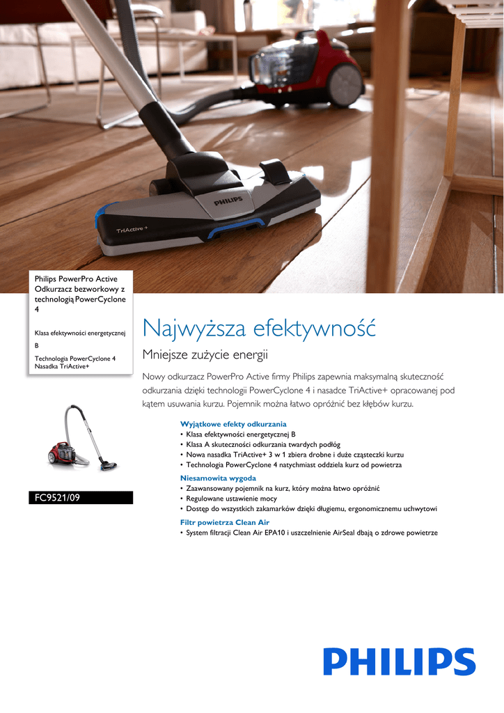 Philips PowerPro Active Odkurzacz bezworkowy z technologią PowerCyclone 4 Klasa efektywności energetycznej B Technologia PowerCyclone 4 Nasadka TriActive+ Najwyższa efektywność Mniejsze zużycie energii Nowy odkurzacz PowerPro Active firmy Philips zapewnia maksymalną skuteczność odkurzania dzięki technologii PowerCyclone 4 i nasadce TriActive+ opracowanej pod kątem usuwania kurzu. Pojemnik można łatwo opróżnić bez kłębów kurzu. Wyjątkowe efekty odkurzania • Klasa efektywności energetycznej B • Klasa A skuteczności odkurzania twardych podłóg • Nowa nasadka TriActive+ 3 w 1 zbiera drobne i duże cząsteczki kurzu • Technologia PowerCyclone 4 natychmiast oddziela kurz od powietrza FC9521/09 Niesamowita wygoda • Zaawansowany pojemnik na kurz, który można łatwo opróżnić • Regulowane ustawienie mocy • Dostęp do wszystkich zakamarków dzięki długiemu, ergonomicznemu uchwytowi Filtr powietrza Clean Air • System filtracji Clean Air EPA10 i uszczelnienie AirSeal dbają o zdrowe powietrze Odkurzacz bezworkowy z technologią PowerCyclone 4 FC9521/09 Klasa efektywności energetycznej B Technologia PowerCyclone 4, Nasadka TriActive+ Zalety Klasa efektywności energetycznej B cyklonicznej, co powoduje oddzielanie się kurzu od powietrza. Łatwe opróżnianie pojemnika na kurz Nasadka TriActive+ Ten odkurzacz został stworzony z myślą o uzyskaniu najwyższej wydajności przy zachowaniu klasy efektywności energetycznej B. Klasa A odkurzania twardych podłóg Nasadka TriActive+ umożliwia wyczyszczenie podłogi jednym ruchem na 3 różne sposoby: 1) Za pomocą specjalnie zaprojektowanej stopy delikatnie „otwiera” dywan w celu dokładnego usunięcia kurzu. 2) Wysysa duże cząsteczki przez duży otwór z przodu. 3) Zamiata kurz i brud wzdłuż mebli i ścian za pomocą dwóch szczotek bocznych. Pojemnik można opróżnić, nie wzbijając w powietrze kłębów kurzu. Jego wyjątkowy kształt i gładka powierzchnia sprawiają, że kurz zbiera się po jednej stronie i równomiernie zsuwa się do kosza na śmieci. Niezwykle długi, ergonomiczny uchwyt Regulacja mocy Ten produkt osiąga najwyższą klasę skuteczności odkurzania twardych podłóg. Zbiera 100% kurzu! Ergonomiczny uchwyt jest wygodny w użytkowaniu. Jego wyjątkowa długość sprawia, że można sięgać dalej i łatwo czyścić trudno dostępne miejsca. Technologia PowerCyclone 4 System filtracji Clean Air EPA10 Regulowane ustawienie mocy pozwala wybrać optymalny poziom ssania dla różnych typów odkurzanych powierzchni. Technologia PowerCyclone 4 zapewnia najdokładniejsze sprzątanie za jednym razem w dwóch niezwykle skutecznych krokach: 1) Powietrze szybko wpływa do komory PowerCyclone dzięki prostemu i gładkiemu wlotowi. 2) Zakrzywiony przepust powietrza przyspiesza jego ruch w górę w komorze Filtr EPA10 z systemem AirSeal zatrzymuje nawet najdrobniejsze cząsteczki kurzu znajdujące się w wydmuchiwanym powietrzu, co zapewnia ochronę przed kurzem oraz czyste i zdrowe powietrze. Odkurzacz bezworkowy z technologią PowerCyclone 4 Klasa efektywności energetycznej B Technologia PowerCyclone 4, Nasadka TriActive+ Dane techniczne Wydajność • • • • • • • • • Klasa efektywności energetycznej: B Roczne zużycie energii: 33,6 kWh Klasa skuteczności odkurzania dywanów: D Klasa skuteczności odkurzania podłóg twardych: A Klasa reemisji kurzu: C Poziom głośności: 78 dB Moc wejściowa (IEC): 750 W Nadmuch (maks.): 27,8 l/s Podciśnienie (maks.): 16,8 kPa • Regulacja mocy: Elektroniczna, na urządzeniu • Typ rury: Metalowa, dwuczęściowa rura teleskopowa • Łączenie rury: Stożkowe • Typ kółek: Gumowe • Uchwyt do przenoszenia: U góry i z przodu Nasadki i akcesoria Wzornictwo • • • • Filtracja Waga i wymiary Parametry użytkowe Zrównoważony rozwój • Kolor: Czerwony • Pojemność pojemnika na kurz: 1,7 l • Filtr wylotowy: Mikrofiltr • Filtr silnika: Zmywalny filtr EPA 10 • Zasięg działania: 9 m • Długość przewodu: 6 m Standardowa nasadka: Nasadka TriActive+ Akcesoria w zestawie: Szczelinówka, Nasadka mała Schowek na akcesoria: Na zacisku na rurze Dodatkowa nasadka: Nasadka do twardych powierzchni • Waga produktu: 6 kg • Wymiary produktu (D x S x W): 473 x 304 x 301 mm • Opakowanie: > 90% materiału z odzysku • Instrukcja obsługi: 100% papier przetworzony • Data wydania 2015-06-23 © 2015 Koninklijke Philips N.V. Wszelkie prawa zastrzeżone. Wersja: 9.1.1 Dane techniczne mogą ulec zmianie bez powiadomienia. Znaki towarowe są własnością Koninklijke Philips N.V. lub własnością odpowiednich firm. EAN: 08 71010 36904 81 www.philips.com FC9521/09