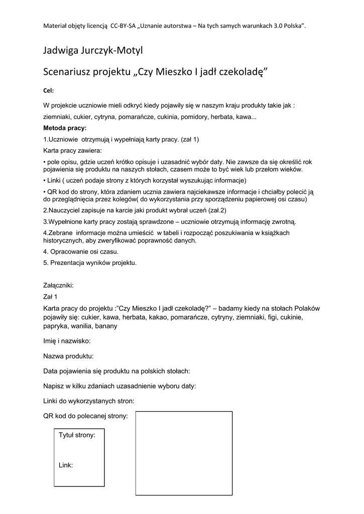 Materiał objęty licencją CC-BY-SA „Uznanie autorstwa – Na tych samych warunkach 3.0 Polska”. Jadwiga Jurczyk-Motyl Scenariusz projektu „Czy Mieszko I jadł czekoladę” Cel: W projekcie uczniowie mieli odkryć kiedy pojawiły się w naszym kraju produkty takie jak : ziemniaki, cukier, cytryna, pomarańcze, cukinia, pomidory, herbata, kawa... Metoda pracy: 1.Uczniowie otrzymują i wypełniają karty pracy. (zał 1) Karta pracy zawiera: • pole opisu, gdzie uczeń krótko opisuje i uzasadnić wybór daty. Nie zawsze da się określić rok pojawienia się produktu na naszych stołach, czasem może to być wiek lub przełom wieków. • Linki ( uczeń podaje strony z których korzystał wyszukując informacje) • QR kod do strony, która zdaniem ucznia zawiera najciekawsze informacje i chciałby polecić ją do przeglądnięcia przez kolegów( do wykorzystania przy sporządzeniu papierowej osi czasu) 2.Nauczyciel zapisuje na karcie jaki produkt wybrał uczeń (zał.2) 3.Wypełnione karty pracy zostają sprawdzone – uczniowie otrzymują informację zwrotną. 4.Zebrane informacje można umieścić w tabeli i rozpocząć poszukiwania w książkach historycznych, aby zweryfikować poprawność danych. 4. Opracowanie osi czasu. 5. Prezentacja wyników projektu. Załączniki: Zał 1 Karta pracy do projektu :”Czy Mieszko I jadł czekoladę?” – badamy kiedy na stołach Polaków pojawiły się: cukier, kawa, herbata, kakao, pomarańcze, cytryny, ziemniaki, figi, cukinie, papryka, wanilia, banany Imię i nazwisko: Nazwa produktu: Data pojawienia się produktu na polskich stołach: Napisz w kilku zdaniach uzasadnienie wyboru daty: Linki do wykorzystanych stron: QR kod do polecanej strony: Tytuł strony: Link: Materiał objęty licencją CC-BY-SA „Uznanie autorstwa – Na tych samych warunkach 3.0 Polska”. Zał. 2 Karta dla nauczyciela Lp. 1. 2. 3. 4. 5. 6. 7. 8. 9. 10. 11. 12. 13. 14. Produkt cukier kawa herbata kakao pomarańcze cytryny ziemniaki figi cukinie papryka wanilia banany Imię i nazwisko ucznia Ocena pracy