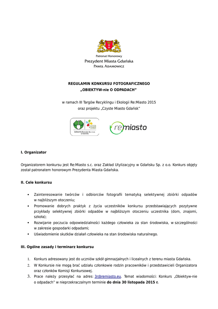 REGULAMIN KONKURSU FOTOGRAFICZNEGO „OBIEKTYW-nie O ODPADACH” w ramach III Targów Recyklingu i Ekologii Re:Miasto 2015 oraz projektu „Czyste Miasto Gdańsk” I. Organizator Organizatorem konkursu jest Re:Miasto s.c. oraz Zakład Utylizacyjny w Gdańsku Sp. z o.o. Konkurs objęty został patronatem honorowym Prezydenta Miasta Gdańska. II. Cele konkursu Zainteresowanie twórców i odbiorców fotografi tematyka selektywnej zbiórki odpadów w najblizszym otoczeniu; Promowanie dobrych praktyk z zycia uczestników konkursu przedstawiajacych pozytywne przykłady selektywnej zbiórki odpadów w najblizszym otoczeniu uczestnika (dom, znajomi, szkoła); Rozwijanie poczucia odpowiedzialnosci kazdego człowieka za stan srodowiska, w szczególnosci w zakresie gospodarki odpadami; Uswiadomienie skutków działań człowieka na stan srodowiska naturalnego. III. Ogolne zasady i terminarz konkursu 1. Konkurs adresowany jest do uczniów szkół gimnazjalnych i licealnych z terenu miasta Gdańska. 2. W Konkursie nie moga brac udziału członkowie rodzin pracowników i przedstawicieli Organizatora oraz członków Komisji Konkursowej. 3. Prace nalezy przesyłac na adres: [email protected]. Temat wiadomosci: Konkurs „Obiektyw-nie o odpadach” w nieprzekraczalnym terminie do dnia 30 listopada 2015 r. 4. Oceny prac dokona Komisja Konkursowa powołana przez Organizatora konkursu. 5. Prace, które nie będa spełniac wymogów regulaminowych, nadesłane po terminie, o którym mowa powyzej, wykonane niesamodzielnie przez uczestników Konkursu, pozbawione opisu lub nieczytelne nie będa oceniane. 6. Rozstrzygnięcie konkursu, wręczenie nagród odbędzie się w Centrum Hewelianum w Gdańsku. Nagrody główne sa przewidziane za I, II i III miejsce. Klasa, do której uczęszcza zwycięzca otrzyma nagrodę dodatkowa w postaci zwiedzenia PGE Areny. Nagrody w konkursie ufundował Zakład Utylizacyjny w Gdańsku Sp. z o.o. 7. Podatek dochodowy od nagród rzeczowych pokrywa Organizator. 8. Laureaci oraz uczestnicy konkursu zostana powiadomieni o terminie wręczenia nagród. 9. Wyniki Konkursu zostana podane do publicznej wiadomosci na stronie internetowej Organizatora: www.remiasto.eu oraz www.zut.com.pl 10. Złozone prace przechodza na własnosc Organizatora. Zgłoszenie prac do konkursu jest równoznaczne z przekazaniem na rzecz Organizatora praw autorskich, o których mowa w art. 50 ustawy z dnia 4 lutego 1994 r. o prawach autorskich i prawach pokrewnych. Organizator zastrzega sobie prawo do nieodpłatnego, wielokrotnego wykorzystania złozonych prac w materiałach informacyjnych dotyczacych konkursu, do realizacji programów edukacyjnych, w wydawanych publikacjach oraz organizowanych wystawach. Administratorem danych osobowych w ramach Konkursu jest Re:Miasto s.c. 11. Zgłoszenie prac do konkursu jest równoznaczne z wyrazeniem zgody na niewyłaczne wykorzystanie praw autorskich do prac nadesłanych do konkursu przez Re:Miasto s.c., Zakład Utylizacyjny w Gdańsku Sp. z o.o., Czyste Miasto Gdańsk, Urzad Miasta w Gdańsku. 12. Zgłoszenie prac do konkursu jest równoznaczne z wyrazeniem zgody na przetwarzanie danych osobowych do celów konkursowych, zgodnie z ustawa z dnia 29 sierpnia 1997r. o ochronie danych osobowych ( Dz.U. z 2001r.Nr 101 poz. 926, z późn. zm.). 13. Zgłoszenie prac do konkursu jest równoznaczne z wyrazeniem zgody na umieszczenie danych w zakresie: imię i nazwisko, miejscowosc, nazwa szkoły, wizerunku (zdjęcia), na stronie internetowej Re:Miasto s.c. , Zakładu Utylizacyjnego w Gdańsku Sp. z o.o., Czyste Miasto Gdańsk, Urzędu Miasta w Gdańsku. 14. Prace po ocenie i ekspozycji nie podlegaja zwrotowi. IV. Wymagania pracy konkursowej 1. Prace konkursowe musza dotyczyc tematyki zwiazanej z ochrona srodowiska, w tym wyłacznie z pozytywnym wpływem selektywnej zbiórki odpadów na najblizsze otoczenie uczestnika. 2. Zdjęcia nie moga zawierac wizerunku osób trzecich. 3. Wymogi dotyczace wszystkich zdjęc sa następujace: wszystkie fotografe zgłaszane na konkurs przyjmowane będa wyłacznie w wersji cyfrowej. rozdzielczosc: min 200 max 300 dpi, wielkosc pojedynczego pliku nie moze przekroczyc 2 MB, format: JPG Organizator oczekuje zdjęc kolorowych, czarno białych, panoramicznych, pejzazy, duzych zblizeń, innych. Dopuszczone sa zdjęcia wykonane dowolnym aparatem fotografcznym. Zdjęcia opatrzone moga byc grafka i komentarzem zwiazanym z tematyka konkursów. plik JPG podpisany powinien byc nazwiskiem z kolejnym numerem fotografi np. Kowalski1, Kowalski2, a nie numerem nadanym przez aparat fotografczny. 4. Pojedyncza praca moze byc wykonana wyłacznie indywidualnie, przez jedna osobę. 5. Kazdy uczestnik moze zgłosic maksymalnie dwie prace konkursowe. Liczba zdjęc w zgłoszonej pracy konkursowej nie powinna przekraczac 6 ujęc. 6. Dopuszczalne formy: reportaz, kolaz, pojedyncze zdjęcie. 7. Kazda pracę nalezy odpowiednio opisac w tresci korespondencji mailowej podajac: Nazwę i adres szkoły, Tytuł zdjęcia (ewentualnie krótki opis) – który w sposób najtrafniejszy opisuje intencje autora, Imię i nazwisko autora, Klasę, wiek autora, Imię i nazwisko szkolnego opiekuna lub rodziców albo opiekunów prawnych autora pracy, Tel. kontaktowy, e-mail do opiekuna autora pracy Oraz zamieszczajac oswiadczenie o tresci: „Wyrażam zgodę na niewyłączne wykorzystanie praw autorskich do zdjęcia/zdjęć, nadesłanych do konkursu fotografcznego „Obiektyw-nie o odpadach” przez Re:Miasto s.c., Zakład Utylizacyjny w Gdańsku Sp. z o.o., Czyste Miasto Gdańsk, Urząd Miasta w Gdańsku. Wyrażam zgodę na przetwarzanie danych osobowych do celów konkursowych, zgodnie z ustawą z dnia 29 sierpnia 1997r. o ochronie danych osobowych ( Dz.U. z 2001r. Nr 101 poz. 926, z późn. zm.). Wyrażam zgodę na umieszczenie danych w zakresie: imię i nazwisko, miejscowość, nazwa szkoły, wizerunku (zdjęcia), na stronie internetowej Re:Miasto s.c. , Zakładu Utylizacyjnego w Gdańsku Sp. z o.o