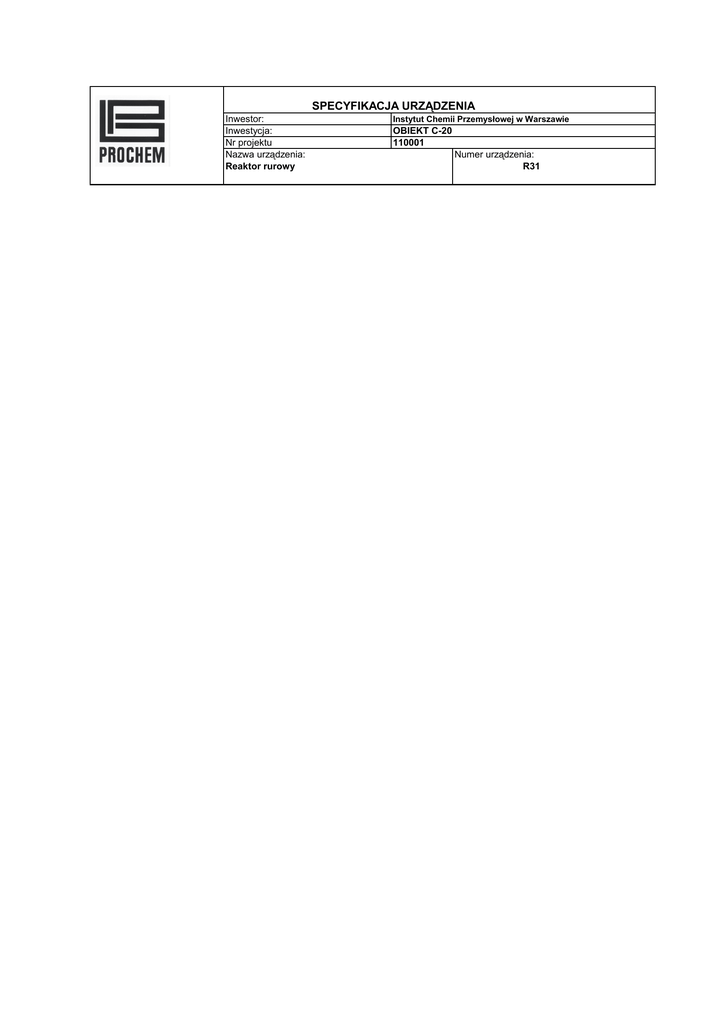 SPECYFIKACJA URZĄDZENIA Inwestor: Inwestycja: Nr projektu Nazwa urządzenia: Reaktor rurowy Instytut Chemii Przemysłowej w Warszawie OBIEKT C-20 110001 Numer urządzenia: R31 SPECYFIKACJA URZĄDZENIA Inwestor: Inwestycja: Nr projektu Nazwa urządzenia: Reaktor rurowy Instytut Chemii Przemysłowej w Warszawie OBIEKT C-20 110001 Numer urządzenia: R31 DANE PROJEKTOWE 1 2 3 4 5 6 7 8 9 10 11 12 13 14 15 16 Iilość: 1 Pozycja (poz./pion): Pionowa Media: Mieszanina akroleiny, aldehydów, tlenu, azotu rurki płaszcz Stan skupienia: płaszcz / rurki Grupa cieczy wg PED (97/23/EC) Klasa zagrożenia: Gęstość: płaszcz / rurki 17 18 19 20 21 21 23 24 25 26 27 28 29 30 31 32 olej OLEX WF 0801 Ciecz / Gaz 1 T+, C,N, F 800 /1,26 kg/m3 Wartość pH: płaszcz / rurki m3/h Przepływ : płaszcz / rurki ~4,5/4,3 Dopuszczalna temp. :płaszcz / rurki 450 / 450 Dopuszczalne ciśnienie: płaszcz / rurki 6,0 / 6,0 Temperatura pracy: płaszcz / rurki max. 350 /400 Ciśnienie pracy: płaszcz / rurki max. 2,0 / 3,0 o C barg o C Temperatura projektowana: płaszcz / rurki 450 / 450 barg o C Ciśnnienie projektowane :płaszcz / rurki 6,0 / 6,0 barg Pojemność całkowita 0,14 m3 Pojemność robocza robocza 0,02 m3 Średnica wewn. płaszcz / rurki ki 200 / 30 Dennica Górna elipsoidalna Dennica Bottom płaska Max. grub. ścian wg wykonawcy Min. grub.ścian mm wg wykonawcy Max poziom mm ~ mm Naddat.n/korozję: 1 Malowanie: mm Nie Izolacja: Materiał: mm Tak wełna mineralna/ blacha AL gr=0,8mm Ogrzewanie: Nie Chłodzenie: Nie Uwaga: Uwagi: 33 34 35 Kategoria urządzenia wg PED - II Aparat pracował będzie w obszarze w strefie 2 zagrożenia wybuchem Ex IIBT4 WYMAGANIA KONSTRUKCYJNE 36 37 38 39 40 41 42 43 44 45 46 47 48 49 50 51 52 53 54 Przepisy konstrukcyjne Dyrektywa ciśnieniowa PED 97/23/CE, normy PN-EN obliczenia wg norm PN-EN Obliczeniowy naddatek na korozję: Odbiór: wg wykonawcy u wykonawcy Dopuszczenia do eksploatacji UDT/ZDT Czynnik sejsmiczny: Nie Obciąż.wiatr./śniegiem: Nie Próba ciśnieniowa: Obróbka cieplna: Tak wg wykonawcy Badania radiograficzne spoin: Inne badania .nieniszczące Tak wg wykonawcy Trawienie i pasywacja Szlifowanie spoin Nie wg wykonawcy Odpr.ładunkuelektrostatycznego. Tak Grubość izolacji: 160 mm Ciężar aparatu.pustego: wg wykonawcy kg Ciężar aparatu podczas .pracy.: wg wykonawcy kg Ciężar aparatu przy próbie.wodnej: wg wykonawcy kg Wsp.spawania: min 0,9 55 56 57 58 59 60 61 62 63 64 65 66 67 68 69 70 71 Część mm Material Płaszcz 316L EN-10216-3 Dennica 316L PN-75/M-35412 Kołnierze 316L EN-1092-1 Podpory 316L EN-10028-3 Rurki 316L EN-10216-3 Kołn.króćców. 316L EN-1092-1 Rury króćców Sruby/nakr zew Sruby/nakr wewn 316L EN-10216-3 stal stopowa EN-1515-1 stal stopowa EN-1515-1 Uszczelki zewn. SPETOMET MWK10 EN-1514-1 Uszczelki wewn. SPETOMET MWK10 EN-1514-1 Żurawik nie dotyczy Tabliczka znamionowa. stal nierdz. wg wykon. Uchwyty do transportu stal nierdz. wg wykon. Uchwyt uziemienia stal nierdz. wg wykon. Uchwyty izolacji stal nierdz. wg wykon. Nazwisko Data Rewizja: 0 /Wyk. K.Rębelski 09.2013 Nr dokumentu: 02-T-051 Spr. A.Gendek 09.2013 Zatw. Uwagi Strona: 2/3 SPECYFIKACJA URZĄDZENIA Inwestor: Inwestycja: Nr projektu Nazwa urządzenia: Reaktor rurowy Instytut Chemii Przemysłowej w Warszawie OBIEKT C-20 110001 Numer urządzenia: R31 72 73 74 75 76 Śruby. kotwiące Tak Demister Nie dotyczy Drabiny, pomosty Nie dotyczy UWAGI: 77 78 79 80 TABELA KROĆCÓW Symbol/ Przeznaczenie DN/PN Norma Oznaczenie 81 82 83 84 85 86 87 88 89 90 91 Typ Rodzaj kołnierza przylgi Uwagi K1 Wlot oparów 40/10 PN-EN 1092-1 11 C K2 Wylot oparów 40/10 PN-EN 1092-1 11 C K3 Wlot medium grzewczego 11 C K4 Wylot medium grzewczego 40/10 PN-EN 1092-1 PN-EN 1092-1 40/10 11 C K5 Odpowietrzenie 10/10 K6 Spust cieczy 10/10 wg wykonawcy 6/6 wg rysunku założ. K7 - K8 K9 Pomiar temperatury Wlot powietrza 15/10 wg wykonawcy PN-EN 1092-1 11 C DOKUMENTY WYMAGANE 92 93 94 95 96 97 98 99 100 101 102 103 104 105 106 107 Harmonogram dostaw TAK Rysunki wykonawcze z tabelą króćców oraz warunkami wykonania i odbioru aparatu, momenty dokręcenia śrub TAK Specyfikacja materiałów podstawowych i spawalniczych TAK Rysunek tabliczki znamionowej TAK Instrukcje technologiczne spawania, procedury badań i kwalifikacji jakości spoin , certyfikaty spawaczy i nadzoru TAK Plan badań nieniszczących TAK Obliczenia ciśnieniowe aparatu TAK Certyfikaty materiałów podstawowych i spawalniczych TAK Raprot z badań nieniszczących TAK Certyfikat , protokół z próby ciśnieniowej urządzeńia, dokumentacja dozorowa TAK Certyfikat zgodności z dyrektywami / deklaracja CE TAK Istrukcja obsługi TAK Wykaz części zapasowych TAK Nazwisko Data Rewizja: 0 Wyk. K.Rębelski 09.2013 Nr dokumentu: 02-T-051 Spr. A.Gendek 09.2013 Zatw. Strona: 3/3