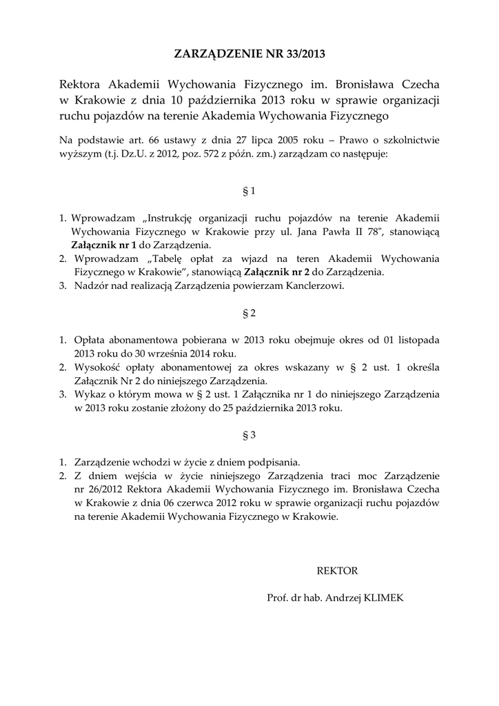 ZARZĄDZENIE NR 33/2013 Rektora Akademii Wychowania Fizycznego im. Bronisława Czecha w Krakowie z dnia 10 października 2013 roku w sprawie organizacji ruchu pojazdów na terenie Akademia Wychowania Fizycznego Na podstawie art. 66 ustawy z dnia 27 lipca 2005 roku – Prawo o szkolnictwie wyższym (t.j. Dz.U. z 2012, poz. 572 z późn. zm.) zarządzam co następuje: §1 1. Wprowadzam „Instrukcję organizacji ruchu pojazdów na terenie Akademii Wychowania Fizycznego w Krakowie przy ul. Jana Pawła II 78", stanowiącą Załącznik nr 1 do Zarządzenia. 2. Wprowadzam „Tabelę opłat za wjazd na teren Akademii Wychowania Fizycznego w Krakowie”, stanowiącą Załącznik nr 2 do Zarządzenia. 3. Nadzór nad realizacją Zarządzenia powierzam Kanclerzowi. §2 1. Opłata abonamentowa pobierana w 2013 roku obejmuje okres od 01 listopada 2013 roku do 30 września 2014 roku. 2. Wysokość opłaty abonamentowej za okres wskazany w § 2 ust. 1 określa Załącznik Nr 2 do niniejszego Zarządzenia. 3. Wykaz o którym mowa w § 2 ust. 1 Załącznika nr 1 do niniejszego Zarządzenia w 2013 roku zostanie złożony do 25 października 2013 roku. §3 1. Zarządzenie wchodzi w życie z dniem podpisania. 2. Z dniem wejścia w życie niniejszego Zarządzenia traci moc Zarządzenie nr 26/2012 Rektora Akademii Wychowania Fizycznego im. Bronisława Czecha w Krakowie z dnia 06 czerwca 2012 roku w sprawie organizacji ruchu pojazdów na terenie Akademii Wychowania Fizycznego w Krakowie. REKTOR Prof. dr hab. Andrzej KLIMEK Załącznik nr 1 do Zarządzenia Nr 33/2013 z dnia 10 października 2013r. INSTRUKCJA ORGANIZACJI RUCHU POJAZDÓW NA TERENIE AKADEMII WYCHOWANIA FIZYCZNEGO W KRAKOWIE UL. JANA PAWŁA II 78 §1 SŁOWNIK POJĘĆ: 1. TEREN UCZELNI – wydzielony obszar zabudowany, z drogami wewnętrznymi należący do Akademii Wychowania Fizycznego w Krakowie; 2. RUCH POJAZDÓW – na drogach wewnętrznych Uczelni dozwolony jest wyłącznie dla pojazdów upoważnionych; 3. POJAZDY UPOWAŻNIONE – pojazdy osób i instytucji, które otrzymały zgodę na wjazd na teren AWF, a także pojazdy uprzywilejowane, taksówki oraz pojazdy inwalidów; 4. PORUSZANIE się po drogach wewnętrznych odbywa się zgodnie z oznakowaniem oraz zasadami ruchu drogowego; 5. PARKOWANIE POJAZDÓW – dozwolone jest wyłącznie na oznaczonych parkingach wewnętrznych; 6. PARKINGI WEWNĘTRZNE – są dostępne dla pojazdów upoważnionych; 7. PARKING GŁÓWNY ZEWNĘTRZNY – ogólnodostępny; 8. OPŁATA ABONAMENTOWA – opłata ponoszona przez upoważnionych do wjazdu na teren Uczelni obowiązująca w okresie od 01 października do 30 września następnego roku. §2 INFORMACJE OGÓLNE: 1. Wszystkie jednostki organizacyjne Uczelni w terminie do 10 września każdego roku, złożą w Dziale Administracji Gospodarki Materiałowej i Zaopatrzenia wykaz: 1) pracowników, którzy posiadają zgodę na wykorzystanie samochodów dla celów służbowych; 2) pracowników, których wjazd na teren Uczelni uzasadniają względy służbowe; 3) kontrahentów współpracujących z AWF; 4) służb usługowo-komunalnych. 2. Biuro Rektora przedstawi listę osób uprawnionych do wjazdu pod wejście główne. 3. Dział Administracji Gospodarki Materiałowej i Zaopatrzenia sporządzi zbiorczy wykaz osób i instytucji, o których mowa w ust. 1 i przedstawi do zatwierdzenia Kanclerzowi. 4. Kanclerz zatwierdzi listę osób i instytucji upoważnionych do wjazdu: 1) pod wejście główne Uczelni; 2 2) od strony ul. Wysockiej; 3) od strony ul. Nowohuckiej. 5. Samochody uprzywilejowane udające się na teren AWF w związku z wypadkiem, pożarem lub zaistniałym zdarzeniem nadzwyczajnym mają prawo wjazdu bez potrzeby okazywania dokumentu uprawniającego. 6. Dział Administracji Gospodarki Materiałowej i Zaopatrzenia zorganizuje i zapewni całodobowy nadzór nad działalnością systemu. 7. Wjazd na teren AWF dozwolony jest na podstawie ważnego identyfikatora pojazdu. 8. Każdy wjeżdżający na teren Uczelni samochód powinien mieć obowiązujący identyfikator z hologramem umieszczony w miejscu widocznym z zewnątrz. 9. Upoważnieni pracownicy AWF otrzymają wraz z identyfikatorami numer dostępowy. 10. Wjazd na teren AWF odbywać się będzie poprzez wywołanie numeru dostępowego z prywatnego tel. komórkowego z zarejestrowanym uprzednio jego numerem w bazie. 11. Wyjazd z terenu AWF odbywać się będzie poprzez najechanie pojazdu na pętlę magnetyczną. 12. Identyfikatory wraz z numerem dostępowym będą rozprowadzane przez Dział Administracji Gospodarki Materiałowej i Zaopatrzenia. 13. Baza danych będzie prowadzona przez Dział Administracji Gospodarki Materiałowej i Zaopatrzenia zgodnie z przepisami ustawy o ochronie danych osobowych i przekazywana Kierownikowi Działu Informatyzacji Uczelni do aktualizacji. 14. Odstępowanie identyfikatora i numeru dostępowego innym osobom jest niedopuszczalne. 15. Otrzymanie identyfikatora umożliwiającego wjazd nie jest jednoznaczne z zapewnieniem miejsca do parkowania na terenie AWF. 16. W przypadku imprez organizowanych na terenie AWF ustalone będą odrębne zasady organizacji ruchu pojazdów. §3 SYSTEM KONTROLOWANEGO RUCHU POJAZDÓW NA TERENIE AWF 1. WJAZD POD WEJŚCIE GŁÓWNE UCZELNI Instaluje się na drodze dojazdowej do wejścia głównego oraz na drodze wyjazdowej, szlabany. Dojazd do wejścia głównego oraz parkowanie dozwolone jest wyłącznie: dla pojazdów upoważnionych znajdujących się na liście, o której mowa w § 2 ust. 4, pkt. l instrukcji, a także pojazdów uprzywilejowanych, taksówek oraz pojazdów inwalidów. Sterowanie pracą szlabanów realizowane będzie za pomocą systemu radiowego, gdzie wjazd i wyjazd na teren AWF odbywać się będzie za pomocą istniejących pilotów. Podnoszenie szlabanu sterowane będzie sygnałem z pilota radiowego, natomiast opuszczanie na 3 podstawie sygnału wypracowanego przez fotokomórkę. Pojazdy upoważnione nie posiadające pilota wpuszczane będą prz