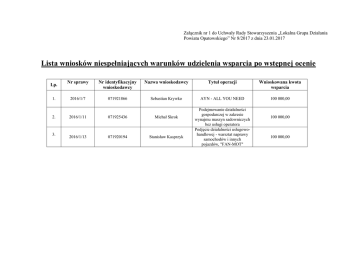 Załącznik nr 1 do Uchwały Rady Stowarzyszenia „Lokalna Grupa Działania Powiatu Opatowskiego” Nr 8/2017 z dnia 23.01.2017 Lista wniosków niespełniających warunków udzielenia wsparcia po wstępnej ocenie Lp. 1. 2. 3. Nr sprawy Nr identyfikacyjny wnioskodawcy Nazwa wnioskodawcy Tytuł operacji Wnioskowana kwota wsparcia 2016/1/7 071921866 Sebastian Krywko AYN - ALL YOU NEED 100 000,00 2016/1/11 071925436 Michał Skrok 2016/1/13 071920194 Stanisław Kasprzyk Podejmowanie działalności gospodarczej w zakresie wynajmu maszyn sadowniczych bez usługi operatora Podjęcie działalności usługowohandlowej - warsztat naprawy samochodów i innych pojazdów, "FAN-MOT" 100 000,00 100 000,00 Załącznik nr 2 do Uchwały Rady Stowarzyszenia „Lokalna Grupa Działania Powiatu Opatowskiego” Nr 8/2017 z dnia 23.01.2017 Lista wniosków spełniających warunki udzielenia wsparcia po wstępnej ocenie Lp. 1. 2. Nr sprawy 2016/1/1 2016/1/2 Nr identyfikacyjny wnioskodawcy 071868626 071891586 Nazwa wnioskodawcy Tytuł operacji Katarzyna Bińczak Zakup busa celem uruchomienia działalności gospodarczej w zakresie świadczenia usług krajowego i międzynarodowego przewozu osób 100 000,00 Halina Schulz PODJĘCIE DZIAŁALNOŚCI GOSPODARCZEJ W ZAKRESIE USŁUG TRANSPORTOWYCH HALINA SCHULZ "HALINA" 100 000,00 100 000,00 100 000,00 3. 2016/1/3 071810621 Bartosz Rozmysłowski Utworzenie warsztatu samochodowego w tym rozbudowa i przebudowa istniejącego budynku gospodarczo-garażowego oraz zakup maszyn 4. 2016/1/4 071920516 Kamil Rosowski Utworzenie warsztatu naprawy pojazdów w miejscowości Bidziny Wnioskowana kwota wsparcia 5. 2016/1/5 071873054 Piotr Kolasa Utworzenie firmy handlowo usługowej w zakresie sprzedaży kamienia ogrodowego i drewna opałowego 100 000,00 100 000,00 6. 2016/1/6 071901900 Kinga Dorociak PODJĘCIE DZIAŁALNOŚCI GOSPODARCZEJ W ZAKRESIE USŁUG TRANSPORTOWYCH ANKIN TRANS 7. 2016/1/9 071919496 Daniel Safian Podejmowanie działalnosci gospodarczej na terenie Lokalnej Grupy Działania 100 000,00 100 000,00 8. 2016/1/10 071862382 Mariusz Jopek Założenie działalności gospodarczej pozwalającej na oferowanie usług turystycznonoclegowych oraz propagowanie zdrowego i ekologicznego trybu życia 9. 2016/1/12 071917820 Paweł Zalewski Podejmowanie działalności gospodarczej w zakresie dociepleń budynków 100 000,00 10. 2016/1/14 070178572 Olga Grudniewska Podjęcie działalności: Sklep spożywczo-przemysłowy Olga Grudniewska 100 000,00 11. 2016/1/15 025290740 Paweł Stanisław Urban "Firma własna-przyszłość jasna" - mobilne usługi tartaczne 100 000,00