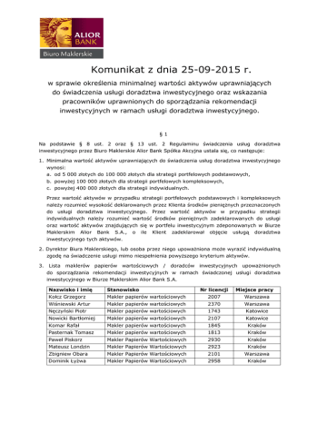 Komunikat z dnia 25-09-2015 r. w sprawie określenia minimalnej wartości aktywów uprawniających do świadczenia usługi doradztwa inwestycyjnego oraz wskazania pracowników uprawnionych do sporządzania rekomendacji inwestycyjnych w ramach usługi doradztwa inwestycyjnego. §1 Na podstawie § 8 ust. 2 oraz § 13 ust. 2 Regulaminu świadczenia usług doradztwa inwestycyjnego przez Biuro Maklerskie Alior Bank Spółka Akcyjna ustala się, co następuje: 1. Minimalna wartość aktywów uprawniających do świadczenia usług doradztwa inwestycyjnego wynosi: a. od 5 000 złotych do 100 000 złotych dla strategii portfelowych podstawowych, b. powyżej 100 000 złotych dla strategii portfelowych kompleksowych, c. powyżej 400 000 złotych dla strategii indywidualnych. Przez wartość aktywów w przypadku strategii portfelowych podstawowych i kompleksowych należy rozumieć wysokość deklarowanych przez Klienta środków pieniężnych przeznaczonych do usługi doradztwa inwestycyjnego. Przez wartość aktywów w przypadku strategii indywidualnych należy rozumieć wartość środków pieniężnych zadeklarowanych do usługi oraz wartość aktywów znajdujących się w portfelu inwestycyjnym zdeponowanych w Biurze Maklerskim Alior Bank S.A., o ile Klient zadeklarował objęcie usługą doradztwa inwestycyjnego tych aktywów. 2. Dyrektor Biura Maklerskiego, lub osoba przez niego upoważniona może wyrazić indywidualną zgodę na świadczenie usługi mimo niespełnienia powyższego kryterium aktywów. 3. Lista maklerów papierów wartościowych / doradców inwestycyjnych upoważnionych do sporządzania rekomendacji inwestycyjnych w ramach świadczonej usługi doradztwa inwestycyjnego w Biurze Maklerskim Alior Bank S.A. Nazwisko i imię Stanowisko Kołcz Grzegorz Makler papierów wartościowych Nr licencji 2007 Miejsce pracy Warszawa Wiśniewski Artur Makler papierów wartościowych 2370 Warszawa Nęczyński Piotr Makler papierów wartościowych 1743 Katowice Nowicki Bartłomiej Makler papierów wartościowych 2107 Katowice Komar Rafał Makler papierów wartościowych 1845 Kraków Pasternak Tomasz Makler papierów wartościowych 1813 Kraków Paweł Piskorz Makler Papierów Wartościowych 2930 Kraków Mateusz Londzin Makler Papierów Wartościowych 2923 Kraków Zbigniew Obara Makler Papierów Wartościowych 2101 Warszawa Dominik Łyżwa Makler Papierów Wartościowych 2958 Kraków §2 Przestaje obowiązywać Komunikat z dnia 3 września 2015 roku w sprawie określenia minimalnej wartości aktywów uprawniających do świadczenia usługi doradztwa inwestycyjnego oraz wskazania pracowników uprawnionych do sporządzania rekomendacji inwestycyjnych w ramach usługi doradztwa inwestycyjnego. §3 Komunikat wchodzi w życie z dniem 25 września 2015 roku. Krzysztof Polak Dyrektor Biura Maklerskiego Alior Bank S.A