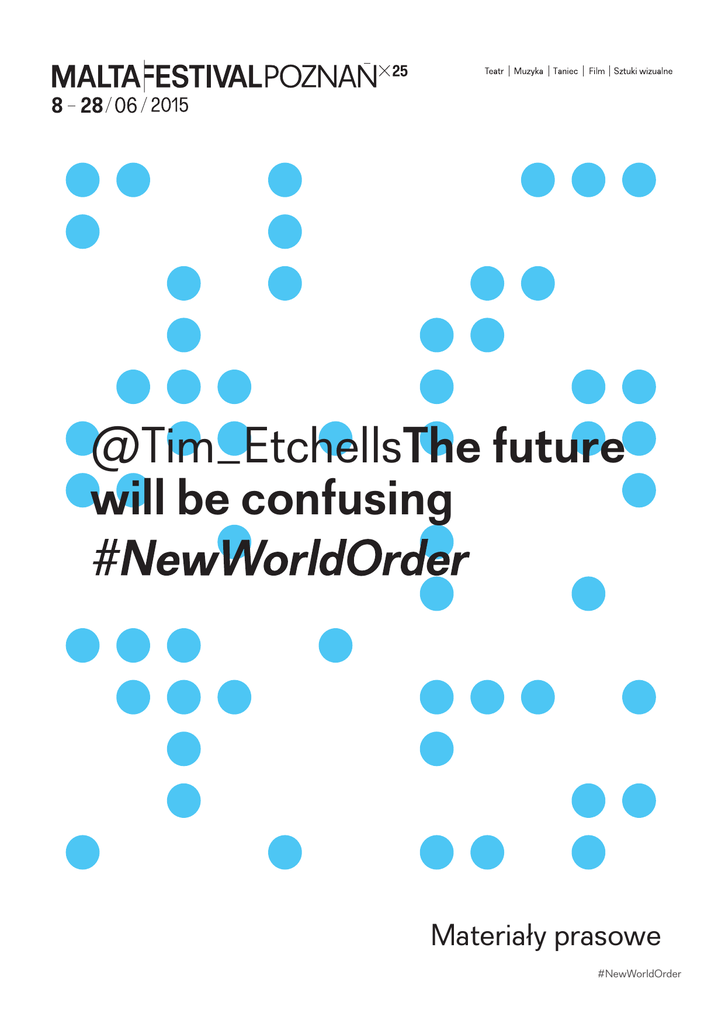 @Tim_EtchellsThe future will be confusing Materiały prasowe ∆NewWorldOrder Tim Etchells kurator Idiomu ∆NewWorldOrder Gdy zacząłem zastanawiać się nad Idiomem Nowy Ład Światowy / New World Order uderzyło mnie współistnienie dwóch, bezpośrednio z nim powiązanych linii tematycznych. pomóc postrzegać i odkrywać świat na nowe sposoby. Chodzi tu nie tyle o obserwowanie zmieniającego się świata, ile o zmianę sposobu percepcji, ram, w jakich go postrzegamy i rozumiemy. Pierwsza z nich to wielość sposobów, w jakich używa się tego sformułowania, żeby opisać gwałtowne zmiany dokonujące się w społecznej i politycznej rzeczywistości końca XX i początku XXI wieku. Nowy Ład Światowy łączy się nie tylko ze zwrotem paradygmatu w stosunkach międzynarodowych – od Gorbaczowa i G. H. W. Busha wprowadzających erę post-sowiecką, poprzez pierwszą i drugą wojnę Odnosząc się do tych dwóch impulsów, stworzyłem z Kasią Tórz program Idiomu festiwalowego, który spogląda jednocześnie w przeszłość i w przyszłość. Analizuje konkretne sytuacje, historie zmian i transformacji, a zarazem patrzy w przyszłość – w kierunku, w którym podążamy, ku czekającym na nas wyzwaniom i możliwym rozwiązaniom. w Zatoce Perskiej, 11 września, wojnę z terroryzmem, wkroczenie dżihadyzmu na arenę międzynarodową, aż po zrywy i stłumienie Arabskiej Wiosny. Jednocześnie sformułowanie odzwierciedla inne burzliwe zmiany, które objęły większość, jeśli nie cały świat: rozwijające się narracje o nieuchronnej katastrofie ekologicznej spowodowanej ociepleniem klimatu i wyczerpującymi się zasobami naturalnymi, politykę oszczędności wywołaną kryzysem systemu bankowego, spowolnienie gospodarcze i niepokoje w strefie euro, a także zmiany technologiczne, które w różny sposób zreorganizowały naszą pracę, czas wolny, politykę, handel i przestrzeń społeczną (od mediów cyfrowych, serwisów społecznościowych, po wielkie bazy danych, globalizację i inwigilację elektroniczną). Nie twierdzę, że wybrane przeze mnie prace wyczerpują wszystkie te tematy i tendencje, ale jestem pewien, że owe niespokojne ruchy, nurty transformacji będą rezonować w tle, nadając programowi Idiomu mocy, że będą stawiać pytania: jak teatr może nam pomóc w mapowaniu i zrozumieniu tej przestrzeni pozostającej w stanie ciągłych zmian? jak może nam pomóc się w niej poruszać? Moim drugim impulsem było rozważenie koncepcji „nowego ładu światowego” z zupełnie innej strony, nie tyle z perspektywy społecznej i politycznej, co filozoficznej, w szczególności w kontekście tego, jak sztuka może nam Biogram Tima Etchellsa na malta-festival.pl W tym „nowym ładzie światowym” przyszłość jest obszarem niepewnym, zarówno w wymiarze jednostkowym, jak i w szerszym, geo-politycznym i socjo-ekonomicznym. Prace będące częścią Idiomu nie przynoszą rozwiązań dla tej niepewności, myślę jednak, że w sposób nowatorski, zabawny, refleksyjny, surowy, ambitny i zaskakujący pomagają w rozpoznaniu i zrozumieniu terytorium, na którym żyjemy. Tim Etchells jest kuratorem Idiomu Nowy Ład Światowy / New World Order. Jego twórczość będzie obecna na Malta Festival Poznań w kilku odsłonach. Razem z Forced Entertainment zaprezentuje dwa spektakle The Notebook i Tomorrow’s Parties. Specjalnie na zamówienie festiwalu przygotuje również neon, który pojawi się na budynku poznańskiej Starej Rzeźni i poprowadzi warsztaty mistrzowskie pt. To Begin / To Go On / To The End.. W czerwcu nakładem Fundacji Malta i wydawnictwa ha!art ukaże się książka pt. Tak jakby nic się nie wydarzyło. Teatr Forced Entertainment pod redakcją Tima Etchellsa i Katarzyny Tórz. ∆NewWorldOrder Forced Entertainment @Tomasz_Plata To nie są spektakle, które opowiadają historie. Nie ekscytują widza nadmiernie rozbudowanymi obrazami teatralnymi. Chodzi raczej o wciągnięcie go w specyficzną, przewrotną, inteligentną, zabarwioną brytyjskim humorem interakcję, grę. @Piotr_Gruszczyński To teatr nastawiony na przypadkowość tego, co może wydarzyć się na scenie, tego, co może wyjść od widowni i wreszcie tego, co może odmienić przebieg spektaklu. @Stefan_Kaegi Do Berlina przyjechało także Forced Entertainment ze spektaklem Pleasure. Niemiecka widownia nie była wtedy oswojona z estetyką brytyjskiego teatru. Mój ówczesny szef był asystentem produkcji. Postanowił wyczyścić wszystkie brudne butelki, które zalegały na scenie. Pół godziny później na scenę wkroczył Tim Etchells z pytaniem: gdzie są moje butelki?! Musiałem potem osobiście wybrać brudne butelki z kontenera na śmieci. @Sven_Åge_Birkeland Forced Entertainment stworzyli kompletnie nowy krajobraz tetralny Europy: robią rzeczy, których nie sposób pomylić z inną grupą, są jedyni w swoim rodzaju. Inspirują nie tylko ludzi teatru. Grupa Forced Entertainment (ang. „przymusowa rozrywka") powstała w 1984 r. i szybko stała się legendą brytyjskiego teatru. Podczas Malta Festival Poznań 2015 zobaczymy dwa spektakle zespołu: The Notebook i Tomorrow's Parties. Dyrektorem artystycznym i liderem zespołu jest Tim Etchells. ∆NewWorldOrder Idiom ∆NewWorldOrder TIM ETCHELLS Never sleep 8-28 czerwca SCHWALBE Schwalbe is looking for crowds 20, 21 czerwca W nawiązaniu do Idiomu New World Order / Nowy Ład Światowy Tim Etchells przygotowuje neon, który zostanie umieszczony przy wejściu do Starej Rzeźni i stanie się jednym z projektów towarzyszących mieszkańcom miasta podczas festiwalu. Neony są ważną częścią twórczości Etchellsa. Charakteryzują się prostotą wizualną, humorem i ironią, emitują wieloznaczny komunikat skłaniający do refleksji nad własnym położeniem w świecie. Schwalbe tworzą młodzi absolwenci sztuki mimu w Amsterdam College for the Arts zafascynowani teatrem fizycznym. Ich spektakl podejmuje temat potrzeby i pragnienia b