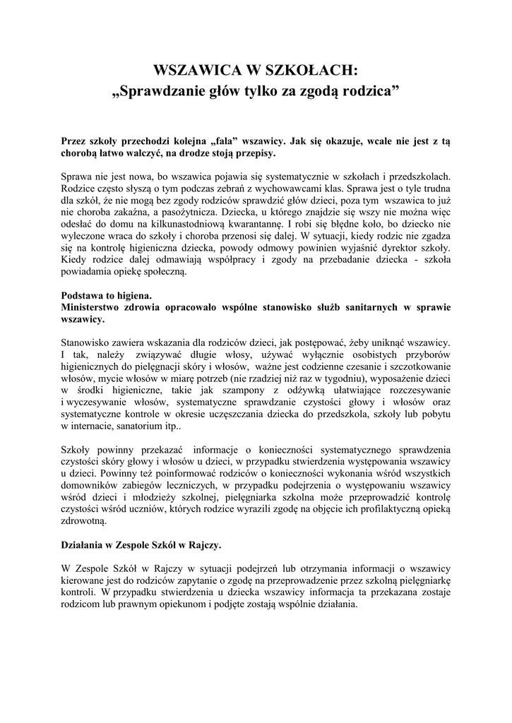WSZAWICA W SZKOŁACH: „Sprawdzanie głów tylko za zgodą rodzica” Przez szkoły przechodzi kolejna „fala” wszawicy. Jak się okazuje, wcale nie jest z tą chorobą łatwo walczyć, na drodze stoją przepisy. Sprawa nie jest nowa, bo wszawica pojawia się systematycznie w szkołach i przedszkolach. Rodzice często słyszą o tym podczas zebrań z wychowawcami klas. Sprawa jest o tyle trudna dla szkół, że nie mogą bez zgody rodziców sprawdzić głów dzieci, poza tym wszawica to już nie choroba zakaźna, a pasożytnicza. Dziecka, u którego znajdzie się wszy nie można więc odesłać do domu na kilkunastodniową kwarantannę. I robi się błędne koło, bo dziecko nie wyleczone wraca do szkoły i choroba przenosi się dalej. W sytuacji, kiedy rodzic nie zgadza się na kontrolę higieniczna dziecka, powody odmowy powinien wyjaśnić dyrektor szkoły. Kiedy rodzice dalej odmawiają współpracy i zgody na przebadanie dziecka - szkoła powiadamia opiekę społeczną. Podstawa to higiena. Ministerstwo zdrowia opracowało wspólne stanowisko służb sanitarnych w sprawie wszawicy. Stanowisko zawiera wskazania dla rodziców dzieci, jak postępować, żeby uniknąć wszawicy. I tak, należy związywać długie włosy, używać wyłącznie osobistych przyborów higienicznych do pielęgnacji skóry i włosów, ważne jest codzienne czesanie i szczotkowanie włosów, mycie włosów w miarę potrzeb (nie rzadziej niż raz w tygodniu), wyposażenie dzieci w środki higieniczne, takie jak szampony z odżywką ułatwiające rozczesywanie i wyczesywanie włosów, systematyczne sprawdzanie czystości głowy i włosów oraz systematyczne kontrole w okresie uczęszczania dziecka do przedszkola, szkoły lub pobytu w internacie, sanatorium itp.. Szkoły powinny przekazać informacje o konieczności systematycznego sprawdzenia czystości skóry głowy i włosów u dzieci, w przypadku stwierdzenia występowania wszawicy u dzieci. Powinny też poinformować rodziców o konieczności wykonania wśród wszystkich domowników zabiegów leczniczych, w przypadku podejrzenia o występowaniu wszawicy wśród dzieci i młodzieży szkolnej, pielęgniarka szkolna może przeprowadzić kontrolę czystości wśród uczniów, których rodzice wyrazili zgodę na objęcie ich profilaktyczną opieką zdrowotną. Działania w Zespole Szkół w Rajczy. W Zespole Szkół w Rajczy w sytuacji podejrzeń lub otrzymania informacji o wszawicy kierowane jest do rodziców zapytanie o zgodę na przeprowadzenie przez szkolną pielęgniarkę kontroli. W przypadku stwierdzenia u dziecka wszawicy informacja ta przekazana zostaje rodzicom lub prawnym opiekunom i podjęte zostają wspólnie działania.