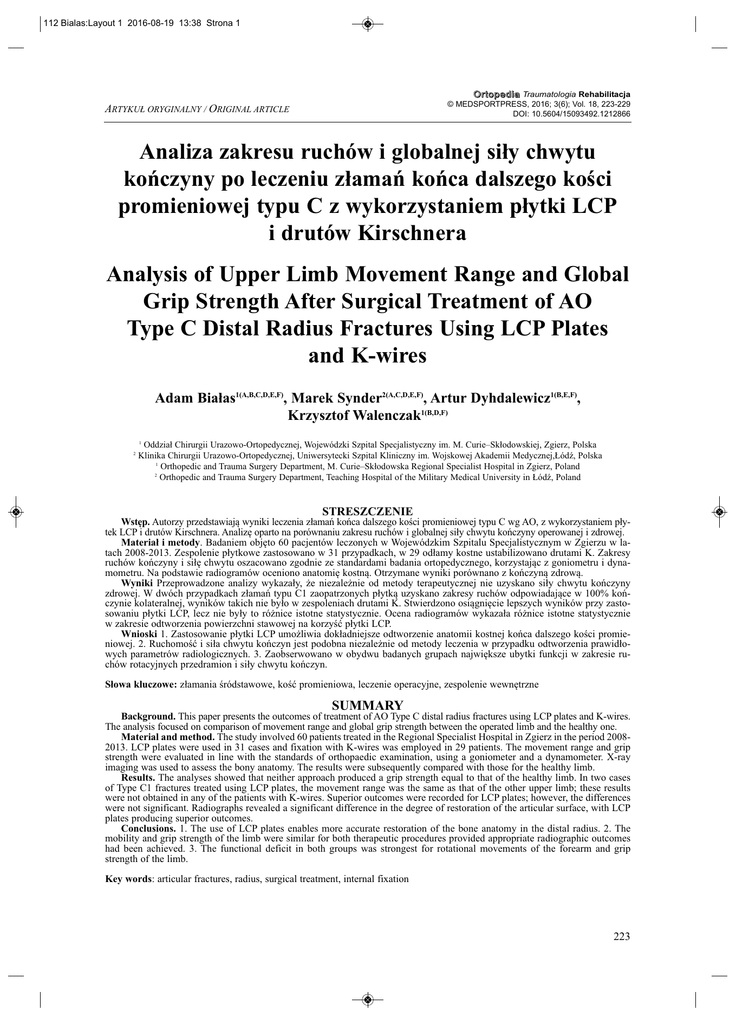 112 Bialas:Layout 1 2016-08-19 13:38 Strona 1 O r t o p e d i a Traumatologia Rehabilitacja © MEDSPORTPRESS, 2016; 3(6); Vol. 18, 223-229 DOI: 10.5604/15093492.1212866 ARTYKUŁ ORYGINALNY / ORIGINAL ARTICLE Analiza zakresu ruchów i globalnej siły chwytu kończyny po leczeniu złamań końca dalszego kości promieniowej typu C z wykorzystaniem płytki LCP i drutów Kirschnera Analysis of Upper Limb Movement Range and Global Grip Strength After Surgical Treatment of AO Type C Distal Radius Fractures Using LCP Plates and K-wires Adam Białas1(A,B,C,D,E,F), Marek Synder2(A,C,D,E,F), Artur Dyhdalewicz1(B,E,F), Krzysztof Walenczak1(B,D,F) 2 1 Oddział Chirurgii Urazowo-Ortopedycznej, Wojewódzki Szpital Specjalistyczny im. M. Curie–Skłodowskiej, Zgierz, Polska Klinika Chirurgii Urazowo-Ortopedycznej, Uniwersytecki Szpital Kliniczny im. Wojskowej Akademii Medycznej,Łódź, Polska 1 Orthopedic and Trauma Surgery Department, M. Curie–Skłodowska Regional Specialist Hospital in Zgierz, Poland 2 Orthopedic and Trauma Surgery Department, Teaching Hospital of the Military Medical University in Łódź, Poland STRESZCZENIE Wstęp. Autorzy przedstawiają wyniki leczenia złamań końca dalszego kości promieniowej typu C wg AO, z wykorzystaniem płytek LCP i drutów Kirschnera. Analizę oparto na porównaniu zakresu ruchów i globalnej siły chwytu kończyny operowanej i zdrowej. Materiał i metody. Badaniem objęto 60 pacjentów leczonych w Wojewódzkim Szpitalu Specjalistycznym w Zgierzu w latach 2008-2013. Zespolenie płytkowe zastosowano w 31 przypadkach, w 29 odłamy kostne ustabilizowano drutami K. Zakresy ruchów kończyny i siłę chwytu oszacowano zgodnie ze standardami badania ortopedycznego, korzystając z goniometru i dynamometru. Na podstawie radiogramów oceniono anatomię kostną. Otrzymane wyniki porównano z kończyną zdrową. Wyniki Przeprowadzone analizy wykazały, że niezależnie od metody terapeutycznej nie uzyskano siły chwytu kończyny zdrowej. W dwóch przypadkach złamań typu C1 zaopatrzonych płytką uzyskano zakresy ruchów odpowiadające w 100% kończynie kolateralnej, wyników takich nie było w zespoleniach drutami K. Stwierdzono osiągnięcie lepszych wyników przy zastosowaniu płytki LCP, lecz nie były to różnice istotne statystycznie. Ocena radiogramów wykazała różnice istotne statystycznie w zakresie odtworzenia powierzchni stawowej na korzyść płytki LCP. Wnioski 1. Zastosowanie płytki LCP umożliwia dokładniejsze odtworzenie anatomii kostnej końca dalszego kości promieniowej. 2. Ruchomość i siła chwytu kończyn jest podobna niezależnie od metody leczenia w przypadku odtworzenia prawidłowych parametrów radiologicznych. 3. Zaobserwowano w obydwu badanych grupach największe ubytki funkcji w zakresie ruchów rotacyjnych przedramion i siły chwytu kończyn. Słowa kluczowe: złamania śródstawowe, kość promieniowa, leczenie operacyjne, zespolenie wewnętrzne SUMMARY Background. This paper presents the outcomes of treatment of AO Type C distal radius fractures using LCP plates and K-wires. The analysis focused on comparison of movement range and global grip strength between the operated limb and the healthy one. Material and method. The study involved 60 patients treated in the Regional Specialist Hospital in Zgierz in the period 20082013. LCP plates were used in 31 cases and fixation with K-wires was employed in 29 patients. The movement range and grip strength were evaluated in line with the standards of orthopaedic examination, using a goniometer and a dynamometer. X-ray imaging was used to assess the bony anatomy. The results were subsequently compared with those for the healthy limb. Results. The analyses showed that neither approach produced a grip strength equal to that of the healthy limb. In two cases of Type C1 fractures treated using LCP plates, the movement range was the same as that of the other upper limb; these results were not obtained in any of the patients with K-wires. Superior outcomes were recorded for LCP plates; however, the differences were not significant. Radiographs revealed a significant difference in the degree of restoration of the articular surface, with LCP plates producing superior outcomes. Conclusions. 1. The use of LCP plates enables more accurate restoration of the bone anatomy in the distal radius. 2. The mobility and grip strength of the limb were similar for both therapeutic procedures provided appropriate radiographic outcomes had been achieved. 3. The functional deficit in both groups was strongest for rotational movements of the forearm and grip strength of the limb. Key words: articular fractures, radius, surgical treatment, internal fixation 223 112 Bialas:Layout 1 2016-08-19 13:38 Strona 2 Białas A. i wsp. Wyniki leczenia złamań końca dalszego kości promieniowej typu C WSTĘP BACKGROUND Złamania końca dalszego kości promieniowej są jednym z najczęstszych uszkodzeń w obrębie kończyny górnej. Stanowią one około 20% wszystkich złamań zaopatrywanych w oddziałach szpitalnych i poradniach ortopedycznych, wykazując tendencję wzrostową [1-3]. W leczeniu tego typu urazu nie mamy jednoznacznych standardów postępowania. Doświadczenie chirurga i możliwości techniczne dostosowane do typu złamania mają na celu przywrócenie prawidłowych stosunków anatomicznych oraz zakresu ruchów kończyny sprzed urazu, potrzebnej w życiu zawodowym i codziennym. W naszym oddziale w zaopatrzeniu śródstawowych złamań dalszego końca kości promieniowej typu C wg AO, stosowaliśmy druty Kirschnera oraz płytki LCP o małym kontakcie z tkanką kostną. Celem pracy była ocena porównawcza wyników leczenia operacyjnego obu metod, na podstawie analizy zakresu ruchów i globalnej siły chwytu operowanej kończyny w porównaniu z kończyną zdrową. Distal radius fractures are among the most common injuries to the upper limb. They represent approximately 20% of all fractures treated in hospit