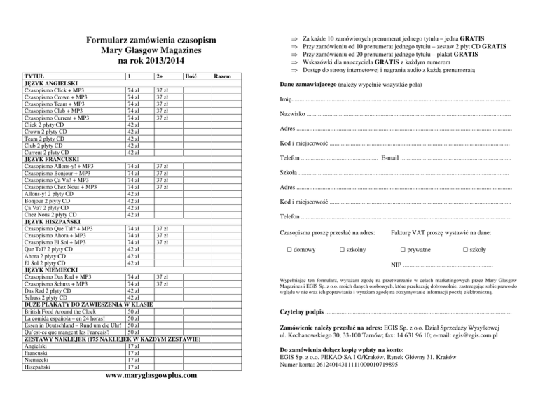 Formularz zamówienia czasopism Mary Glasgow Magazines na rok 2013/2014 TYTUŁ 1 2+ Ilość JĘZYK ANGIELSKI Czasopismo Click + MP3 74 zł 37 zł Czasopismo Crown + MP3 74 zł 37 zł Czasopismo Team + MP3 74 zł 37 zł Czasopismo Club + MP3 74 zł 37 zł Czasopismo Current + MP3 74 zł 37 zł Click 2 płyty CD 42 zł Crown 2 płyty CD 42 zł Team 2 płyty CD 42 zł Club 2 płyty CD 42 zł Current 2 płyty CD 42 zł JĘZYK FRANCUSKI Czasopismo Allons-y! + MP3 74 zł 37 zł Czasopismo Bonjour + MP3 74 zł 37 zł Czasopismo Ça Va? + MP3 74 zł 37 zł Czasopismo Chez Nous + MP3 74 zł 37 zł Allons-y! 2 płyty CD 42 zł Bonjour 2 płyty CD 42 zł Ça Va? 2 płyty CD 42 zł Chez Nous 2 płyty CD 42 zł JĘZYK HISZPAŃSKI Czasopismo Que Tal? + MP3 74 zł 37 zł Czasopismo Ahora + MP3 74 zł 37 zł Czasopismo El Sol + MP3 74 zł 37 zł Que Tal? 2 płyty CD 42 zł Ahora 2 płyty CD 42 zł El Sol 2 płyty CD 42 zł JĘZYK NIEMIECKI Czasopismo Das Rad + MP3 74 zł 37 zł Czasopismo Schuss + MP3 74 zł 37 zł Das Rad 2 płyty CD 42 zł Schuss 2 płyty CD 42 zł DUŻE PLAKATY DO ZAWIESZENIA W KLASIE British Food Around the Clock 50 zł La comida espaňola – en 24 horas! 50 zł Essen in Deutschland – Rund um die Uhr! 50 zł Qu’est-ce que mangent les Français? 50 zł ZESTAWY NAKLEJEK (175 NAKLEJEK W KAŻDYM ZESTAWIE) Angielski 17 zł Francuski 17 zł Niemiecki 17 zł Hiszpański 17 zł www.maryglasgowplus.com ⇒ ⇒ ⇒ ⇒ ⇒ Za każde 10 zamówionych prenumerat jednego tytułu – jedna GRATIS Przy zamówieniu od 10 prenumerat jednego tytułu – zestaw 2 płyt CD GRATIS Przy zamówieniu od 20 prenumerat jednego tytułu – plakat GRATIS Wskazówki dla nauczyciela GRATIS z każdym numerem Dostęp do strony internetowej i nagrania audio z każdą prenumeratą Razem Dane zamawiającego (należy wypełnić wszystkie pola) Imię......................................................................................................................................... Nazwisko ............................................................................................................................... Adres ...................................................................................................................................... Kod i miejscowość ................................................................................................................ Telefon ................................................ E-mail ..................................................................... Szkoła ................................................................................................................................... Adres ...................................................................................................................................... Kod i miejscowość ................................................................................................................. Telefon ................................................................................................................................... Czasopisma proszę przesłać na adres: □ domowy □ szkolny Fakturę VAT proszę wystawić na dane: □ prywatne □ szkoły NIP ........................................................ Wypełniając ten formularz, wyrażam zgodę na przetwarzanie w celach marketingowych przez Mary Glasgow Magazines i EGIS Sp. z o.o. moich danych osobowych, które przekazuję dobrowolnie, zastrzegając sobie prawo do wglądu w nie oraz ich poprawiania i wyrażam zgodę na otrzymywanie informacji pocztą elektroniczną. Czytelny podpis .................................................................................................................... Zamówienie należy przesłać na adres: EGIS Sp. z o.o. Dział Sprzedaży Wysyłkowej ul. Kochanowskiego 30; 33-100 Tarnów; fax: 14 631 96 10; e-mail: [email protected] Do zamówienia dołącz kopię wpłaty na konto: EGIS Sp. z o.o. PEKAO SA I O/Kraków, Rynek Główny 31, Kraków Numer konta: 26124014311111000010719895