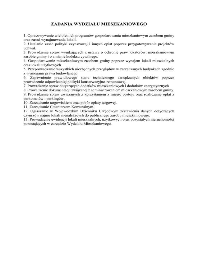 ZADANIA WYDZIAŁU MIESZKANIOWEGO