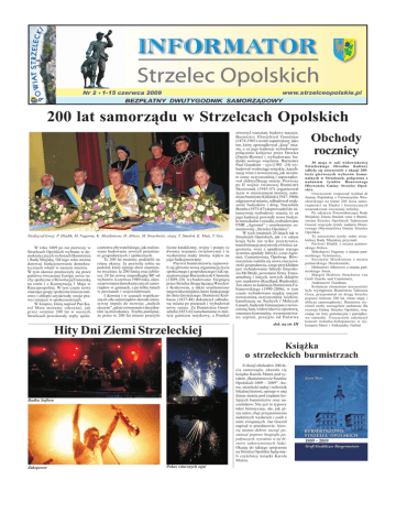 200 lat samorz¹du w Strzelcach Opolskich Siedz¹ od lewej: P. Hladik, M. Nagorny, K. Miszkiniene, H. Albers, M. Strachwitz; stoj¹: T. Smoleñ, K. Mutz, T. Goc. W roku 1809 po raz pierwszy w Strzelcach Opolskich wybrano w demokratycznych wyborach Burmistrza i Radê Miejsk¹. Od tego roku mo¿na datowaæ funkcjonowanie demokratycznych w³adz w naszym miecie. W tym okresie przetoczy³y siê przez pañstwa ówczesnej Europy nowe ruchy spo³eczne z Rewolucj¹ Francusk¹ na czele i z Konstytucj¹ 3 Maja w Rzeczpospolitej. W tym czasie nowe znacz¹ce grupy spo³eczne (mieszczañstwo i ch³opi) uzyskiwa³y swoje prawa i miejsce w spo³ecznociach. W ksi¹¿ce, któr¹ napisa³ Pan Karol Mutz mo¿emy odczytaæ, jak przez ostatnie 200 lat w naszych Strzelcach powstawa³y zrêby spo³e- czeñstwa obywatelskiego, jak realizowano budowanie nowych przestrzeni gospodarczych i spo³ecznych. Te 200 lat mo¿emy podzieliæ na ró¿ne okresy. Ja pozwolê sobie na podzia³, który ujmuje dwie znamienne rocznice: tê 200 letni¹ oraz jubileusz 20 lat nowej niepodleg³ej RP od wyborów 4 czerwca 1989 roku, okresu powstania demokratycznych samorz¹dów w gminach, a po kilku latach w powiatach i województwach. I dawniej i w czasach wspó³czesnych si³a samorz¹dów dawa³a intensywny impuls do rozwoju ma³ych ojczyzn, gdzie suwerenem i decydentem s¹ mieszkañcy. Trzeba pamiêtaæ, ¿e przez te 200 lat miasto prze¿y³o liczne kataklizmy, wojny i po¿ary (z dwoma wojnami wiatowymi) i te wydarzenia mia³y istotny wp³yw na jego funkcjonowanie. Pierwsi burmistrzowie zajmowali siê g³ównie now¹ organizacj¹ ¿ycia spo³ecznego i gospodarczego i tak np. za pierwszego Burmistrza dr Clementa (1809-20) wybudowano biegn¹c¹ przez Strzelce drogê ³¹cz¹c¹ Wroc³aw z Krakowem, a tak¿e uruchomiono targowisko miejskie, które funkcjonuje do dnia dzisiejszego. Burmistrz Kielbassa (1837-48) dokoñczy³ odbudowê miasta po po¿arach i wybudowa³ nowy ratusz. Za Burmistrza Groetschela (1853-62) uruchomiono w miecie garnizon wojskowy, a Prankel Hity Dni Ziemi Strzeleckiej otworzy³ warsztaty budowy maszyn. Burmistrz Ehrenfried Gundrum (1874-1901) zosta³ zapamiêtany jako ten, który uporz¹dkowa³ kasê miasta, a za jego kadencji wybudowano po³¹czenie kolejowe przez Strzelce (Opole-Bytom) i wybudowano budynki nowego wiêzienia. Burmistrz Paul Gundrum syn (1901 -24) wybudowa³ wodoci¹gi miejskie, kanalizacjê wraz z nowoczesn¹, jak na tamte czasy oczyszczalni¹ i zapocz¹tkowa³ elektryfikacjê miasta. Pierwszy po II wojnie wiatowej Burmistrz Skowronek (1945-47) organizowa³ ¿ycie w zniszczonym miecie, natomiast burmistrz Kitliñski (1947-1960) odgruzowa³ miasto, odbudowa³ wiêkszoæ budynków i dróg. Naczelnik Bomba (1975-87) doprowadzi³ do intensywnej rozbudowy miasta, to za jego kadencji powsta³y nowe budynki mieszkalne i osiedla, rozbudowano FMR Agromet i uruchomiono cementowniê Strzelce Opolskie. W tych ostatnich 20 latach tak w Strzelcach Opolskich, jak i w ca³ym kraju by³o nie tylko pozytywnie, transformacja przynios³a równie¿ zagro¿enia, wraz z upadkiem starego systemu upada³y fabryki, u nas Agromet, Cementownia, Opolwap. Równoczenie rodzi³a siê nowa rzeczywistoæ gospodarcza, czego przyk³adem jest wybudowanie fabryki Intersilesia Mc Bride, powstanie firmy Transannaberg i innych, nowych sklepów tzw. marketów (Kaufland, Biedronki). Ten okres to kadencja Burmistrza Fabianowskiego (1990-2006), w tym czasie wybudowano miêdzy innymi nowoczesn¹ oczyszczalniê cieków, kanalizacjê na Suchych i Mokrych £anach, budynek Gimnazjum z nowoczesn¹ hal¹ widowiskowo-sportow¹, cmentarz komunalny, wyremontowano szpital, przejêto od Pañstwa dok. na str. III Obchody rocznicy 30 maja w sali widowiskowej Strzeleckiego Orodka Kultury odby³a siê uroczystoæ z okazji 200lecia pierwszych wyborów komunalnych w Strzelcach, po³¹czona z nadaniem tytu³ów Honorowego Obywatela Gminy Strzelce Opolskie. Uroczystoæ rozpocz¹³ wyk³ad dr Joanny Popiñskiej z Uniwersytetu Wroc³awskiego na temat 200 lecia samorz¹dnoci na l¹sku i historycznych uwarunkowañ ówczesnej reformy. Po odczycie Przewodnicz¹ca Rady Miejskiej Teresa Smoleñ wraz z Burmistrzem Strzelec Opolskich Tadeuszem Gocem wrêczy³a tytu³y nadania Honorowego Obywatelstwa Gminy Strzelce Opolskie. Te zaszczytne tytu³y radni strzeleckiej Rady Miejskiej przyznali: Pavlowi Hladik z miasta partnerskiego Holice, Miko³ajowi Nagorny z miasta partnerskiego Tymienica, Krystynie Miszkiniene z miasta partnerskiego Druskienniki, Helmutowi Albersowi z miasta partnerskiego Soest, Margrit Hrabinie Strachwitz von Groß Zauche und Camminetz, Andreasowi Gundrum. Kolejnym elementem uroczystoci by³o wyst¹pienie Burmistrza Tadeusza Goca, przypomnia³ on drogê Strzelec poprzez minione 200 lat, ró¿ne etapy i oblicza samorz¹dnoci. Burmistrz wyró¿ni³ osoby szczególnie zas³u¿one dla rozwoju Gminy Strzelce Opolskie, wrêczaj¹c im listy gratulacyjne i pami¹tkowe statuetki. Uroczystoæ zakoñczy³ koncert wokalno-fortepianowy w wykonaniu Marii i Aleksandry Garbal. Ksi¹¿ka o strzeleckich burmistrzach Z okazji obchodów 200-lecia samorz¹du, ukaza³a siê ksi¹¿ka Karola Mutza pod tytu³em Burmistrzowie Strzelec Opolskich 1809 2009. Autor, strzelecki radny i mi³onik lokalnej historii, opisuje w niej dzieje miasta pod rz¹dami kolejnych burmistrzów oraz naczelników. Nie jest to typowy tekst historyczny, ale, jak pisze autor, chêæ przypomnienia niektórych wydarzeñ i osób z nimi zwi¹zanych. Jan Goczo³ napisa³ w przedmowie: historiê miasta dobrze zacz¹æ poznawaæ poprzez biografie pojedynczych, wyranie w tej historii zakorzenionych ludzi. Okazjê do takiego spojrzenia na Strzelce Opolskie bêd¹ mieli czytelnicy ksi¹¿ki Karola Mutza. Budka Suflera Zakopower Pokaz sztucznych ogni