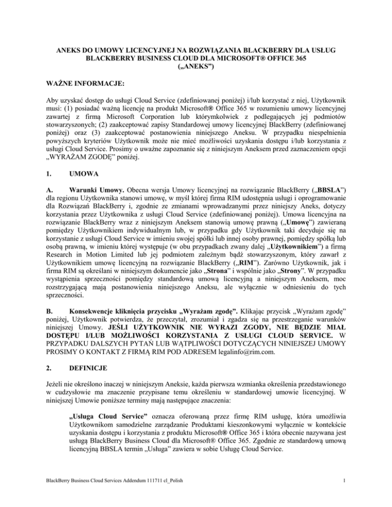 ANEKS DO UMOWY LICENCYJNEJ NA ROZWIĄZANIA BLACKBERRY DLA USŁUG BLACKBERRY BUSINESS CLOUD DLA MICROSOFT® OFFICE 365 („ANEKS”) WAŻNE INFORMACJE: Aby uzyskać dostęp do usługi Cloud Service (zdefiniowanej poniżej) i/lub korzystać z niej, Użytkownik musi: (1) posiadać ważną licencję na produkt Microsoft® Office 365 w rozumieniu umowy licencyjnej zawartej z firmą Microsoft Corporation lub którymkolwiek z podlegających jej podmiotów stowarzyszonych; (2) zaakceptować zapisy Standardowej umowy licencyjnej BlackBerry (zdefiniowanej poniżej) oraz (3) zaakceptować postanowienia niniejszego Aneksu. W przypadku niespełnienia powyższych kryteriów Użytkownik może nie mieć możliwości uzyskania dostępu i/lub korzystania z usługi Cloud Service. Prosimy o uważne zapoznanie się z niniejszym Aneksem przed zaznaczeniem opcji „WYRAŻAM ZGODĘ” poniżej. 1. UMOWA A. Warunki Umowy. Obecna wersja Umowy licencyjnej na rozwiązanie BlackBerry („BBSLA”) dla regionu Użytkownika stanowi umowę, w myśl której firma RIM udostępnia usługi i oprogramowanie dla Rozwiązań BlackBerry i, zgodnie ze zmianami wprowadzanymi przez niniejszy Aneks, dotyczy korzystania przez Użytkownika z usługi Cloud Service (zdefiniowanej poniżej). Umowa licencyjna na rozwiązanie BlackBerry wraz z niniejszym Aneksem stanowią umowę prawną („Umowę”) zawieraną pomiędzy Użytkownikiem indywidualnym lub, w przypadku gdy Użytkownik taki decyduje się na korzystanie z usługi Cloud Service w imieniu swojej spółki lub innej osoby prawnej, pomiędzy spółką lub osobą prawną, w imieniu której występuje (w obu przypadkach zwany dalej „Użytkownikiem”) a firmą Research in Motion Limited lub jej podmiotem zależnym bądź stowarzyszonym, który zawarł z Użytkownikiem umowę licencyjną na rozwiązanie BlackBerry („RIM”). Zarówno Użytkownik, jak i firma RIM są określani w niniejszym dokumencie jako „Strona” i wspólnie jako „Strony”. W przypadku wystąpienia sprzeczności pomiędzy standardową umową licencyjną a niniejszym Aneksem, moc rozstrzygającą mają postanowienia niniejszego Aneksu, ale wyłącznie w odniesieniu do tych sprzeczności. B. Konsekwencje kliknięcia przycisku „Wyrażam zgodę”. Klikając przycisk „Wyrażam zgodę” poniżej, Użytkownik potwierdza, że przeczytał, zrozumiał i zgadza się na przestrzeganie warunków niniejszej Umowy. JEŚLI UŻYTKOWNIK NIE WYRAZI ZGODY, NIE BĘDZIE MIAŁ DOSTĘPU I/LUB MOŻLIWOŚCI KORZYSTANIA Z USŁUGI CLOUD SERVICE. W PRZYPADKU DALSZYCH PYTAŃ LUB WĄTPLIWOŚCI DOTYCZĄCYCH NINIEJSZEJ UMOWY PROSIMY O KONTAKT Z FIRMĄ RIM POD ADRESEM [email protected]. 2. DEFINICJE Jeżeli nie określono inaczej w niniejszym Aneksie, każda pierwsza wzmianka określenia przedstawionego w cudzysłowie ma znaczenie przypisane temu określeniu w standardowej umowie licencyjnej. W niniejszej Umowie poniższe terminy mają następujące znaczenia: „Usługa Cloud Service” oznacza oferowaną przez firmę RIM usługę, która umożliwia Użytkownikom samodzielne zarządzanie Produktami kieszonkowymi wyłącznie w kontekście uzyskania dostępu i korzystania z produktu Microsoft® Office 365 i która obecnie nazywana jest usługą BlackBerry Business Cloud dla Microsoft® Office 365. Zgodnie ze standardową umową licencyjną BBSLA termin „Usługa” zawiera w sobie Usługę Cloud Service. BlackBerry Business Cloud Services Addendum 111711 cl_Polish 1 „Microsoft® Office 365” jest usługą abonamentową dla świadczoną przez lub w imieniu firmy Microsoft Corporation lub jej podmiotów stowarzyszonych („Microsoft”), lub usługodawców zewnętrznych, funkcjonującą na rynku pod nazwą „Microsoft® Office 365” lub każdą inną nazwą jaka ją może zastąpić. Aby uniknąć jakichkolwiek wątpliwości, usługa Microsoft® Office 365 jest Usługą dostawcy zewnętrznego (zdefiniowaną w umowie BBSLA). „Abonament” oznacza umowę, na mocy której Użytkownik oraz określona liczba Upoważnionych Użytkowników są upoważnieni przez firmę RIM do korzystania z usługi Cloud Service. 3. ANEKSY I ZAŁĄCZNIKI DO UMOWY BBSLA A. Udzielenie licencji. Wyłącznie na potrzeby niniejszej Umowy sekcja 2(a) umowy BBSLA — „Licencja na oprogramowanie i dokumentację” — zostaje w całości usunięta i zastąpiona następującym zapisem: Pod warunkiem spełnienia przez Użytkownika postanowień i warunków niniejszej Umowy oraz uregulowania opłat abonamentowych, jeśli takie istnieją, firma RIM udziela Użytkownikowi osobistej, niewyłącznej, nieprzenoszalnej, odwołalnej licencji na korzystanie z usługi Cloud Service wyłącznie na użytek własny Użytkownika oraz określonej liczby Upoważnionych Użytkowników, upoważnionych w oparciu o abonament. Niniejsza usługa Cloud Service jest usługą abonamentową i w związku z tym prawa licencyjne obowiązują wyłącznie w okresie, za który Użytkownik opłacił wymagane opłaty abonamentowe, jeśli takie istnieją. B. Autoryzacja. Użytkownik przyjmuje do wiadomości, że w celu otrzymania dostępu do usługi Cloud Service przez Użytkownika bądź Upoważnionych Użytkowników, może istnieć konieczność autoryzowania ich przez firmę Microsoft jako abonentów produktu Microsoft® Office 365 upoważnionych do posiadania dostępu oraz prawa do korzystania z usługi Cloud Service; oraz że firma RIM nie ponosi odpowiedzialności za bezpieczeństwo i dokładność procesów uwierzytelniania firmy Microsoft, jakiekolwiek nieścisłe informacje uzyskane od firmy Microsoft, ani bezpieczeństwo i prywatność centrów i sieci danych firmy Microsoft. C. Dostępność Usługi. Usługa może być niedostępna dla Użytkownika bądź Upoważnionych Użytkowników w niektórych państwach lub regionach geograficznych. D. Ograniczenia Usługi. Ograniczenia administracyjne na korzystanie z usługi Cloud Service mogą być nakładane przez firmę RIM i według jej w