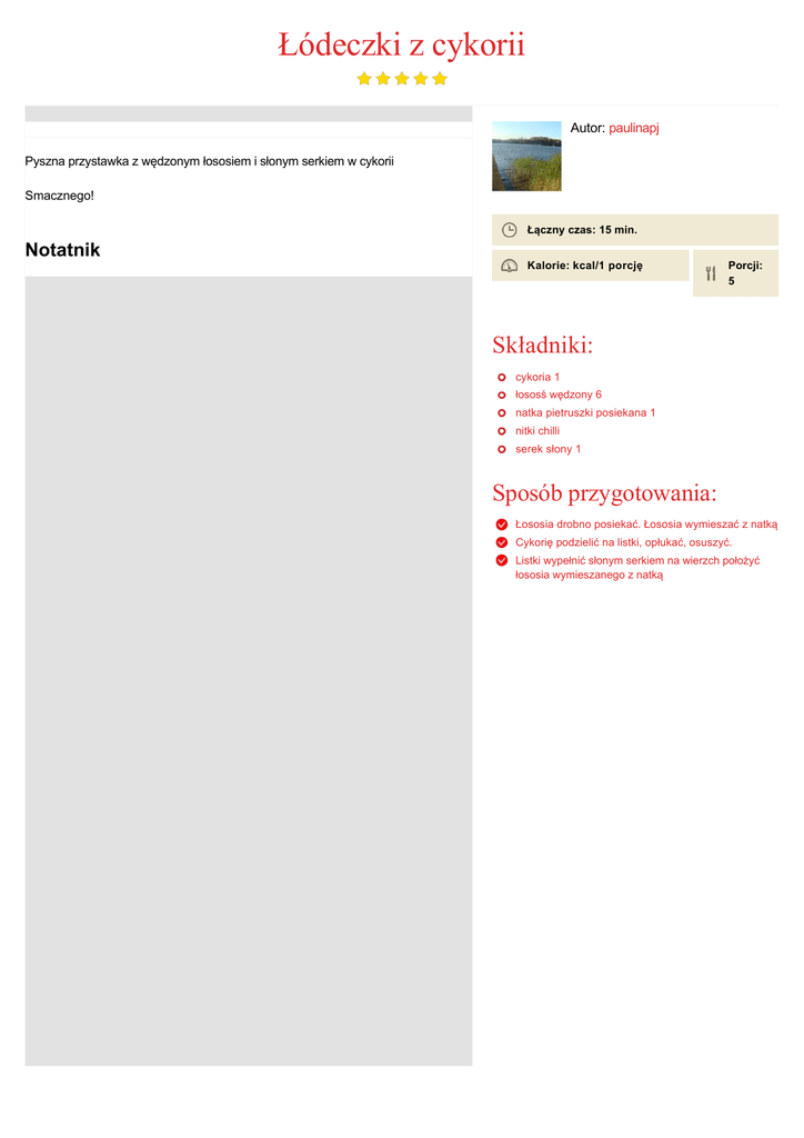 Łódeczki z cykorii Autor: paulinapj Pyszna przystawka z wędzonym łososiem i słonym serkiem w cykorii Smacznego! Łączny czas: 15 min. Notatnik Kalorie: kcal/1 porcję Porcji: 5 Składniki: cykoria 1 łososś wędzony 6 natka pietruszki posiekana 1 nitki chilli serek słony 1 Sposób przygotowania: Łososia drobno posiekać. Łososia wymieszać z natką Cykorię podzielić na listki, opłukać, osuszyć. Listki wypełnić słonym serkiem na wierzch położyć łososia wymieszanego z natką