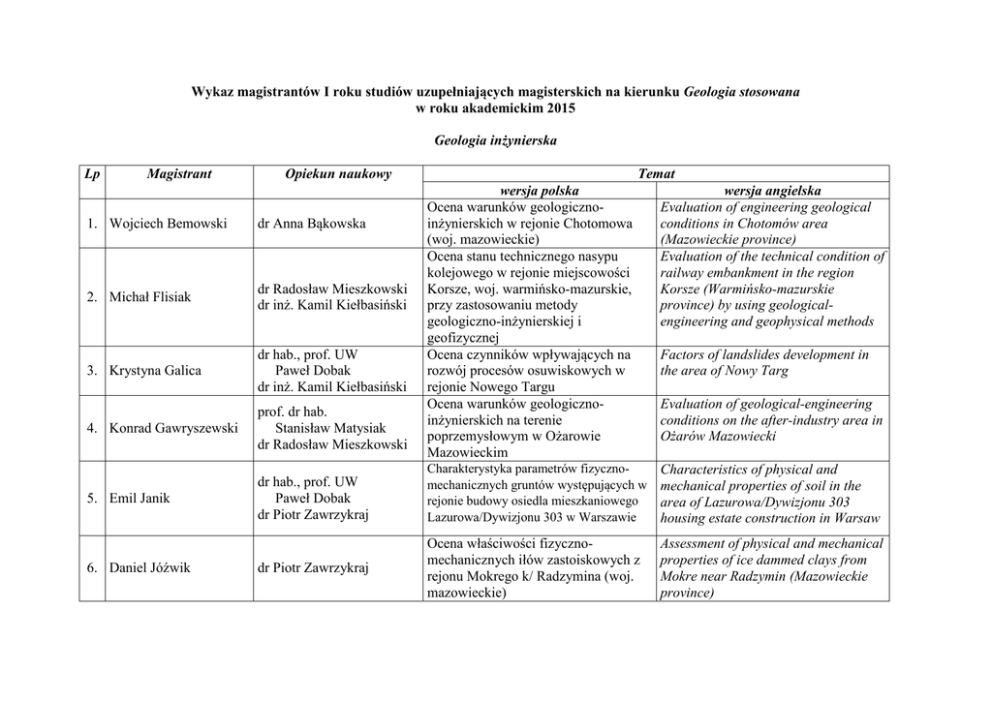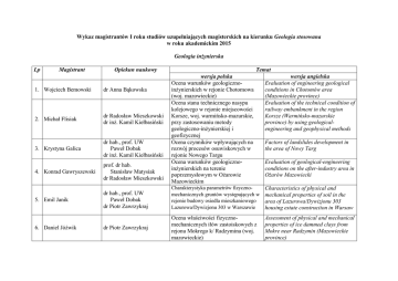 Wykaz magistrantów I roku studiów uzupełniających magisterskich na kierunku Geologia stosowana w roku akademickim 2015 Geologia inżynierska Lp Magistrant Opiekun naukowy Temat wersja polska Ocena warunków geologicznoinżynierskich w rejonie Chotomowa (woj. mazowieckie) Ocena stanu technicznego nasypu kolejowego w rejonie miejscowości Korsze, woj. warmińsko-mazurskie, przy zastosowaniu metody geologiczno-inżynierskiej i geofizycznej Ocena czynników wpływających na rozwój procesów osuwiskowych w rejonie Nowego Targu Ocena warunków geologicznoinżynierskich na terenie poprzemysłowym w Ożarowie Mazowieckim wersja angielska Evaluation of engineering geological conditions in Chotomów area (Mazowieckie province) Evaluation of the technical condition of railway embankment in the region Korsze (Warmińsko-mazurskie province) by using geologicalengineering and geophysical methods 1. Wojciech Bemowski dr Anna Bąkowska 2. Michał Flisiak dr Radosław Mieszkowski dr inż. Kamil Kiełbasiński 3. Krystyna Galica dr hab., prof. UW Paweł Dobak dr inż. Kamil Kiełbasiński 4. Konrad Gawryszewski prof. dr hab. Stanisław Matysiak dr Radosław Mieszkowski 5. Emil Janik dr hab., prof. UW Paweł Dobak dr Piotr Zawrzykraj Charakterystyka parametrów fizycznomechanicznych gruntów występujących w rejonie budowy osiedla mieszkaniowego Lazurowa/Dywizjonu 303 w Warszawie Characteristics of physical and mechanical properties of soil in the area of Lazurowa/Dywizjonu 303 housing estate construction in Warsaw dr Piotr Zawrzykraj Ocena właściwości fizycznomechanicznych iłów zastoiskowych z rejonu Mokrego k/ Radzymina (woj. mazowieckie) Assessment of physical and mechanical properties of ice dammed clays from Mokre near Radzymin (Mazowieckie province) 6. Daniel Jóźwik Factors of landslides development in the area of Nowy Targ Evaluation of geological-engineering conditions on the after-industry area in Ożarów Mazowiecki 7. Michał Kajka 8. Roman Kluczka dr Anna Bąkowska dr Radosław Mieszkowski prof. dr hab. Stanisław Matysiak dr Radosław Mieszkowski 9. Katarzyna Kuna dr Anna Bąkowska dr Piotr Zawrzykraj 10. Magdalena Maciak dr Emilia Wójcik 11. Aleksander Niemiec dr Sebastian Kowalczyk 12. Kinga Orkisz dr hab., prof. UW Paweł Dobak dr inż. Kamil Kiełbasiński 13. Ewelina Popiłka dr Andrzej Domonik dr hab. Paweł Łukaszewski 14. Andrzej Simoni dr Andrzej Domonik dr hab. Paweł Łukaszewski Ocena stateczności skarpy w miejscowości Kamienica k. Dobrzynia nad Wisłą (woj. kujawsko-pomorskie) Ocena warunków geologicznoinżynierskich w rejonie projektowanych elektrowni wiatrowych k/ Słubic (woj. lubuskie) Ocena warunków geologicznoinżynierskich w rejonie Mostu Południowego w Warszawie, na zachodnim brzegu Wisły. Ocena warunków geologiczno inżynierskich w rejonie Nowej Suchej k/Sochaczewa Assessment of slope stability in Kamienica near Dobrzyń on the Vistula (KujawskoPomorskie province) Evaluation of geological-engineering conditions in the area of the planning wind power plant near Słubice (Lubuskie province) Evaluation of engineering geological conditions in the area of Southern Bridge in Warsaw on the west bank of the Vistula. Ocena warunków geologicznoinżynierskich podłoża budowlanego w rejonie Służewca Przemysłowego w Warszawie Evaluation of engineering geological conditions of the subsoil in Służew Przemysłowy district in Warsaw Geologiczno-inżynierskie uwarunkowania zabezpieczeń wybranych skarp drogowych na terenie województwa małopolskiego. Właściwości geomechaniczne wapieni towarzyszących ordowickiej formacji ilasto-mułowcowej z otworu Lubocino (gmina Krokowa, powiat pucki) i Opalino (gmina Gniewino, powiat wejherowski). Engineering geological conditioning of protecting of selected road slopes in Małopolskie province Geomechanical properties of limestones accompanied by Ordovician shale formation from Lubocino well (Krokowa Community, Puck County) and Opalino well (Gniewino Community, Wejherowo County) Analysis of post failure structures of Silurian and Ordovician mudstones and siltstones from Lubocino well (Krokowa Community, Puck County) and Opalino well (Gniewino Community, Wejherowo County) Analiza struktur pozniszczeniowych sylurskich i ordowickich skał ilastomułowcowych z otworu Lubocino (gmina Krokowa, powiat pucki) i Opalino (gmina Gniewino, powiat wejherowski) Evaluation of engineering geological conditions in the area of Nowa Sucha near Sochaczew 15. Justyna Smółkowska 16. Agnieszka Teresińska 17. Małgorzata Zaremba dr Radosław Mieszkowski dr Wojciech Ozimkowski dr hab., prof. UW Paweł Dobak dr Ireneusz Gawriuczenkow dr Jerzy Trzciński dr Tomasz Szczepański dr Fabian Welc dr hab. Sławomir Rzepka 18. Michał Zimiński dr hab., prof. UW Paweł Dobak dr inż. Kamil Kiełbasiński 19. Konrad Zwierowicz dr hab., prof. UW Paweł Dobak dr inż. Kamil Kiełbasiński Ocena warunków geologicznoinżynierskich obszaru osuwiskowego w miejscowości Leśnica (gm. Lanckorona, pow. wadowicki) Ocena geologiczno - inżynierskich warunków obwodnicy Ostródy Evaluation of geological-engineering conditions of the landslide area in Leśnica (Lanckorona community, district Wadowice) Evaluation of engineering geological conditions of Ostróda bypass Wytrzymałość cegieł mułowych używanych w starożytnym Egipcie w budownictwie mieszkalnym i obronnym na przykładzie stanowiska Tell el-Retaba The strength of mud bricks used in ancient Egypt in residential and defensive buildings on the example of Tell el-Retaba site Ocena warunków stateczności skarpy wysoczyzny polodowcowej w okolicach Czerska - Góry Kalwarii (woj. mazowieckie) Zastosowanie metod GIS dla geologicznoinżynierskiej oceny naturalnej bariery geologicznej w okolicach Sztabina (woj. podlaskie) Evaluation of stability of glacial plateau slope in the area of Czersk - Góra Kalwaria (Mazowieckie province) Aplications of GIS methods for engineering geological assessment of natural 