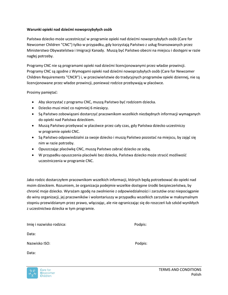 Warunki opieki nad dziećmi nowoprzybyłych osób Państwa dziecko może uczestniczyć w programie opieki nad dziećmi nowoprzybyłych osób (Care for Newcomer Children "CNC") tylko w przypadku, gdy korzystają Państwo z usług finansowanych przez Ministerstwo Obywatelstwa i Imigracji Kanady. Muszą być Państwo obecni na miejscu i dostępni w razie nagłej potrzeby. Programy CNC nie są programami opieki nad dziećmi licencjonowanymi przez władze prowincji. Programy CNC są zgodne z Wymogami opieki nad dziećmi nowoprzybyłych osób (Care for Newcomer Children Requirements "CNCR") i, w przeciwieństwie do tradycyjnych programów opieki dziennej, nie są licencjonowane przez władze prowincji, ponieważ rodzice przebywają w placówce. Prosimy pamiętać: Aby skorzystać z programu CNC, muszą Państwo być rodzicem dziecka. Dziecko musi mieć co najmniej 6 miesięcy. Są Państwo zobowiązani dostarczyć pracownikom wszelkich niezbędnych informacji wymaganych do opieki nad Państwa dzieckiem. Muszą Państwo przebywać w placówce przez cały czas, gdy Państwa dziecko uczestniczy w programie opieki CNC. Są Państwo odpowiedzialni za swoje dziecko i muszą Państwo pozostać na miejscu, by zająć się nim w razie potrzeby. Opuszczając placówkę CNC, muszą Państwo zabrać dziecko ze sobą. W przypadku opuszczenia placówki bez dziecka, Państwa dziecko może stracić możliwość uczestniczenia w programie CNC. Jako rodzic dostarczyłem pracownikom wszelkich informacji, których będą potrzebować do opieki nad moim dzieckiem. Rozumiem, że organizacja podejmie wszelkie dostępne środki bezpieczeństwa, by chronić moje dziecko. Wyrażam zgodę na zwolnienie z odpowiedzialności i zarzutów oraz niepociąganie do winy organizacji, jej pracowników i wolontariuszy w przypadku wszelkich zarzutów w maksymalnym stopniu przewidzianym przez prawo, włączając, ale nie ograniczając się do roszczeń lub szkód wynikłych z uczestnictwa dziecka w tym programie. Imię i nazwisko rodzica: Podpis: Data: Nazwisko ISO: Podpis: Data: TERMS AND CONDITIONS Polish
