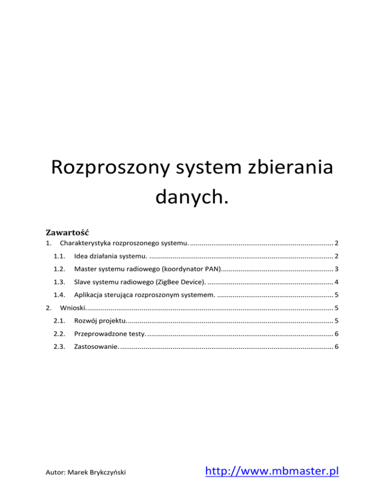 Rozproszony system zbierania danych. Zawartość 1. 2. Charakterystyka rozproszonego systemu. .......................................................................... 2 1.1. Idea działania systemu. ............................................................................................... 2 1.2. Master systemu radiowego (koordynator PAN).......................................................... 3 1.3. Slave systemu radiowego (ZigBee Device). ................................................................. 4 1.4. Aplikacja sterująca rozproszonym systemem. ............................................................ 5 Wnioski................................................................................................................................ 5 2.1. Rozwój projektu. .......................................................................................................... 5 2.2. Przeprowadzone testy. ................................................................................................ 6 2.3. Zastosowanie. .............................................................................................................. 6 Autor: Marek Brykczyński http://www.mbmaster.pl 1. Charakterystyka rozproszonego systemu. Rysunek 1. Budowa rozproszonego systemu. Rozproszony system zbierania danych jest implementacją kilku szeroko stosowanych standardów. Komunikacja przewodowa w systemie jest zbudowana w oparciu o standard USB2.0 (wymiana informacji mikrokontroler <-> komputer) oraz standard SPI (wymiana informacji mikrokontroler <-> moduł radiowy). Zastosowanie jako interfejsu z komputerem PC standardu USB gwarantuje łatwą przenoszalność systemu z jednego komputera na drugi. Komunikacja bezprzewodowa odbywa się zgodnie z standardem IEEE 802.15.4 (pasmo 2,4GHz) oraz standardem ZigBee. Algorytmy wszystkich mikrokontrolerów są napisane w języku C. Ostatnią technologią użytą w systemie jest .NET Framework. Aplikacja PC będąca interfejsem użytkownika jest napisana w języku C#. System posiada także możliwość rejestracji pomiarów on-line do pliku „.csv”, daje to możliwość zaimportowania danych pomiarowych do innych programów komputerowych takich jak Matlab lub MS Excel. 1.1. Idea działania systemu. Rozproszony system zbierania danych przeznaczony jest do wykonywania pomiarów analogowych oraz cyfrowych. Posiada on także możliwość sterowania wyjściami cyfrowymi modułów peryferyjnych. Wymiana informacji pomiędzy modułem zarządzającym systemem (Master) a modułami peryferyjnymi (urządzenia Slave) odbywa się bezprzewodowo. Moduł 2 [email protected] http://www.mbmaster.pl zarządzający systemem komunikuje się również poprzez USB z aplikacją sterującą uruchomioną na komputerze PC. Aplikacja sterująca systemem jest interfejsem użytkownika. Wizualizuje ona otrzymane drogą radiową pomiary oraz daje możliwość wysterowania czterech wyjść cyfrowych w każdym urządzeniu slave. System zaprojektowany został tak, aby każdy z modułów slave wykonywał dwa pomiary analogowe o rozdzielczości 10 bitów (metoda kompensacji wagowej) oraz dwa cyfrowe. Dodatkowo każdy moduł slave posiada cztery wyjścia cyfrowe, których załączanie/wyłączenie możliwe jest poprzez aplikację PC. Za sterowanie systemem odpowiedzialna jest aplikacja PC. Aplikacja wizualizuje również stan komunikacji radiowej, której diagnostykę przeprowadza master systemu. Wszystkie mikrokontrolery wchodzące w skład rozproszonego systemu posiadają uruchomiony watchdog timer o okresie Zadaniem watchdog-a jest pilnowanie czy nie została utracona łączność radiowa w sieci, w wypadku utraty łączności następuje automatyczny reset urządzenia a następnie jego ponowna inicjalizacja. Komunikacja mastera systemu z komputerem PC odbywa się poprzez magistralę USB 2.0 w klasie HID, zapewnia to maksymalnej prędkości transmisji danych pomiędzy komputerem PC a masterem. Master systemu bezprzewodowego pełni funkcję koordynatora PAN1. Jego zadaniem jest zarządzanie łącznością radiową w systemie. Komunikacja radiowa odbywa się w paśmie . Sieć bezprzewodowa zbudowana jest w oparciu o topologię gwiazdy. Maksymalny zasięg sieci bezprzewodowej tj. . Maksymalna 2 szybkość transmisji radiowej 250[kbps] . 1.2. Master systemu radiowego (koordynator PAN). Master systemu radiowego zbudowany jest z mikrokontrolera PIC oraz modułu radiowego. Jego zadaniem jest komunikacja poprzez USB z komputerem PC oraz stworzenie sieci radiowej zgodnie z standardem ZigBee. Master zarządza siecią bezprzewodową jako koordynator PAN, wysyła rozkazy sterujące oraz odbiera dane pomiarowe od slave-ów. Do konstrukcji mastera zastosowany został mikrokontroler, który posiada zaimplementowany interfejs USB 2.0 Full Speed z możliwością transmisji danych po magistrali USB z prędkością do 12 Mbit/s. Mikrokontroler posiada 32kB pamięci flash. Spośród wszystkich mikrokontrolerów master posiadać musi dużą pojemność pamięci flash z uwagi na rozmiar algorytmu sterującego jaki został w nim zawarty: obsługa USB, organizacja sieci radiowej, diagnostyka sieci radiowej. Sieć radiowa zorganizowana przez mastera działa w trybie Zdjęcie 1. Koordynator PAN. 1 2 PAN - Personal Area Network Dane podane przez producenta - Microchip 3 [email protected] http://www.mbmaster.pl połączeniowym, oznacza to że po każdym pakiecie wysłanym radiowo przez mastera oczekiwane jest potwierdzenie otrzymania pakietu od modułu slave. Potwierdzenie wysyłane jest poprzez slave w postaci ramki ACK. Ramka ACK jest tworzona i odsyłana automatycznie przez moduł radiowy. Jeżeli master nie otrzyma sygnału w ACK w ściśle określonym czasie to rozpoczyna retransmisję pakietu. Maksymalna liczba retransmisji jest zdefiniowana przez standard IEEE 802.15.4. 1.3. Slave systemu radiowego (ZigBee Device). W rozproszonym systemie zbierania danych zaprojektowano dwa slave-y. Zbudowane moduły slave s