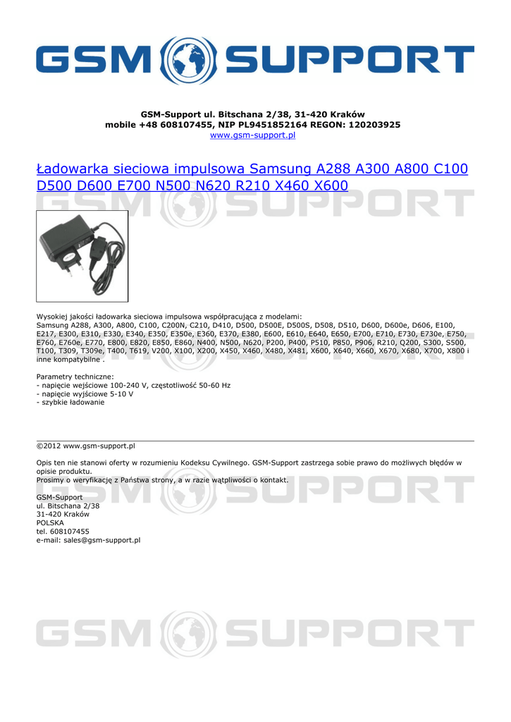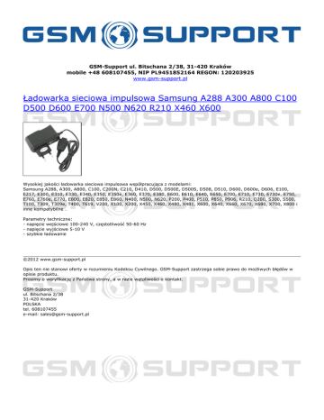 GSM-Support ul. Bitschana 2/38, 31-420 Kraków mobile +48 608107455, NIP PL9451852164 REGON: 120203925 www.gsm-support.pl Ładowarka sieciowa impulsowa Samsung A288 A300 A800 C100 D500 D600 E700 N500 N620 R210 X460 X600 Wysokiej jakości ładowarka sieciowa impulsowa współpracująca z modelami: Samsung A288, A300, A800, C100, C200N, C210, D410, D500, D500E, D500S, D508, D510, D600, D600e, D606, E100, E217, E300, E310, E330, E340, E350, E350e, E360, E370, E380, E600, E610, E640, E650, E700, E710, E730, E730e, E750, E760, E760e, E770, E800, E820, E850, E860, N400, N500, N620, P200, P400, P510, P850, P906, R210, Q200, S300, S500, T100, T309, T309e, T400, T619, V200, X100, X200, X450, X460, X480, X481, X600, X640, X660, X670, X680, X700, X800 i inne kompatybilne . Parametry techniczne: - napięcie wejściowe 100-240 V, częstotliwość 50-60 Hz - napięcie wyjściowe 5-10 V - szybkie ładowanie ©2012 www.gsm-support.pl Opis ten nie stanowi oferty w rozumieniu Kodeksu Cywilnego. GSM-Support zastrzega sobie prawo do możliwych błędów w opisie produktu. Prosimy o weryfikację z Państwa strony, a w razie wątpliwości o kontakt. GSM-Support ul. Bitschana 2/38 31-420 Kraków POLSKA tel. 608107455 e-mail: [email protected] Powered by TCPDF (www.tcpdf.org)