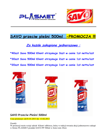 SAVO przeciw pleśni 500ml -PROMOCJA !!! Za każde zakupione jednorazowo : *40szt Savo 500ml Klient otrzymuje 3szt w cenie 1zł netto/szt *30szt Savo 500ml Klient otrzymuje 2szt w cenie 1zł netto/szt *20szt Savo 500ml Klient otrzymuje 1szt w cenie 1zł netto/szt SAVO Przeciw Pleśni 500ml Czas promocji: od.01.01.2013 do 13.02.2013 Zasady: W promocji może wziąć udział Klient/ odbiorca, który w trakcji trwania akcji jednorazowo zakupi w firmie PLASMET produkt SAVO PP 500ml w ilości min 20szt.