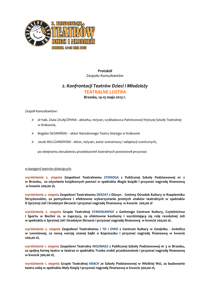 Protokół Zespołu Konsultantów 2. Konfrontacji Teatrów Dzieci i Młodzieży TEATRALNE LUSTRA Brzesko, 14-15 maja 2013 r. Zespół Konsultantów: dr hab. Ziuta ZAJĄCÓWNA - aktorka, reżyser, wykładowca Państwowej Wyższej Szkoły Teatralnej w Krakowie, Bogdan SŁOMIŃSKI – aktor Narodowego Teatru Starego w Krakowie Jacek MILCZANOWSKI - aktor, reżyser, autor scenariuszy i adaptacji scenicznych, po obejrzeniu dwudziestu przedstawień teatralnych postanowił przyznać: w kategorii teatrów dziecięcych: wyróżnienie 2. stopnia Zespołowi Teatralnemu STONOGA z Publicznej Szkoły Podstawowej nr 2 w Brzesku, za ożywienie książkowych postaci w spektaklu Magia książki i przyznać nagrodę finansową w kwocie 200,00 zł, wyróżnienie 2. stopnia Zesp0łowi Teatralnemu SKRZAT z Olszyn - Gminny Ośrodek Kultury w Rzepienniku Strzyżewskim, za pomysłowe i efektowne wykorzystanie prostych znaków teatralnych w spektaklu O Sprytnej Joli i brodatym Skrzacie i przyznać nagrodę finansową w kwocie 200,00 zł wyróżnienie 2. stopnia Grupie Teatralnej STANISŁAWICE z Gminnego Centrum Kultury, Czytelnictwa i Sportu w Bochni zs. w Łapczycy, za efektowne kostiumy i wyróżniającą się rolę rezolutnej Joli w spektaklu o Sprytnej Joli i brodatym Skrzacie i przyznać nagrodę finansową w kwocie 200,00 zł, wyróżnienie 2. stopnia Zespołowi Teatralnemu i TO i OWO z Centrum Kultury w Gnojniku - świetlica w Lewniowej, za nową wersję znanej bajki o Kopciuszku i przyznać nagrodę finansową w kwocie 200,00 zł, wyróżnienie 1. stopnia Zespołowi Teatralny MISZMASZ z Publicznej Szkoły Podstawowej nr 3 w Brzesku, za spójną formę teatru w teatrze w spektaklu Trzeba zrobić przedstawienie i przyznać nagrodę finansową w kwocie 300,00 zł, wyróżnienie 1. stopnia Grupie Teatralnej KRACH ze Szkoły Podstawowej w Wielkiej Wsi, za budowanie teatru sobą w spektaklu Mały Książę i przyznać nagrodę finansową w kwocie 300,00 zł, wyróżnienie 1. stopnia Zespołowi Teatralnemu MAŁY KRACH ze Szkoły Podstawowej w Radgoszczy, punkt filialny w Małcu, za pełne radości przesłanie Bajki o szczęściu i harmonii między ludźmi i zwierzętami i przyznać nagrodę finansową w kwocie 300,00 zł, wyróżnienie 1. stopnia Zespołowi Teatralnemu BOCHENEK z Miejskiego Domu Kultury w Bochni, za kolorowe przedstawienie łączące teatr lalek z żywym planem i przyznać nagrodę finansową w kwocie 300,00 zł, wyróżnienie 1. stopnia Zespołowi Teatralnemu FIGLARZE Z USZWI z Centrum Kultury w Gnojniku - świetlica w Uszwi, za cenną propozycję teatru świetlicowego i przyznać nagrodę finansową w kwocie 300,00 zł, oraz nagrodę Zespołowi Teatralnemu ŻARÓWKA gr. młodsza z Zakliczyńskiego Centrum Kultury w Zakliczynie, za śmiałą i cenną próbę stworzenia autorskiego scenariusza i zespołową pracę w przedstawieniu O dziewczynce, która w przeciwieństwie do głazów odnalazła się i przyznać nagrodę finansową w kwocie 600,00 zł, nagrodę Zespołowi Teatralnemu GALIMATIAS ze Szkoły Podstawowej w Żabnie, za konsekwentną koncepcję plastyczną i zespołową pracę w przedstawieniu na podstawie Kubusia Puchatka i przyznać nagrodę finansową w kwocie 600,00 zł, w kategorii teatrów młodzieżowych: wyróżnienie 2. stopnia Grupie Teatralnej RAMALAMA z Gminnego Centrum Kultury Czytelnictwa i Sportu w Bochni zs. w Łapczycy za odważną próbę dialogu z romantyzmem w spektaklu Rozrachunki – Dziady, i przyznać nagrodę finansową w kwocie 200,00 zł, wyróżnienie 2. stopnia Zespołowi Teatralnemu MARUDY z Gimnazjum nr 1 w Radgoszczy, za przedstawienie oparte na motywach biblijnych i przyznać nagrodę finansową w kwocie 200,00 zł, wyróżnienie 2. stopnia Zespołowi Teatralnemu AWANTURKA z Gimnazjum nr 2 w Dąbrowie Tarnowskiej, za podjęcie tematu miłości w formie teatru poezji i przyznać nagrodę finansową w kwocie 200,00 zł, wyróżnienie 2. stopnia Kołu Teatralnemu G2 z Gimnazjum nr 2 w Tarnowie za odważną propozycję kabaretową i przyznać nagrodę finansową w kwocie 200,00 zł, wyróżnienie 2. stopnia Zespołowi Teatralnemu CARPE DIEM z Zespołu Szkół Publicznych w Woli Rzędzińskiej, za efektowne włączenie elementów tanecznych do spektaklu Kto chce zadrwić z innych zdradnie, sam w swe sidła nieraz wpadnie i przyznać nagrodę finansową w kwocie 200,00 zł, wyróżnienie 1. stopnia Teatrowi Wyobraźni ŻARÓWKA z Zakliczyńskiego Centrum Kultury w Zakliczynie, za zmierzenie się z problematyką trudnych relacji rodzinnych w spektaklu Żubry i przyznać nagrodę finansową w kwocie 300,00 zł, oraz nagrodę Zespołowi Teatralnemu KAGAMI z SIEMACHA SPOT w Tarnowie, za piękną wizję plastyczną inspirowaną estetyką japońską w spektaklu Alicja i przyznać nagrodę finansową w kwocie 700,00 zł, nagrodę Zespołowi Teatralnemu WSZYSTKIE DZIECI TRECOKA z Dąbrowy Tarnowskiej, za dynamiczne i pełne ekspresji aktorstwo i przyznać nagrodę finansową w kwocie 600,00 zł Nagrodę Główną – DIAMENTOWE LUSTRO otrzymał Zespół Teatralny JAGA ze Szkoły Podstawowej w Wojniczu oraz nagrodę finansową w kwocie 900,00 zł. Do udziału w spotkaniu finałowym XXVIII Festiwalu Teatrów Dzieci i Młodzieży BAJDUREK w Nowym Sączu nominowany został Zespół Teatralny JAGA ze Szkoły Podstawowej w Wojniczu. Nagrodę indywidualną, smartfona ufundowanego przez MOBIL-TEL – Autoryzowany Punkt Sprzedaży TMobile w Brzesku, otrzymała Bernadetta Brzuchacz, instruktor Zespołu Teatralnego JAGA ze Szkoły Podstawowej w Wojniczu. Zaproszenia na spektakl repertuarowy Teatru im. L. Solskiego w Tarnowie przyznano Grupie Teatralnej RAMALAMA z Gminnego Centrum Kultury Czytelnictwa i Sportu w Bochni zs. w Łapczycy. Poziom tegorocznego TEATRALNYCH LUSTER był wyrównany, a propozycje przedstawione przez zespoły obejmowały szerokie spektrum gatunków literackich i konwencji teatralnych, od teatru ruchu po kabaret. Obejrzeliśmy niezwykle interesujące insceniz