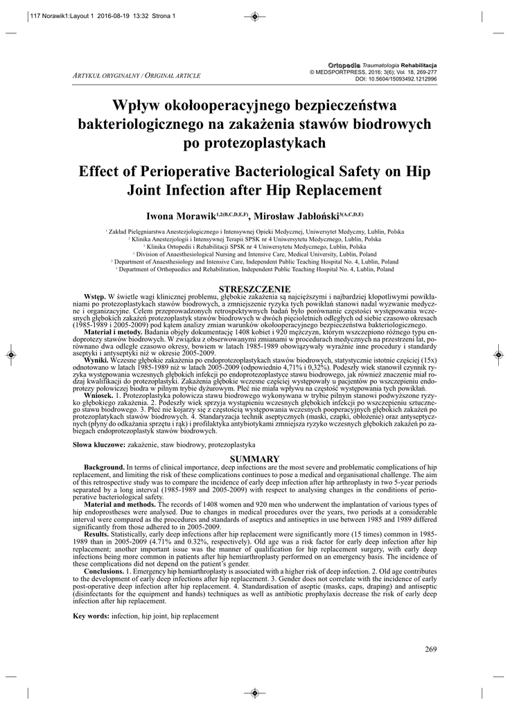 117 Norawik1:Layout 1 2016-08-19 13:32 Strona 1 O r t o p e d i a Traumatologia Rehabilitacja © MEDSPORTPRESS, 2016; 3(6); Vol. 18, 269-277 DOI: 10.5604/15093492.1212996 ARTYKUŁ ORYGINALNY / ORIGINAL ARTICLE Wpływ okołooperacyjnego bezpieczeństwa bakteriologicznego na zakażenia stawów biodrowych po protezoplastykach Effect of Perioperative Bacteriological Safety on Hip Joint Infection after Hip Replacement Iwona Morawik1,2(B,C,D,E,F), Mirosław Jabłoński3(A,C,D,E) 1 Zakład Pielęgniarstwa Anestezjologicznego i Intensywnej Opieki Medycznej, Uniwersytet Medyczny, Lublin, Polska 2 Klinika Anestezjologii i Intensywnej Terapii SPSK nr 4 Uniwersytetu Medycznego, Lublin, Polska 3 Klinika Ortopedii i Rehabilitacji SPSK nr 4 Uniwersytetu Medycznego, Lublin, Polska 1 Division of Anaesthesiological Nursing and Intensive Care, Medical University, Lublin, Poland 2 Department of Anaesthesiology and Intensive Care, Independent Public Teaching Hospital No. 4, Lublin, Poland 3 Department of Orthopaedics and Rehabilitation, Independent Public Teaching Hospital No. 4, Lublin, Poland STRESZCZENIE Wstęp. W świetle wagi klinicznej problemu, głębokie zakażenia są najcięższymi i najbardziej kłopotliwymi powikłaniami po protezoplastykach stawów biodrowych, a zmniejszenie ryzyka tych powikłań stanowi nadal wyzwanie medyczne i organizacyjne. Celem przeprowadzonych retrospektywnych badań było porównanie częstości występowania wczesnych głębokich zakażeń protezoplastyk stawów biodrowych w dwóch pięcioletnich odległych od siebie czasowo okresach (1985-1989 i 2005-2009) pod kątem analizy zmian warunków okołooperacyjnego bezpieczeństwa bakteriologicznego. Materiał i metody. Badania objęły dokumentację 1408 kobiet i 920 mężczyzn, którym wszczepiono różnego typu endoprotezy stawów biodrowych. W związku z obserwowanymi zmianami w procedurach medycznych na przestrzeni lat, porównano dwa odległe czasowo okresy, bowiem w latach 1985-1989 obowiązywały wyraźnie inne procedury i standardy aseptyki i antyseptyki niż w okresie 2005-2009. Wyniki. Wczesne głębokie zakażenia po endoprotezoplastykach stawów biodrowych, statystycznie istotnie częściej (15x) odnotowano w latach 1985-1989 niż w latach 2005-2009 (odpowiednio 4,71% i 0,32%). Podeszły wiek stanowił czynnik ryzyka występowania wczesnych głębokich infekcji po endoprotezoplastyce stawu biodrowego, jak również znaczenie miał rodzaj kwalifikacji do protezoplastyki. Zakażenia głębokie wczesne częściej występowały u pacjentów po wszczepieniu endoprotezy połowiczej biodra w pilnym trybie dyżurowym. Płeć nie miała wpływu na częstość występowania tych powikłań. Wniosek. 1. Protezoplastyka połowicza stawu biodrowego wykonywana w trybie pilnym stanowi podwyższone ryzyko głębokiego zakażenia. 2. Podeszły wiek sprzyja wystąpieniu wczesnych głębokich infekcji po wszczepieniu sztucznego stawu biodrowego. 3. Płeć nie kojarzy się z częstością występowania wczesnych pooperacyjnych głębokich zakażeń po protezoplatykach stawów biodrowych. 4. Standaryzacja technik aseptycznych (maski, czapki, obłożenie) oraz antyseptycznych (płyny do odkażania sprzętu i rąk) i profilaktyka antybiotykami zmniejsza ryzyko wczesnych głębokich zakażeń po zabiegach endoprotezoplastyk stawów biodrowych. Słowa kluczowe: zakażenie, staw biodrowy, protezoplastyka SUMMARY Background. In terms of clinical importance, deep infections are the most severe and problematic complications of hip replacement, and limiting the risk of these complications continues to pose a medical and organisational challenge. The aim of this retrospective study was to compare the incidence of early deep infection after hip arthroplasty in two 5-year periods separated by a long interval (1985-1989 and 2005-2009) with respect to analysing changes in the conditions of perioperative bacteriological safety. Material and methods. The records of 1408 women and 920 men who underwent the implantation of various types of hip endoprostheses were analysed. Due to changes in medical procedures over the years, two periods at a considerable interval were compared as the procedures and standards of aseptics and antiseptics in use between 1985 and 1989 differed significantly from those adhered to in 2005-2009. Results. Statistically, early deep infections after hip replacement were significantly more (15 times) common in 19851989 than in 2005-2009 (4.71% and 0.32%, respectively). Old age was a risk factor for early deep infection after hip replacement; another important issue was the manner of qualification for hip replacement surgery, with early deep infections being more common in patients after hip hemiarthroplasty performed on an emergency basis. The incidence of these complications did not depend on the patient’s gender. Conclusions. 1. Emergency hip hemiarthroplasty is associated with a higher risk of deep infection. 2. Old age contributes to the development of early deep infections after hip replacement. 3. Gender does not correlate with the incidence of early post-operative deep infection after hip replacement. 4. Standardisation of aseptic (masks, caps, draping) and antiseptic (disinfectants for the equipment and hands) techniques as well as antibiotic prophylaxis decrease the risk of early deep infection after hip replacement. Key words: infection, hip joint, hip replacement 269 117 Norawik1:Layout 1 2016-08-19 13:32 Strona 2 Morawik I. i wsp. Aseptyka i antyseptyka okołooperacyjna w alloplastykach stawów biodrowych a częstość infekcji WSTĘP BACKGROUND Pomyślność wykonania operacji endoprotezoplastyki stawu biodrowego zapewnia nie tylko technicznie prawidłowo wykonany zabieg operacyjny, ale także zapewnienie powodzenia wygojenia rany z wszczepem w odległym okresie okołooperacyjnym. Analiza czynników wpływających na ryzyko wystąpienia wczesnych głębokich zakażeń rany po wszczepieniu endoprotezy stawu biodr
