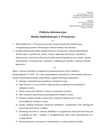 Załącznik do Uchwały nr 133/2015 Zarządu Banku Spółdzielczego w Przasnyszu z dnia 30.12.2015r. Załącznik do Uchwały nr 39/2015 Rady Nadzorczej Banku Spółdzielczego w Przasnyszu z dnia 30.12.2015r. Polityka informacyjna Banku Spółdzielczego w Przasnyszu §1 1. Bank Spółdzielczy w Przasnyszu prowadzi przejrzystą politykę informacyjną, uwzględniającą potrzeby informacyjne członków Banku oraz klientów. 2. Polityka informacyjna Banku Spółdzielczego w Przasnyszu, zwanego dalej Bankiem określa zakres, częstotliwość, formę i miejsce ogłaszania informacji o charakterze jakościowym i ilościowym dotyczących adekwatności kapitałowej oraz zasady i sposób zatwierdzenia i weryfikowania informacji podlegających zgodnie z niniejszą Polityka ogłoszeniu. §2 Bank w zakresie informacji wymaganych przepisami prawa ( Prawo bankowe, Rozporządzenie 575/2013 UE i inne rozporządzenia wykonawcze, rekomendacje nadzorcze, Zasady Ładu Korporacyjnego, Statut banku) ogłasza informacje obejmujące: 1) Strategię zarządzania poszczególnymi rodzajami ryzyka; 2) Opis procesów (w tym strukturę organizacyjną) zarządzania poszczególnymi rodzajami ryzyka; 3) Zasady stosowania polityki w zakresie zarządzania ryzykami; 4) Opis systemów raportowania poszczególnych rodzajów ryzyka; 5) Przyjęte w Banku metody wyznaczania wymogów kapitałowych z tytułu poszczególnych rodzajów ryzyka; 6) Zasady ustalania (Politykę) zmiennych składników wynagrodzeń osób zajmujących stanowiska kierownicze w Banku. 7) Informacje ilościowe w zakresie składników wynagradzania stanowisk kierowniczych w podziale na stałe i zmienne z uwzględnieniem ilości osób otrzymujących ww. wynagrodzenie. 8) Wartość płatności związanych z zatrudnieniem i z zakończeniem stosunku zatrudnienia dokonanych w danym roku obrotowym, liczbę osób otrzymujących takie płatności oraz najwyższą taką płatność na rzecz jednej osoby. 9) Informacja o sumach strat brutto z tytułu ryzyka operacyjnego odnotowanych w danym roku, w podziale na klasy zdarzeń, w tym co najmniej w podziale na kategorie zdarzeń w ramach rodzaju zdarzenia (zgodnie z załącznikiem nr 1 do Instrukcji zarządzania ryzykiem operacyjnym), oraz o tym, jakie działania mitygujące w związku z tym zostały podjęte w celu uniknięcia ich w przyszłości 10) Informacja o najpoważniejszych zdarzeniach operacyjnych, jakie wystąpiły w minionym roku – według uznania Banku, 11) Dodatkowe informacje wymagane przez Rozporządzenie 575/2013 UE, nie ujęte w Uchwale 385/2008 KNF: a) zasady oceny odpowiedniości członków Zarządu i Rady Nadzorczej (Regulamin działania Zarządu, Regulamin działania Rady Nadzorczej) zawierające politykę rekrutacji dotyczącą wyboru członków organu zarządzającego oraz rzeczywistego stanu ich wiedzy, umiejętności i wiedzy specjalistycznej oraz strategię w zakresie zróżnicowania w odniesieniu do wyboru członków organu zarządzającego, b) utworzenie (bądź nie) przez instytucję oddzielnego komitetu ds. ryzyka oraz liczby posiedzeń komitetu, które się odbyły. Regulamin Komitetu Kredytowego, Komitetu Zarządzania Ryzykami itp., c) bufory kapitałowe (art. 440), d) wskaźnik dźwigni finansowej (art. 451), 12) Informacje wymagane przez Rekomendację P (Rekomendacja 18), 13) Inne informacje określone w załączniku nr 1 do Instrukcji sporządzania i ujawniania informacji w Banku Spółdzielczym w Przasnyszu. §3 Bank dokonuje ujawnień w zakresie stosowania Zasad Ładu Korporacyjnego, w tym: 1) udostępnia na stronie internetowej informację o stosowaniu Zasad Ładu Korporacyjnego lub informację o odstąpieniu od stosowania w pełnym zakresie określonych zasad, 2) udostępnia na stronie internetowej podstawową strukturę organizacyjną, 3) ujawnia na stronie internetowej wyniki okresowej oceny stosowania Zasad dokonanej przez Radę Nadzorczą. §4 W zakresie informacji wymaganych przez przepisy art. 111 Ustawy Prawo bankowe Bank ogłasza: 1) stosowane stawki oprocentowania środków na rachunkach bankowych, kredytów i 2) 3) 4) 5) 6) 7) 8) 9) pożyczek, stosowane stawki prowizji i wysokość pobieranych opłat, terminy kapitalizacji odsetek, stosowane kursy walutowe, bilans z opinią biegłego rewidenta za ostatni okres podlegający badania skład Zarządu i Rady Nadzorczej Banku, nazwiska osób upoważnionych do zaciągania zobowiązań w imieniu Banku albo jednostki organizacyjnej Banku, obszar swojego działania, bank zrzeszający. §5 1. Informacje wymienione w § 2 i § 3 są ogłaszane w cyklach rocznych, termin ogłaszania ujawnianych informacji pokrywa się z terminem publikacji sprawozdań finansowych. 2. Informacje wymienione w § 4 są ogłaszane na bieżąco, w przypadki zmiany treści ogłaszanej informacji, Bank aktualizuje te informacje bez zbędnej zwłoki. §6 1. Informacje, o których mowa w § 2 są udostępniane wszystkim zainteresowanych w formie papierowej w Centrali Banku w Przasnyszu, ul. Słowackiego 1, w pokoju nr 4 w każdy poniedziałek w godzinach 900 – 1000. 2. Odpowiedzi na zapytania udziałowców oraz klientów udzielane są w formie: a) ustnej, w Centrali Banku w Przasnyszu, ul. Słowackiego 1, w pokoju nr 4 w każdy poniedziałek w godzinach 900 – 1000, b) papierowej w terminie 14 dni od daty wpłynięcia zapytania. 3. Informacje, o których mowa w § 3, w tym „Oświadczenie Zarządu Banku Spółdzielczego w Przasnyszu o stosowaniu „Zasad Ładu Korporacyjnego” wydanych przez Komisję Nadzoru Finansowego są udostępniane na stronie internetowej www.bsprzasnysz.pl. 4. Informacje, o których mowa w § 4 są udostępniane w placówkach Banku w formie informacja na tablicy ogłoszeń . §7 1. Treść ogłaszanych informacji wymienionych w § 2 oraz § 3 podlega zatwierdzeniu przez Zarząd oraz Radę Nadzorczą Banku przed ich publikacją . 2. Treść informacji ogłaszanych zgodnie z § 4 podlega zatwierdzeniu przez Zarząd. §8 1. Polityka 