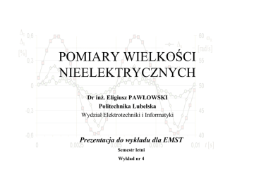 POMIARY WIELKOŚCI NIEELEKTRYCZNYCH Dr inż. Eligiusz PAWŁOWSKI Politechnika Lubelska Wydział Elektrotechniki i Informatyki Prezentacja do wykładu dla EMST Semestr letni Wykład nr 4 Prawo autorskie Niniejsze materiały podlegają ochronie zgodnie z Ustawą o prawie autorskim i prawach pokrewnych (Dz.U. 1994 nr 24 poz. 83 z późniejszymi zmianami). Materiał te udostępniam do celów dydaktycznych jako materiały pomocnicze do wykładu z przedmiotu Pomiary Wielkości Nieelektrycznych prowadzonego dla studentów Wydziału Elektrotechniki i Informatyki Politechniki Lubelskiej. Mogą z nich również korzystać inne osoby zainteresowane tą tematyką. Do tego celu materiały te można bez ograniczeń przeglądać, drukować i kopiować wyłącznie w całości. Wykorzystywanie tych materiałów bez zgody autora w inny sposób i do innych celów niż te, do których zostały udostępnione, jest zabronione. W szczególności niedopuszczalne jest: usuwanie nazwiska autora, edytowanie treści, kopiowanie fragmentów i wykorzystywanie w całości lub w części do własnych publikacji. Eligiusz Pawłowski PWN, tydzień 4 dr inż. Eligiusz Pawłowski 2 Uwagi dydaktyczne Niniejsza prezentacja stanowi tylko i wyłącznie materiały pomocnicze do wykładu z przedmiotu Pomiary Wielkości Nieelektrycznych prowadzonego dla studentów Wydziału Elektrotechniki i Informatyki Politechniki Lubelskiej. Udostępnienie studentom tej prezentacji nie zwalnia ich z konieczności sporządzania własnych notatek z wykładów ani też nie zastępuje samodzielnego studiowania obowiązujących podręczników. Tym samym zawartość niniejszej prezentacji w szczególności nie może być traktowana jako zakres materiału obowiązujący na kolokwium. Na kolkwium obowiązujący jest zakres materiału faktycznie wyłożony podczas wykładu oraz zawarty w odpowiadających mu fragmentach podręczników podanych w wykazie literatury do wykładu. Eligiusz Pawłowski PWN, tydzień 4 dr inż. Eligiusz Pawłowski 3 Tematyka wykładu Odkształcenia sprężyste Prawo Hooke’a Budowa i zasada działania tensometrów Układy pomiarowe tensometrów Zastosowania tensometrów PWN, tydzień 4 dr inż. Eligiusz Pawłowski 4 Działanie siły na element sprężysty ε= ∆L L ε - odkształcenie (wydłużenie względne) F σ= S σ - naprężenie (ciśnienie w N/m2 = Pa) Ciało wykazujące właściwości sprężyste pod wpływem działania siły zmienia swoje wymiary. PWN, tydzień 4 dr inż. Eligiusz Pawłowski 5 Prawo Hooke’a Naprężenie σ w materiale jest wprost proporcjonalne do wydłużenia względnego ε (odkształcenia) i do modułu sprężystości wzdłużnej materiału EY (modułu Younga): σ = EY ε EY – moduł Younga, moduł sprężystości wzdłużnej, stała materiałowa, dla stali równy ok. 200000MPa Prawo Hooke’a obowiązuje w zakresie odkształceń sprężystych. Za granicę sprężystości R0,2 przyjmuje się takie naprężenie, po osiągnięciu którego pozostaje odkształcenie jednostkowe nie przekraczające 0,2 o/oo. PWN, tydzień 4 dr inż. Eligiusz Pawłowski 6 Granica liniowości i sprężystości PWN, tydzień 4 dr inż. Eligiusz Pawłowski 7 Badania Poissona Okazuje się również, że ciało sprężyste wydłuża się w kierunku zgodnym z działającym naprężeniem i jednocześnie zmniejsza swój wymiar w kierunku prostopadłym. Badania Poissona wykazały, że : Stosunek µ odkształceń jednostkowych w kierunku równoległym ε || do działania naprężeń σ i w jakimkolwiek kierunku doń prostopadłym ε ⊥ jest wartością stałą dla jednorodnych ciał izotropowych. Są to ciała mające stałą gęstość oraz te same własności we wszystkich kierunkach. Stosunek µ nazywany jest liczbą Poissona. Dla metali waha się on w niewielkich granicach, przyjmuje się µ ≈ 0,3 PWN, tydzień 4 dr inż. Eligiusz Pawłowski 8 Liczba Poissona, współczynnik Poissona µ Element sprężysty pod wpływem naprężenia σ wydłuża się w kierunku (y) równoległym do σ i zwęża się w kierunku (x) prostopadłym do σ. ∆L L'− L ε || = = L L ∆D D'− D ε⊥ = = D D ε ⊥ = − µ ε || = − µ µ ≈ 0,3 PWN, tydzień 4 dr inż. Eligiusz Pawłowski σ E ∆D µ=− D ∆L L 9 Efekt tensometryczny w przewodnikach R=ρ l s Jak zmienia się rezystancja R rozciąganego przewodu? Po zlogarytmowaniu i zróżniczkowaniu otrzymamy: ∆R ∆l ∆s ∆ρ = − + R l s ρ ∆s ∆r =2 s =π r ⇒ s r 2 s = π r2 Podstawiamy i otrzymujemy: ∆R ∆l ∆r ∆ρ = −2 + R l r ρ PWN, tydzień 4 dr inż. Eligiusz Pawłowski 10 Stała tensometryczna kt , stała tensometru Wprowadzamy oznaczenie kt - współczynnik czułości odkształceniowej, stała tensometryczna: ∆R ∆R kt = R = R ∆l ε l Względna zamiana rezystancji Względna zamiana długości - odkształcenie Współczynnik czułości odkształceniowej, stała tensometryczna kt opisuje zależność względnej zmiany rezystancji ∆R/R drutu oporowego od odkształcenia ε jakiemu ten drut poddano. Jeśli drut odpowiednio ukształtowano i wykonano z niego tensometr o długości l (którą nazywamy bazą tensometru) to powyższy wzór określa również stałą tensometru kt . PWN, tydzień 4 dr inż. Eligiusz Pawłowski 11 Efekt tensometryczny w przewodnikach c.d. Uwzględniając wcześniejsze zależności, współczynnik czułości odkształceniowej kt (stała tensometryczna, stała tensometru) może być zapisana: ∆R ∆r ∆ρ ρ kt = R = 1 − 2 r + ∆l ∆l ∆l l l l Zauważamy, że we wzorze występuje współczynnik Poissona µ ∆r − r =µ ∆l l PWN, tydzień 4 dr inż. Eligiusz Pawłowski 12 Efekt tensometryczny w przewodnikach c.d. Ostatecznie otrzymamy zależność na kt - stałą tensometryczną: ∆ρ kt = 1 + 2 µ + ρ ε Ponieważ współczynnik Poissona µ przeciętnie wynosi: µ ≈ 0,3 to stała tensometryczna na kt w praktyce zawiera się w przedziale około od 2 do 4 dla stosowanych w praktyce materiałów. kt ≈ 2 .. 4 PWN