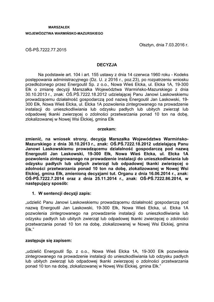 MARSZAŁEK WOJEWÓDZTWA WARMIŃSKO-MAZURSKIEGO Olsztyn, dnia 7.03.2016 r. OŚ-PŚ.7222.77.2015 DECYZJA Na podstawie art. 104 i art. 155 ustawy z dnia 14 czerwca 1960 roku - Kodeks postępowania administracyjnego (Dz. U. z 2016 r., poz.23), po rozpatrzeniu wniosku przedłożonego przez Energoutil Sp. z o.o., Nowa Wieś Ełcka, ul. Ełcka 1A, 19-300 Ełk o zmianę decyzji Marszałka Województwa Warmińsko-Mazurskiego z dnia 30.10.2013 r., znak: OŚ.PŚ.7222.18.2012 udzielającej Panu Janowi Laskowskiemu prowadzącemu działalność gospodarczą pod nazwą Energoutil Jan Laskowski, 19300 Ełk, Nowa Wieś Ełcka, ul. Ełcka 1A pozwolenia zintegrowanego na prowadzenie instalacji do unieszkodliwiania lub odzysku padłych lub ubitych zwierząt lub odpadowej tkanki zwierzęcej o zdolności przetwarzania ponad 10 ton na dobę, zlokalizowanej w Nowej Wsi Ełckiej, gmina Ełk orzekam: zmienić, na wniosek strony, decyzję Marszałka Województwa WarmińskoMazurskiego z dnia 30.10.2013 r., znak: OŚ.PŚ.7222.18.2012 udzielającą Panu Janowi Laskowskiemu prowadzącemu działalność gospodarczą pod nazwą Energoutil Jan Laskowski, 19-300 Ełk, Nowa Wieś Ełcka, ul. Ełcka 1A pozwolenia zintegrowanego na prowadzenie instalacji do unieszkodliwiania lub odzysku padłych lub ubitych zwierząt lub odpadowej tkanki zwierzęcej o zdolności przetwarzania ponad 10 ton na dobę, zlokalizowanej w Nowej Wsi Ełckiej, gmina Ełk, zmienioną decyzjami tut. Organu z dnia 16.06.2014 r., znak: OŚ-PŚ.7222.7.2014 oraz z dnia 25.11.2014 r., znak: OŚ-PŚ.7222.86.2014, w następujący sposób: 1. W sentencji decyzji zapis: „udzielić Panu Janowi Laskowskiemu prowadzącemu działalność gospodarczą pod nazwą Energoutil Jan Laskowski, 19-300 Ełk, Nowa Wieś Ełcka, ul. Ełcka 1A pozwolenia zintegrowanego na prowadzenie instalacji do unieszkodliwiania lub odzysku padłych lub ubitych zwierząt lub odpadowej tkanki zwierzęcej o zdolności przetwarzania ponad 10 ton na dobę, zlokalizowanej w Nowej Wsi Ełckiej, gmina Ełk.” zastępuje się zapisem: „udzielić Energoutil Sp. z o.o., Nowa Wieś Ełcka 1A, 19-300 Ełk pozwolenia zintegrowanego na prowadzenie instalacji do unieszkodliwiania lub odzysku padłych lub ubitych zwierząt lub odpadowej tkanki zwierzęcej o zdolności przetwarzania ponad 10 ton na dobę, zlokalizowanej w Nowej Wsi Ełckiej, gmina Ełk.” 2. W treści decyzji, w każdym miejscu decyzji, w którym pojawia się zapis: „Energoutil Jan Laskowski, ul. Ełcka 1 A, 19-300 Ełk” zastępuje się go zapisem: „Energoutil Sp. z o.o., Nowa Wieś Ełcka, ul. Ełcka 1A, 19-300 Ełk” 3. W rozdziale II, punkcie 2.1.1., tabele nr 6 a i 6b otrzymują brzmienie: Tabela nr 6a Rodzaje i masa odpadów przewidzianych do przetworzenia w procesie unieszkodliwiania D9 (wstępnego suszenia materiału kierowanego do spalenia w procesie D10) w ciągu roku Lp. Kod odpadu Rodzaj odpadu Masa odpadów [Mg/rok] 1) 02 01 02 Odpadowa tkanka zwierzęca 02 01 80* Zwierzęta padłe i ubite z konieczności oraz odpadowa tkanka zwierzęca, wykazujące właściwości niebezpieczne 1850,000 3. 02 01 81 Zwierzęta padłe i odpadowa tkanka zwierzęca stanowiące materiał szczególnego i wysokiego ryzyka inne niż wymienione w 02 01 80 1950,0 4. 02 01 82 Zwierzęta padłe i ubite z konieczności 3960,0 02 02 01 Odpady z mycia i przygotowywania surowców 360,0 6. 02 02 02 Odpadowa tkanka zwierzęca 7800,0 7. 02 02 03 Surowce i produkty nienadające się do spożycia i przetwórstwa 2800,0 1. 2. 5. Osady z zakładowych oczyszczalni ścieków 520,0 8. 02 02 04 9. 02 02 80* Odpadowa tkanka zwierzęca wykazująca właściwości niebezpieczne 910,000 02 02 81 Odpadowa tkanka zwierzęca stanowiąca materiał szczególnego i wysokiego ryzyka, w tym odpady z 9750,0 10. Sposób zagospodarowania odpadów 3250,0 D9 – obróbka fizycznochemiczna, niewymieniona w innej pozycji niniejszego załącznika, w wyniku której powstają ostateczne związki lub mieszaniny unieszkodliwiane za pomocą któregokolwiek spośród procesów wymienionych w pozycjach D1 – D12 (np. odparowanie, suszenie, kalcynacja itp.) produkcji pasz mięsno-kostnych inne niż wymienione w 02 02 80 Inne niewymienione odpady 11. 02 02 99 630,0 12. 02 05 01 Surowce i produkty nieprzydatne do spożycia oraz przetwarzania 320,0 13. 19 06 06 Przefermentowane odpady z beztlenowego rozkładu odpadów zwierzęcych i roślinnych 1040,0 19 08 01 Skratki 660,0 19 08 09 Tłuszcze i mieszaniny olejów z separacji olej/woda zawierające wyłącznie oleje jadalne i tłuszcze 110,0 20 01 08 Odpady kuchenne ulegające biodegradacji 500,0 20 01 25 Oleje i tłuszcze jadalne 300,0 14. 15. 16. 17. * W tabeli określono maksymalną masę odpadów poszczególnych rodzajów przewidzianych do przetworzenia w procesie D9 w ciągu roku, z zastrzeżeniem, że łączna masa odpadów przewidzianych do przetwarzania w procesie D9 nie przekroczy 40 Mg/dobę i 14600 Mg/rok. Tabela nr 6b Rodzaje i masa odpadów przewidzianych do przetworzenia w procesie unieszkodliwiania D10 w ciągu roku Lp. Kod odpadu Rodzaj odpadu Masa odpadów [Mg/rok] 1. 2. 3. 4. 02 01 02 Odpadowa tkanka zwierzęca 400,0 02 01 06 Odchody zwierzęce 200,0 02 01 80* Zwierzęta padłe i ubite z konieczności oraz odpadowa tkanka zwierzęca, wykazujące właściwości niebezpieczne 02 01 81 Zwierzęta padłe i odpadowa tkanka zwierzęca stanowiące materiał szczególnego i wysokiego ryzyka inne niż wymienione w 02 01 80 1600,000 1500,0 Sposób zagospodarowania odpadów D10 – przekształcanie termiczne na lądzie 02 01 82 Zwierzęta padłe i ubite z konieczności 3050,0 6. 02 02 01 Odpady z mycia i przygotowywania surowców 300,0 7. 02 02 02 Odpadowa tkanka zwierzęca 6000,0 02 02 03 Surowce i produkty nienadające się do spożycia i przetwórstwa 2400,0 9. 02 02 04 Osady z zakładowych oczyszczalni ścieków 2500,00 10. 02 02 80* Odpadowa tkanka zwierzęca wykazująca właściwości niebezpieczne 700,000 11. 02 02 81 Odpadowa