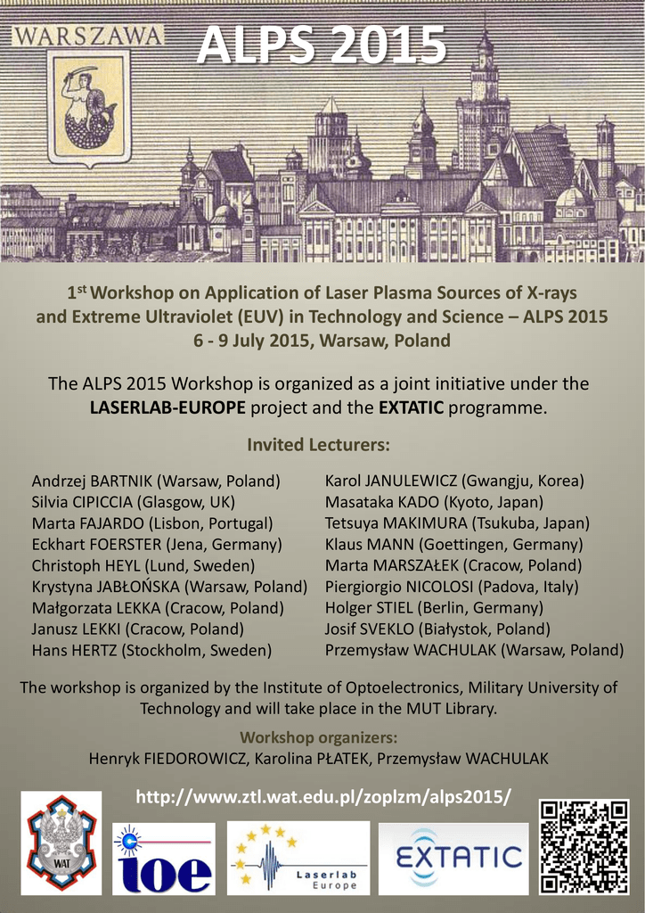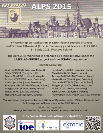 ALPS 2015 1st Workshop on Application of Laser Plasma Sources of X-rays and Extreme Ultraviolet (EUV) in Technology and Science – ALPS 2015 6 - 9 July 2015, Warsaw, Poland The ALPS 2015 Workshop is organized as a joint initiative under the LASERLAB-EUROPE project and the EXTATIC programme. Invited Lecturers: Andrzej BARTNIK (Warsaw, Poland) Silvia CIPICCIA (Glasgow, UK) Marta FAJARDO (Lisbon, Portugal) Eckhart FOERSTER (Jena, Germany) Christoph HEYL (Lund, Sweden) Krystyna JABŁOŃSKA (Warsaw, Poland) Małgorzata LEKKA (Cracow, Poland) Janusz LEKKI (Cracow, Poland) Hans HERTZ (Stockholm, Sweden) Karol JANULEWICZ (Gwangju, Korea) Masataka KADO (Kyoto, Japan) Tetsuya MAKIMURA (Tsukuba, Japan) Klaus MANN (Goettingen, Germany) Marta MARSZAŁEK (Cracow, Poland) Piergiorgio NICOLOSI (Padova, Italy) Holger STIEL (Berlin, Germany) Josif SVEKLO (Białystok, Poland) Przemysław WACHULAK (Warsaw, Poland) The workshop is organized by the Institute of Optoelectronics, Military University of Technology and will take place in the MUT Library. Workshop organizers: Henryk FIEDOROWICZ, Karolina PŁATEK, Przemysław WACHULAK http://www.ztl.wat.edu.pl/zoplzm/alps2015/