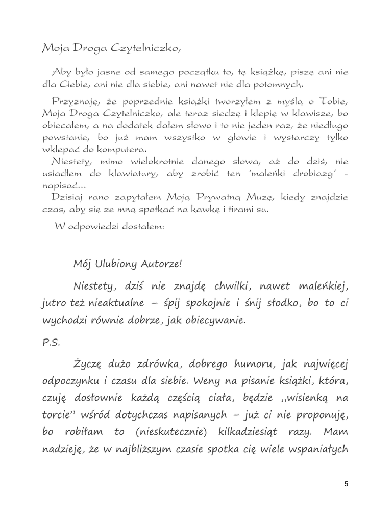 Moja Droga Czytelniczko, Aby było jasne od samego początku to, tę książkę, piszę ani nie dla Ciebie, ani nie dla siebie, ani nawet nie dla potomnych. Przyznaję, że poprzednie książki tworzyłem z myślą o Tobie, Moja Droga Czytelniczko, ale teraz siedzę i klepię w klawisze, bo obiecałem, a na dodatek dałem słowo i to nie jeden raz, że niedługo powstanie, bo już mam wszystko w głowie i wystarczy tylko wklepać do komputera. Niestety, mimo wielokrotnie danego słowa, aż do dziś, nie usiadłem do klawiatury, aby zrobić ten ‘maleńki drobiazg’ napisać... Dzisiaj rano zapytałem Moją Prywatną Muzę, kiedy znajdzie czas, aby się ze mną spotkać na kawkę i tirami su. W odpowiedzi dostałem: Mój Ulubiony Autorze! Niestety, dziś nie znajdę chwilki, nawet maleńkiej, jutro też nieaktualne – śpij spokojnie i śnij słodko, bo to ci wychodzi równie dobrze, jak obiecywanie. P.S. Życzę dużo zdrówka, dobrego humoru, jak najwięcej odpoczynku i czasu dla siebie. Weny na pisanie książki, która, czuję dosłownie każdą częścią ciała, będzie „wisienką na torcie” wśród dotychczas napisanych – już ci nie proponuję, bo robiłam to (nieskutecznie) kilkadziesiąt razy. Mam nadzieję, że w najbliższym czasie spotka cię wiele wspaniałych 5 wrażeń i niezapomnianych wspomnień, albo kolorowych snów, jeśli spanie jest jedynym dla ciebie cennym zajęciem. Do zobaczenia w chwili, gdy pokażesz mi (od dawna, dziesiatki razy obiecywany) rękopis. Muza Zrozumiałem, że nie będzie ani kawki, ani ciasteczka, ani nawet spotkania, tak długo, aż nie wstanę i nie napiszę chociaż kilkudziesięciu stron, jako dowód mojej bardzo dobrej woli. A więc usiadłem na (…) krześle i piszę! Tworząc poprzednią książkę oczekiwałem, że gdy ją łykniesz i cię poruszy, rozśmieszy, zbulwersuje, zachwyci, albo nawet rozzłości, to z wdzięczności za te emocje, które wywołała, napiszesz, do mnie, choć kilka słów. Odczułem dotkliwie, że każde oczekiwanie jest prostą drogą do rozczarowania. Tym razem nie zależy mi zbytnio na tym, aby się kiedykolwiek dowiedzieć, od Ciebie, Moja Droga Czytelniczko, czy ta książka Ci się spodobała, czy zachwyciła, czy zaczarowała, czy może nie zauważyłaś nawet, ile cennych myśli zmieściłem między wierszami, a gorących uczuć między słowami – bo przecież, nie dla Ciebie ją tworzę… Twój szanowny osąd, dzisiaj zszedł na drugi plan, a może nawet na dalszy, bo kilku Wiernym Czytelniczkom Potrafiącym Pisać Swoje Wrażenia udostępnię właśnie tworzony rękopis. Teraz tęsknię ogromnie za chwilą, gdy znów zobaczę uśmiech Mojej Prywatnej Muzy i usłyszę jej cudne: „Zawsze wierzyłam w ciebie!” Dość tłumaczenia! Wracam do pisania, życząc Ci ogromnie dużo radości, podczas czytania tej książki. Miej jej nawet więcej, niż ja miałem, tworząc ją – pozwalam Ci :) Andrzej Setman :)