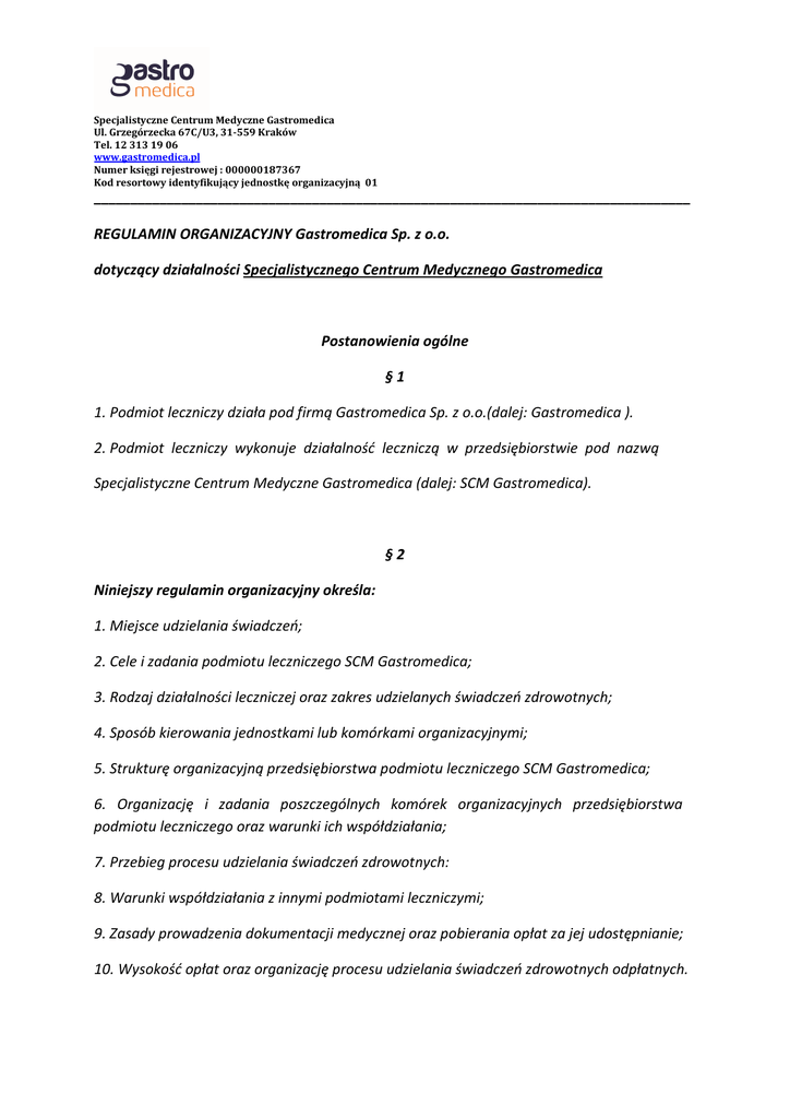Specjalistyczne Centrum Medyczne Gastromedica Ul. Grzegórzecka 67C/U3, 31-559 Kraków Tel. 12 313 19 06 www.gastromedica.pl Numer księgi rejestrowej : 000000187367 Kod resortowy identyfikujący jednostkę organizacyjną 01 __________________________________________________________________________________ REGULAMIN ORGANIZACYJNY Gastromedica Sp. z o.o. dotyczący działalności Specjalistycznego Centrum Medycznego Gastromedica Postanowienia ogólne §1 1. Podmiot leczniczy działa pod firmą Gastromedica Sp. z o.o.(dalej: Gastromedica ). 2. Podmiot leczniczy wykonuje działalność leczniczą w przedsiębiorstwie pod nazwą Specjalistyczne Centrum Medyczne Gastromedica (dalej: SCM Gastromedica). §2 Niniejszy regulamin organizacyjny określa: 1. Miejsce udzielania świadczeń; 2. Cele i zadania podmiotu leczniczego SCM Gastromedica; 3. Rodzaj działalności leczniczej oraz zakres udzielanych świadczeń zdrowotnych; 4. Sposób kierowania jednostkami lub komórkami organizacyjnymi; 5. Strukturę organizacyjną przedsiębiorstwa podmiotu leczniczego SCM Gastromedica; 6. Organizację i zadania poszczególnych komórek organizacyjnych przedsiębiorstwa podmiotu leczniczego oraz warunki ich współdziałania; 7. Przebieg procesu udzielania świadczeń zdrowotnych: 8. Warunki współdziałania z innymi podmiotami leczniczymi; 9. Zasady prowadzenia dokumentacji medycznej oraz pobierania opłat za jej udostępnianie; 10. Wysokość opłat oraz organizację procesu udzielania świadczeń zdrowotnych odpłatnych. Specjalistyczne Centrum Medyczne Gastromedica Ul. Grzegórzecka 67C/U3, 31-559 Kraków Tel. 12 313 19 06 www.gastromedica.pl Numer księgi rejestrowej : 000000187367 Kod resortowy identyfikujący jednostkę organizacyjną 01 __________________________________________________________________________________ Miejsce udzielania świadczeń §3 1. SCM Gastromedica udziela świadczeń zdrowotnych w pomieszczeniach przedsiębiorstwa podmiotu leczniczego, pod adresem: ul. Grzegórzecka 67C/U3, 31-559 Kraków. Cele i zadania podmiotu leczniczego SCM Gastromedica §4 1. Celem SCM Gastromedica jest podejmowanie działań na rzecz ochrony i poprawy stanu zdrowia ludności poprzez organizowanie i prowadzenie działalności leczniczej, profilaktycznej, stałe podnoszenie poziomu świadczonych usług oraz propagowanie zachowań prozdrowotnych. 2. Do zadań SCM Gastromedica należy w szczególności udzielanie świadczeń zdrowotnych z zakresu ambulatoryjnej specjalistycznej opieki zdrowotnej oraz opieki pielęgniarskiej w warunkach ambulatoryjnych. Rodzaj działalności leczniczej oraz zakres udzielanych świadczeń zdrowotnych §5 1. SCM Gastromedica prowadzi działalność leczniczą w zakresie ambulatoryjnych świadczeń zdrowotnych. 2. Zakres świadczeń udzielanych przez SCM Gastromedica obejmuje: a) badania diagnostyczne wykonywane w celu rozpoznania stanu zdrowia i ustalenia dalszego postępowania leczniczego, Specjalistyczne Centrum Medyczne Gastromedica Ul. Grzegórzecka 67C/U3, 31-559 Kraków Tel. 12 313 19 06 www.gastromedica.pl Numer księgi rejestrowej : 000000187367 Kod resortowy identyfikujący jednostkę organizacyjną 01 __________________________________________________________________________________ b) konsultacje lekarskie w ramach specjalności określonych w § 8 niniejszego Regulaminu, c) zabiegi medyczne wykonywane w poradni chirurgii ogólnej, a także w ramach gabinetu diagnostyczno-zabiegowego. Sposób kierowania jednostkami lub komórkami organizacyjnymi §6 1. SCM Gastromedica jest kierowane przez Kierownika SCM Gastromedica. 2. Kierownik SCM Gastromedica wykonuje wszystkie obowiązki i prawa, jakie na podmiot leczniczy nakładają powszechnie obowiązujące przepisy prawa, prowadzi sprawy oraz reprezentuje podmiot leczniczy na zewnątrz. 3. Zarząd Gastromedica Sp. z o.o. upoważnia Kierownika SCM Gastromedica do podejmowania w jego imieniu decyzji związanych z bieżącą działalnością SCM Gastromedica, w tym w szczególności do: 1) Zarządzania personelem SCM Gastromedica, w tym do określania obowiązków, kompetencji i uprawnień poszczególnych osób, 2) Zatwierdzania procedur, instrukcji i innych wewnętrznych aktów normatywnych, za wyjątkiem Regulaminu Organizacyjnego SCM Gastromedica. Specjalistyczne Centrum Medyczne Gastromedica Ul. Grzegórzecka 67C/U3, 31-559 Kraków Tel. 12 313 19 06 www.gastromedica.pl Numer księgi rejestrowej : 000000187367 Kod resortowy identyfikujący jednostkę organizacyjną 01 __________________________________________________________________________________ Struktura organizacyjna §7 1. Strukturę organizacyjną przedsiębiorstwa podmiotu leczniczego tworzą: Centrum Medyczne SCM Gastromedica, jako jednostka organizacyjna wraz z komórkami organizacyjnymi: 1) Gabinet diagnostyczno - zabiegowy 2) Poradnia kardiologiczna 3) Poradnia otolaryngologiczna 4) Poradnia gastroenterologiczna 5) Poradnia chirurgii ogólnej 6) Poradnia chirurgii urazowo-ortopedycznej 7) Poradnia immunologiczna 9) Poradnia zdrowia psychicznego 10) Poradnia dermatologiczna 11) Poradnia żywieniowa 12) Poradnia onkologiczna 13) Poradnia ginekologiczna 14) Poradnia urologiczna 15) Poradnia urologiczna dla dzieci 16) Poradnia endokrynologiczna 17) Poradnia neurologiczna 18) Poradnia neurochirurgiczna 19) Poradnia leczenia bólu Specjalistyczne Centrum Medyczne Gastromedica Ul. Grzegórzecka 67C/U3, 31-559 Kraków Tel. 12 313 19 06 www.gastromedica.pl Numer księgi rejestrowej : 000000187367 Kod resortowy identyfikujący jednostkę organizacyjną 01 __________________________________________________________________________________ Organizacja i zadania poszczególnych komórek organizacyjnych przedsiębiorstwa podmiotu leczniczego oraz warunki ich współdziałania §8 1. Do zadań komórek organizacyjnych wymienionych w § 7 ust.1 należy sprawowanie kompleksowej opieki nad pacjentami poprzez wykonywanie świadczeń zdrowotnych w zakresie lecznictwa ambulatory