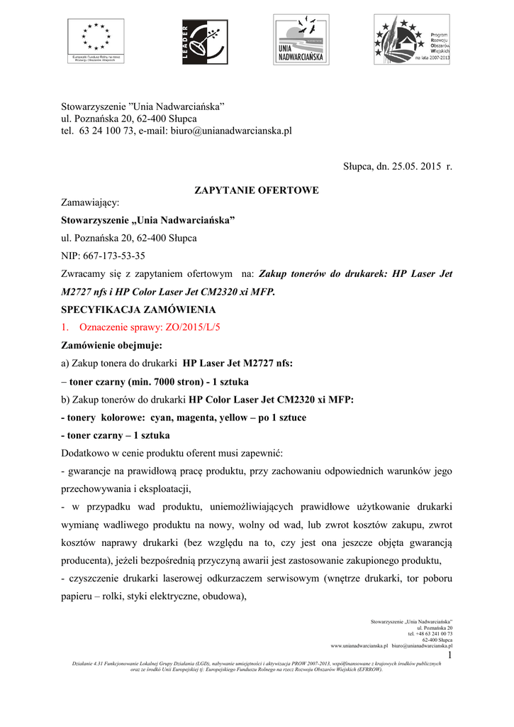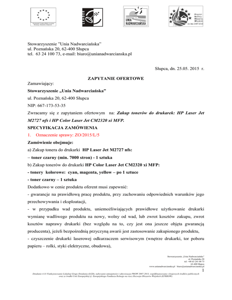 Stowarzyszenie ”Unia Nadwarciańska” ul. Poznańska 20, 62-400 Słupca tel. 63 24 100 73, e-mail: [email protected] Słupca, dn. 25.05. 2015 r. ZAPYTANIE OFERTOWE Zamawiający: Stowarzyszenie „Unia Nadwarciańska” ul. Poznańska 20, 62-400 Słupca NIP: 667-173-53-35 Zwracamy się z zapytaniem ofertowym na: Zakup tonerów do drukarek: HP Laser Jet M2727 nfs i HP Color Laser Jet CM2320 xi MFP. SPECYFIKACJA ZAMÓWIENIA 1. Oznaczenie sprawy: ZO/2015/L/5 Zamówienie obejmuje: a) Zakup tonera do drukarki HP Laser Jet M2727 nfs: toner czarny (min. 7000 stron) - 1 sztuka b) Zakup tonerów do drukarki HP Color Laser Jet CM2320 xi MFP: - tonery kolorowe: cyan, magenta, yellow – po 1 sztuce - toner czarny – 1 sztuka Dodatkowo w cenie produktu oferent musi zapewnić: - gwarancje na prawidłową pracę produktu, przy zachowaniu odpowiednich warunków jego przechowywania i eksploatacji, - w przypadku wad produktu, uniemożliwiających prawidłowe użytkowanie drukarki wymianę wadliwego produktu na nowy, wolny od wad, lub zwrot kosztów zakupu, zwrot kosztów naprawy drukarki (bez względu na to, czy jest ona jeszcze objęta gwarancją producenta), jeżeli bezpośrednią przyczyną awarii jest zastosowanie zakupionego produktu, - czyszczenie drukarki laserowej odkurzaczem serwisowym (wnętrze drukarki, tor poboru papieru – rolki, styki elektryczne, obudowa), Stowarzyszenie „Unia Nadwarciańska” ul. Poznańska 20 tel. +48 63 241 00 73 62-400 Słupca www.unianadwarcianska.pl [email protected] 1 Działanie 4.31 Funkcjonowanie Lokalnej Grupy Działania (LGD), nabywanie umiejętności i aktywizacja PROW 2007-2013, współfinansowane z krajowych środków publicznych oraz ze środkó Unii Europejskiej tj: Europejskiego Funduszu Rolnego na rzecz Rozwoju Obszarów Wiejskich (EFRROW). - utylizację zużytych tonerów, - ekspertyzę uszkodzonej drukarki, - drukarkę zastępczą na czas naprawy drukarki klienta 2. Oferty należy przesłać na adres biura Stowarzyszenie „Unia Nadwarciańska”, ul. Dworcowa 62, 62-400 Słupca lub na adres e-mail: [email protected], do dnia 29 maja 2015 r. (decyduje data wpływu). 2. Zawartość oferty: 3.1 wypełniony formularz ofertowy. Termin realizacji: czerwiec 2015 r. 3. Zamawiający dokona wyboru oferty według kryterium cenowego z najniższą zaproponowaną przez oferenta ceną. 4. Do kontaktów z wykonawcami upoważniona jest: Iwona Suszka, tel. tel. (63) 241-00-73 5. Lista załączników: 5.1. formularz ofertowy – Załącznik nr 1 Stowarzyszenie „Unia Nadwarciańska” ul. Poznańska 20 tel. +48 63 241 00 73 62-400 Słupca www.unianadwarcianska.pl [email protected] 2 Działanie 4.31 Funkcjonowanie Lokalnej Grupy Działania (LGD), nabywanie umiejętności i aktywizacja PROW 2007-2013, współfinansowane z krajowych środków publicznych oraz ze środkó Unii Europejskiej tj: Europejskiego Funduszu Rolnego na rzecz Rozwoju Obszarów Wiejskich (EFRROW).