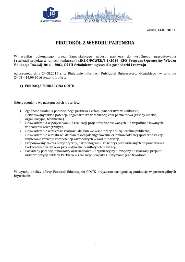 Gdańsk, 14/09/2016 r. PROTOKÓŁ Z WYBORU PARTNERA W wyniku dokonanego przez Zamawiającego naboru partnera do wspólnego przygotowania i realizacji projektu w ramach konkursu: 4/SK2.0/POWER/3.1/2016 EFS Program Operacyjny Wiedza Edukacja Rozwój 2014 – 2002, Oś III Szkolnictwo wyższe dla gospodarki i rozwoju ogłoszonego dnia 24.08.2016 r. w Biuletynie Informacji Publicznej Uniwersytetu Gdańskiego w terminie 24.08 – 14.09.2016 złożono 1 ofertę: 1) FUNDACJA EDUKACYJNA ODiTK Ofertę oceniono wg następujących kryteriów: 1. Zgodność działania potencjalnego partnera z celami partnerstwa w konkursie, 2. Deklarowany wkład potencjalnego partnera w realizację celu partnerstwa (zasoby ludzkie, organizacyjne, techniczne), 3. Doświadczenia w pozyskiwaniu i realizacji projektów finansowanych lub współfinansowanych ze środków zewnętrznych, 4. Doświadczenie w zakresie realizacji działań we współpracy z dużą uczelnią publiczną, 5. Doświadczenie w realizacji działań takich jak angażowanie członków lokalnej społeczności czy wspieranie rozwoju kompetencji zawodowych wśród młodzieży; 6. Proponowany zakres merytoryczny, harmonogram i kosztorys przewidzianych do powierzenia Partnerowi działań oraz przewidywane rezultaty ich realizacji. 7. Posiadany potencjał finansowy oraz kadrowo – organizacyjny niezbędny do realizacji projektu oraz propozycja wkładu Partnera w realizacje projektu i utrzymanie jego trwałości. W wyniku analizy oferty Fundacji Edukacyjnej ODiTK przyznano następującą punktację w poszczególnych kryteriach: 1 Kryterium/liczba punktów Uzasadnienie Kryterium dostępu 1/1 1. Zgodność działania partnera z celami partnerstwa. Celem fundacji jest prowadzenie działań na rzecz budowania społeczeństwa partycypacyjnego, włączającego i proinnowacyjnego. Rozwijają kompetencje społeczne i obywatelskie. Posiadają 35-letnie doświadczenie w działaniach przenosząc doświadczenia zdobyte w biznesie do rzeczywistości szkół, uczelni i ngo. Liczba punktów: 4/4 2. Deklarowany wkład realizację Projektu potencjalnego Partnera w Partner posiada niezbędne zasoby kadrowe w zakresie doświadczonej kadry merytorycznej oraz kadry zarządzającej potwierdzone odpowiednimi kwalifikacjami. Przedstawił również potencjał instytucjonalny w realizacji przewidzianych działań w projekcie. Liczba punktów: 4/8 3. Doświadczenie w realizowanych projektach o podobnym charakterze w okresie ostatnich dwóch lat – preferowana będzie firma, zajmująca się wytwarzaniem oprogramowania. Fundacja Edukacyjna ODiTK współpracuje z wieloma podmiotami w realizowaniu projektów o podobnym charakterze – ProjektA ja chcę być…, Przedsiębiorczy uczeń Liczba punktów: 8/8 4. Doświadczenie w zakresie realizacji we współpracy z dużą uczelnią publiczną. działań Realizacja wykładów, konferencji oraz projektów szkoleniowo – doradczych. Liczba punktów: 6/6 5. Doświadczenie w realizacji działań takich jak angażowanie członków lokalnej społeczności czy wspieranie rozwoju kompetencji zawodowych wśród młodzieży. W ofercie zostało przedstawione odpowiednie doświadczenie w realizacje działań angażujących członków lokalnej społeczności – Projekty „A ja chce być…”, „Przedsiębiorczy uczeń – symulacyjna gra edukacyjna”. Liczba punktów: 8/8 6. Proponowany zakres merytoryczny, harmonogram i kosztorys przewidzianych do powierzenia Partnerowi działań oraz przewidywane rezultaty ich realizacji. Oferent przedstawił interesujący i innowacyjny wkład w planowany harmonogram projektu poprzez realizację Chemicznych dni nauki. Liczba punktów: 8/8 7. Posiadany potencjał finansowy oraz kadrowo – organizacyjny niezbędny do realizacji projektu oraz propozycja wkładu Partnera w realizacje projektu i utrzymanie jego trwałości Łączna liczba punktów: Przedstawiony potencjał wystarczający. 31/35 W wyniku oceny złożonych ofert wybrano ofertę następującego podmiotu: 1) Fundacja Edukacyjna ODiTK 2