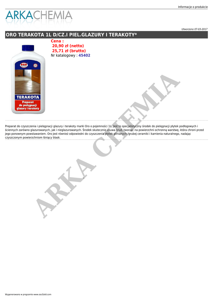Informacje o produkcie Utworzono 07-03-2017 ORO TERAKOTA 1L D/CZ.I PIEL.GLAZURY I TERAKOTY* Cena : 20,90 zł (netto) 25,71 zł (brutto) H EM IA Nr katalogowy : 45402 AR K A C Preparat do czyszczenia i pielęgnacji glazury i terakoty marki Oro o pojemności 1L. Jest to specjalistyczny środek do pielęgnacji płytek podłogowych i ściennych zarówno glazurowanych, jak i nieglazurowanych. Środek skutecznie usuwa brud, tworząc na powierzchni ochronną warstwę, która chroni przed jego ponownym powstawaniem. Oro jest również odpowiedni do czyszczenia płytek glinianych, grubej ceramiki i kamienia naturalnego, nadając czyszczonym powierzchniom lśniący blask. Wygenerowano w programie www.oscGold.com