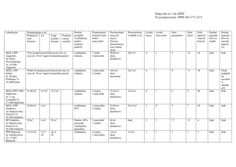 Załącznik nr 1 do SIWZ Nr postępowania: BWK-KG-271-3/13 Lokalizacja Powierzchnia w m² Pomieszcz wc enia biurowe Ciągi komuni kacyjne Pomiesz czenia socjalne Rodzaj posadzki (wykładziny, panele, terakota, parkiet) Wyposażenie łazienki (ilość toalet, umywalek) Powierzchnia okien do mycia (liczona dwustronnie) oraz rodzaj okien 49,68 m² okna plastikowe Powierzchnia vertikali w m² Liczba koszy Liczba niszczarek Ilość grzejników Ilość drzwi Ilość tapicero wanych krzeseł Rodzaj pojemni ków na mydło Rodzaj pojemni ków na ręcznik papiero wy 20,5 m² 6 1 4 12 36 brak brak MCK i PPP Augustów, Al. Kard. Wyszyńskiego 3a, 16-300 Augustów MCK i PPP Kolno, ul. Wojska Polskiego 31, 18-500 Kolno 59 m2 pomieszczeń biurowych oraz wc oraz ok. 10 m2 ciągów komunikacyjnych wykładzina terakota 7 toalet 4 umywalki 94,80 m2 pomieszczeń biurowych oraz wc oraz ok. 20 m2 ciągów komunikacyjnych wykładzina terakota 2 umywalki 3 toalety 64,9 m² okna drewniane 22,5 m² 8 1 8 11 30 brak MCK, PPP i OSZ Hajnówka, ul. 11-go Listopada 24, 17-200 Hajnówka MCK i PPP Zambrów, ul. Papieża Jana Pawła II 14, 18-300 Zambrów HP Zambrów, ul. Papieża Jana Pawła II 14, 18-300 Zambrów PPP Białystok, ul. Sienkiewicza 22, 15-092 Białystok 81,40 m2 4,5 m2 12,5 m2 - wykładziny terakota 2 toalety 2 umywalki 22,20 m2 okna plastikowe 14,4 m² 6 1 6 9 40 brak Flash podajnik do ręcznikó w składan ych brak 65,84 m2 8 m2 - - wykładzina PCV 1 umywalka 2 toalety 25,68 m² okna plastikowe 24,33 m² 3 0 5 7 44 brak brak 50 m2 6 m2 28 m2 - 2 umywalki 1 toaleta 60 m² okna plastikowe brak 3 2 17 15 4 brak brak 12,75 m2 2,77 m2 ok. 6 m2 - Parkiet -20%, pozostałe wykładzinagumoleon wykładzina 2 toalety 1 umywalka 3,8 m² okna plastikowe, 3,5 m² 1 1 2 1 3 brak brak MCK Bielsk Podlaski, ul. Szkolna 12, 17-100 Bielsk Podlaski 48 m2 pomieszczeń biurowych oraz wc wykładzina Dwie łazienki, 2 toalety, 2 umywalki 20,9 m² okna pcv 13,68 m² 1 1 2 1 31 Katrin pojemni k plastiko wy MCK Łapy, ul. Główna 8, 18-100 Łapy OSZ Łapy, ul. Leśnikowska 54, 18-100 Łapy 48 m2 pomieszczeń biurowych oraz wc oraz ok. 8 m2 ciągów komunikacyjnych wykładzina 1 umywalka, 1 toaleta 36 m² okna plastikowe, 22,05 m² 1 1 6 3 31 brak 38 m2 pomieszczeń biurowych oraz wc oraz ok. 6 m2 ciągów komunikacyjnych wykładzina 1 toaleta 1 umywalka 15,5m2 okna drewniane 9,7 m² 1 0 2 1 16 Kimberl y- Clark Kimberl y- Clark – papier w rolce MCK i PPP Wysokie Mazowiecki, ul. Rynek Piłsudskiego 23, 18-200 Wysokie Mazowieckie CEiPM Suwałki, ul. Sejneńska 13, 16-400 Suwałki 72,74 m2 16,5 m2 ok 12 m2 - wykładzina terakota 3 toalety, 1 umywalka 34 m² okna plastikowe 84m2 okna drewniane 38,25 m² 6 0 4 4 46 brak brak 191,37 m2 - 19,96 m2 11,50 m2 wykładziny terakota gumoleum 2 toalety, 2 umywalki 84m2 okna plastikowe 65,10 m² ŚHP Suwałki, ul. T. Kościuszki 76, 16-400 Suwałki 104,45 m2 6,92 m2 18,78 m2 2,69 m2 3 toalety 2 umywalki 15 m2 okna plastikowe 30 m2 okna drewniane 15 m2 6 1 11 6 54 brak suszarka do rąk CEiPM i ŚHP Łomża, ul. Szosa Zambrowska 1/27, 18-400 Łomża 404,84 m2 17,24 m2 - - wykładzina47,37 winigam40,98 panele-16,10 terakota/ gres28,39 panele, terakota, wykładzina 6 umywalek, 6 toalet 110,99 m2 okna plastikowe 48,16 m2 verticale 15,60 m2 rolety 12 2 18 24 94 Dozown ik plastiko wy INDA papierni ca podajnik do ręcznikó w składan ych 14 4 11 16 64 brak Katrin podajnik do ręcznikó w składan ych brak brak