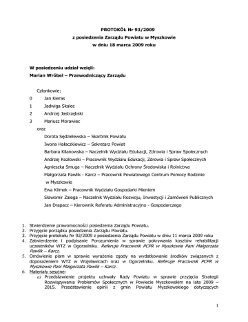 PROTOKÓŁ Nr 93/2009 z posiedzenia Zarządu Powiatu w Myszkowie w dniu 18 marca 2009 roku W posiedzeniu udział wzięli: Marian Wróbel – Przewodniczący Zarządu Członkowie: 0 Jan Kieras 1 Jadwiga Skalec 2 Andrzej Jastrzębski 3 Mariusz Morawiec oraz Dorota Sędzielewska – Skarbnik Powiatu Iwona Hałaczkiewicz – Sekretarz Powiat Barbara Kilanowska – Naczelnik Wydziału Edukacji, Zdrowia i Spraw Społecznych Andrzej Kozłowski – Pracownik Wydziału Edukacji, Zdrowia i Spraw Społecznych Agnieszka Smuga – Naczelnik Wydziału Ochrony Środowiska i Rolnictwa Małgorzata Pawlik - Karcz – Pracownik Powiatowego Centrum Pomocy Rodzinie w Myszkowie Ewa Klimek – Pracownik Wydziału Gospodarki Mieniem Sławomir Zalega – Naczelnik Wydziału Rozwoju, Inwestycji i Zamówień Publicznych Jan Drapacz – Kierownik Referatu Administracyjno - Gospodarczego 1. Stwierdzenie prawomocności posiedzenia Zarządu Powiatu. 2. Przyjęcie porządku posiedzenia Zarządu Powiatu. 3. Przyjęcie protokołu Nr 92/2009 z posiedzenia Zarządu Powiatu w dniu 11 marca 2009 roku 4. Zatwierdzenie i podpisanie Porozumienia w sprawie pokrywania kosztów rehabilitacji uczestników WTZ w Ogorzelniku. Referuje Pracownik PCPR w Myszkowie Pani Małgorzata Pawlik – Karcz. 5. Omówienie pism w sprawie wyrażenia zgody na wydatkowanie środków związanych z doposażeniem WTZ w Wojsławicach oraz w Ogorzelniku. Referuje Pracownik PCPR w Myszkowie Pani Małgorzata Pawlik – Karcz. 6. Materiały sesyjne: a) Przedstawienie projektu uchwały Rady Powiatu w sprawie przyjęcia Strategii Rozwiązywania Problemów Społecznych w Powiecie Myszkowskim na lata 2009 – 2015. Przedstawienie opinii z gmin Powiatu Myszkowskiego dotyczących 1 przedmiotowego projektu. Referuje Pracownik PCPR w Myszkowie Pani Małgorzata Pawlik – Karcz. b) Przedstawienie projektu uchwały Rady Powiatu w sprawie założenia Szkoły Policealnej dla Dorosłych w Żarkach ul. Myszkowska 50 i włączenia tej szkoły w skład Zespołu Szkół im. T. Kościuszki w Żarkach, ul. Myszkowska 50. Referuje Naczelnik Wydziału ES Pani Barbara Kilanowska. c) Przedstawienie projektu uchwały Rady Powiatu w sprawie zwiększenia budżetu Powiatu Myszkowskiego w związku z realizacją wspólnego projektu „e-Myszkovia” oraz zmiany w planowanych zadaniach inwestycyjnych na rok 2009. Referuje Naczelnik Wydziału RI Pan Sławomir Zalega. d) Przedstawienie projektu uchwały Rady Powiatu w sprawie zmiany Statutu Powiatu Myszkowskiego. Referuje Sekretarz Powiatu Pani Iwona Hałaczkiewicz. e) Przedstawienie projektu uchwały Rady Powiatu w sprawie ustalenia jednolitego tekstu Statutu Powiatu Myszkowskiego. Referuje Sekretarz Powiatu Pani Iwona Hałaczkiewicz. f) Przedstawienie Informacji Zarządu Powiatu w zakresie udzielonej pomocy społecznej za 2008 rok. Referuje Sekretarz Powiatu Pani Iwona Hałaczkiewicz. 7. Przedstawienie projektu planu imprez kulturalnych na 2009 rok. Referuje Naczelnik Wydziału ES Pani Barbara Kilanowska. 8. Przedstawienie propozycji podziału środków na kulturę fizyczną i sporu w 2009 roku. Referuje Naczelnik Wydziału ES Pani Barbara Kilanowska. 9. Przedstawienie wniosków w sprawie: a) organizacji Turnieju piłki nożnej dla drużyn z terenu Powiatu Myszkowskiego w kat. trampkarz starszy i trampkarz młodszy – 29 marca br. b) organizacji Turnieju piłki nożnej dla drużyn z terenu Powiatu Myszkowskiego w kat. junior starszy – 28 marca br. c) organizacji Amatorskiej Ligi Tenisa Stołowego – finał 29 marca br. d) organizacji V Regionalnego Przeglądu Pieśni Pasyjnej i Pokutnej – 1-4 kwietnia br. Referuje Naczelnik Wydziału ES Pani Barbara Kilanowska. 10. Przedstawienie wniosku w sprawie dofinansowania z PFOŚiGW w Myszkowie na zadanie pn.: „Odkryj jaskinie Powiatu Myszkowskiego”. Referuje Naczelnik Wydziału OŚR Pani Agnieszka Smuga. 11. Przedstawienie wniosku Dyrektora ZS Nr 2 w Myszkowie w sprawie objęcia patronatem oraz ufundowania nagród II edycji konkursu plastyczno – fotograficznego pt.: „Woda w krajobrazie wiejskim Jury Krakowsko – Częstochowskiej i okolic”. Referuje Naczelnik Wydziału OŚR Pani Agnieszka Smuga. 12. Omówienie projektu umowy dotacji z PFOŚiGW w Myszkowie na zadanie pn.: „Termomodernizacja polegająca na dociepleniu ścian w Przychodni Rejonowo – Specjalistycznej w Koziegłowach, ul. 3 Maja 25”. Referuje Naczelnik Wydziału OŚR Pani Agnieszka Smuga. 13. Przedstawienie wniosku ENION S.A. oddział w Częstochowie w sprawie wyrażenia zgody na podział działki nr 2 w Myszkowie, obręb Będusz, na której zlokalizowana jest stacja transformatorowa, będąca własnością ENION S.A. Referuje Naczelnik Wydziału GM Pani Alicja Radosz. 14. Przedstawienie projektów i podjęcie uchwał Zarządu Powiatu w sprawie: a) przeniesienia planu wydatków w budżecie Powiatu Myszkowskiego na 2009 r.; b) sprawozdania rocznego z wykonania budżetu Powiatu Myszkowskiego za 2008 rok. Referuje Skarbnik Powiatu Pani Dorota Sędzielewska. 15. Sprawy bieżące - Omówienie zadania inwestycyjnego pn.: „Przebudowa (adaptacja) budynku niskiego na salę sesyjną, salę obsługi interesantów oraz przebudowa wejść do budynku administracyjnego Starostwa Powiatowego w Myszkowie wraz z likwidacją barier architektonicznych”. Referuje Kierownik Referatu AG Pan Jan Drapacz. 2 Przebieg posiedzenia Zarządu Powiatu. Ad. 1. Stwierdzenie prawomocności posiedzenia Zarządu Powiatu. Przewodniczący Zarządu Powiatu Pan Marian Wróbel, na podstawie listy obecności, stanowiącej załącznik nr 1 do niniejszego protokołu, stwierdził prawomocność posiedzenia Zarządu w dniu 18 marca 2009 roku. Ad. 2. Przyjęcie porządku posiedzenia Zarządu Powiatu. Członkowie Zarządu Powiatu do przedstawionego przez Przewodniczącego Zarządu porządku posiedzenia nie wnieśli uwag. Członkowie Zarządu Powiatu otrzymali kserokopie wszystkich dokumentów będących przedmiotem dzisiejszego posiedzenia Zarządu. Ad.3. P