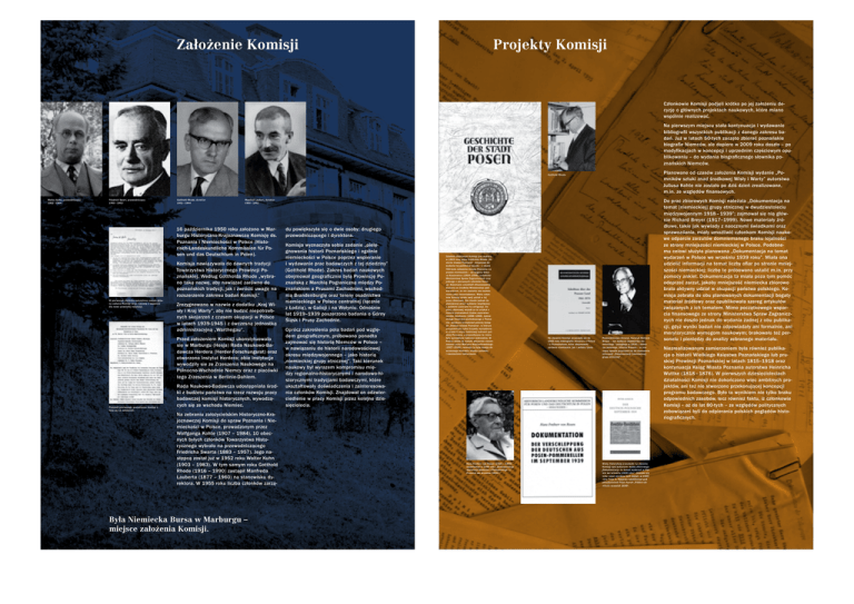 Założenie Komisji Projekty Komisji Członkowie Komisji podjęli krótko po jej założeniu decyzję o głównych projektach naukowych, które miano wspólnie realizować. Na pierwszym miejscu stała kontynuacja i wydawanie bibliografii wszystkich publikacji z danego zakresu badań. Już w latach 50-tych zaczęto zbierać poznańskie biografie Niemców, ale dopiero w 2009 roku doszło – po modyfikacjach w koncepcji i uprzednim częściowym opublikowaniu – do wydania biograficznego słownika poznańskich Niemców. Planowane od czasów założenia Komisji wydanie „Pomników sztuki znad środkowej Wisły i Warty” autorstwa Juliusa Kohte nie zostało po dziś dzień zrealizowane, m.in. ze względów finansowych. Gotthold Rhode Walter Kuhn, przewodniczący 1952 – 1964 Friedrich Swart, przewodniczący 1950 – 1952 Gotthold Rhode, dyrektor 1952 – 1964 Manfred Laubert, dyrektor 1950 – 1952 16 października 1950 roku założono w Marburgu Historyczno-Krajoznawczą Komisję ds. Poznania i Niemieckości w Polsce (Historisch-Landeskundliche Kommission für Posen und das Deutschtum in Polen). Komisja nawiązywała do dawnych tradycji Towarzystwa Historycznego Prowincji Poznańskiej. Według Gottholda Rhode „wybrano taką nazwę, aby nawiązać zarówno do poznańskich tradycji, jak i zwrócić uwagę na rozszerzenie zakresu badań Komisji.” W pierwszym okólniku nakreślone zostały główne zadania Komisji wraz z prośbą o wsparcie dla nowo powstałej instytucji. Zrezygnowano w nazwie z dodatku „Kraj Wisły i Kraj Warty”, aby nie budzić niepotrzebnych skojarzeń z czasem okupacji w Polsce w latach 1939-1945 i z ówczesną jednostką administracyjną „Warthegau”. Przed założeniem Komisji ukonstytuowała się w Marburgu (Hesja) Rada Naukowo-Badawcza Herdera (Herder-Forschungsrat) oraz otworzono Instytut Herdera; obie instytucje wywodziły sie ze Zrzeszenia Naukowego na Północno-Wschodnie Niemcy oraz z placówki tego Zrzeszenia w Berlinie-Dahlem. Protokół pierwszego posiedzenia Komisji z listą jej 11 założycieli. Rada Naukowo-Badawcza udostępniała środki z budżetu państwa na rzecz rozwoju pracy badawczej komisji historycznych, wywodzących się ze wschodu Niemiec. Na zebraniu założycielskim Historyczno-Krajoznawczej Komisji do spraw Poznania i Niemieckości w Polsce, prowadzonym przez Wolfganga Kohte (1907 – 1984), 10 obecnych byłych członków Towarzystwa Historycznego wybrało na przewodniczącego Friedricha Swarta (1883 – 1957). Jego następcą został już w 1952 roku Walter Kuhn (1903 – 1983). W tym samym roku Gotthold Rhode (1916 – 1990) zastąpił Manfreda Lauberta (1877 – 1960) na stanowisku dyrektora. W 1955 roku liczba członków zarzą- Była Niemiecka Bursa w Marburgu – miejsce założenia Komisji. du powiększyła się o dwie osoby: drugiego przewodniczącego i dyrektora. Komisja wyznaczyła sobie zadanie „pielęgnowania historii Poznańskiego i ogólnie niemieckości w Polsce poprzez wspieranie i wydawanie prac badawczych z tej dziedziny” (Gotthold Rhode). Zakres badań naukowych obejmował geograficznie byłą Prowincję Poznańską z Marchią Pograniczną między Poznańskiem a Prusami Zachodnimi, wschodnią Brandenburgię oraz tereny osadnictwa niemieckiego w Polsce centralnej (łącznie z Łodzią), w Galicji i na Wołyniu. Odnośnie lat 1919–1939 poszerzono badania o Górny Śląsk i Prusy Zachodnie. Oprócz zakreślenia pola badań pod względem geograficznym, próbowano ponadto zajmować się historią Niemców w Polsce – w nawiązaniu do historii narodowościowej okresu międzywojennego – jako historią „niemieckiej grupy etnicznej”. Taki kierunek naukowy był wyrazem kompromisu między regionalno-historycznymi i narodowo-historycznymi tradycjami badawczymi, które ukształtowały doświadczenia i zainteresowania członków Komisji. Znajdował on odzwierciedlenie w pracy Komisji przez kolejne dziesięciolecia. Dziełem zbiorowym Komisji jest wydana w 1953 roku przez Gottholda Rhode „Historia miasta Poznania“. Inicjatywa do wydania tej publikacji wyszła – z okazji 700-lecia założenia miasta Poznania na prawie niemieckim – od Eugena Oskara Kossmanna (1904–1998), urzędnika Ministerstwa Spraw Zagranicznych oraz jednego z pierwszych członków Komisji. Kossmann umożliwił sfinansowanie wydania ze środków Ministerstwa pod warunkiem, że nie zostanie ono wymienione jako zleceniodawca. Wielu członków Komisji miało swój udział w tej pracy zbiorowej. Nie doszło jednak do planowanej przez wydawcę współpracy z polskimi autorami na emigracji. Do pracy zbiorowej wszedł za to artykuł o historii poznańskich Żydów autorstwa Jacoba Jacobsona (1888–1968), żydowskiego historyka pochodzącego z Poznania. Jacobson krytykował później wstęp do „Historii miasta Poznania“, w którym przypominano tylko krzywdy wyrządzone w czasie II wojny światowej ludności polskiej Poznania, a przemilczano te, które były wyrządzone ludności żydowskiej. W Polsce dzieło to zostało obszernie zrecenzowane przez Mariana Wojciechowskiego (1927–2006); recenzja ta była okazją do wczesnego kontaktu między polskimi i niemieckimi historykami. Hans Freiherr von Rosen (1900 – 1999) opublikował w 1990 roku „Dokumentację deportacji Niemców z Poznańskiego i z Pomorza we wrześniu 1939 r.“ Na zlecenie Komisji ukazywały się do 1983 roku bibliografie literatury o Polsce i o Poznańskiem, które obejmowały zarówno niemieckie, jak i polskie tytuły. Przewodniczący Komisji, historyk Richard Breyer – syn badacza osadnictwa niemieckiego i poległego w 1939 r. żołnierza polskiego, Alberta Breyera – w znaczący sposób przyczynił się do stworzenia koncepcji „Dokumentacji [niemieckiej] grupy etnicznej“. Wielu historyków pracowało na zlecenie Komisji nad wydaniem dzieła zbiorowego „Dokumentacja na temat wydarzeń w Polsce we wrześniu 1939 roku”. Ukazała się tylko część wyników tych 