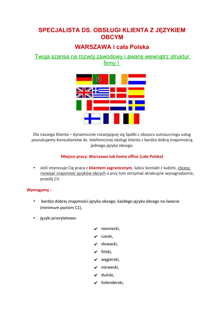 SPECJALISTA DS. OBSŁUGI KLIENTA Z JĘZYKIEM OBCYM WARSZAWA i cała Polska Twoja szansa na rozwój zawodowy i awans wewnątrz struktur firmy ! Dla naszego Klienta – dynamicznie rozwijającej się Spółki z obszaru outsourcingu usług poszukujemy Konsultantów ds. telefonicznej obsługi klienta z bardzo dobrą znajomością jednego języka obcego. Miejsce pracy: Warszawa lub home office (cała Polska) • Jeśli interesuje Cię praca z klientem zagranicznym, lubisz kontakt z ludźmi, chcesz rozwijać znajomość języków obcych a przy tym otrzymać atrakcyjne wynagrodzenie, prześlij CV. Wymagamy : • bardzo dobrej znajomości języka obcego, każdego języka obcego na świecie (minimum poziom C1), • języki priorytetowe: ✔ niemiecki, ✔ czeski, ✔ słowacki, ✔ fiński, ✔ węgierski, ✔ norweski, ✔ duński, ✔ holenderski, ✔ niderlandzki, ✔ francuski, ✔ szwedzki, ✔ tajski • entuzjazmu i zaangażowania; • dobrze rozwiniętych umiejętności interpersonalnych; • mile widziane doświadczenie w obsłudze klienta i/lub sprzedaży. Oferujemy : atrakcyjne wynagrodzenie i elastyczny czas pracy (możliwość pracy np. 40, 30, 20 godzin tygodniowo oraz w weekendy, godziny pracy ustalane indywidualnie w zależności od strefy czasu w danym państwie); praca w międzynarodowym, młodym, dynamicznym środowisku; wygodne biuro w centrum Warszawy; możliwość pracy zdalnej z domu (home office), kandydat dostaje niezbędne narzędzia pracy (laptop, słuchawki i zdalny dostęp do wszystkich potrzebnych systemów); przyjazna atmosferę pracy; szerokie możliwości rozwoju (awans wewnątrz struktur firmy); forma współpracy: umowa zlecenie; dla zainteresowanych po przepracowaniu 3 miesięcy – możliwość podpisania umowy o pracę, płatne szkolenie przed rozpoczęciem pracy; praca od zaraz! Do Twoich obowiązków będzie należeć: stały telefoniczny kontakt z klientami zainteresowanymi produktami z sektora health&beauty; dbanie o realizację napływających zamówień; sprawne przekazywanie informacji dot. realizowanych zadań, od strony współpracownika potrzebne jest jedynie stabilne połączenie internetowe i ustronne, ciche miejsce. Wykonywanie połączeń odbywa się przez system voip, czyli nie jest potrzebny własny telefon. Osoby zainteresowane udziałem w procesie rekrutacji prosimy o przesłanie CV na adres [email protected] W tytule maila prosimy umieścić nr .ref: KONSULTANT/język (taki na jaki aplikujesz). CV powinno zawierać klauzulę : „Wyrażam zgodę na przetwarzanie moich danych osobowych zawartych w dokumentach rekrutacyjnych przez Habitus International Recruitment z siedzibą w Warszawie ul.Tyniecka 27/5 02-615 , będącą agencją zatrudnienia ujawnioną w rejestrze Marszałka Województwa Mazowieckiego pod numerem 12340, w celu prowadzenia procesów rekrutacyjnych z udziałem potencjalnych pracodawców, zgodnie z ustawą z dn. 29.08.97 r. o ochronie danych osobowych (tekst jednolity: Dz. U. 2002 nr 101, poz. 926 ze zm.). W tym celu, zgadzam się na przekazanie moich danych osobowych potencjalnym pracodawcom oraz innym podmiotom powiązanym lub współpracującym z Habitus International Recruitment. Mam świadomość, iż przysługuje mi prawo dostępu do moich danych osobowych oraz że podanie powyższych danych osobowych jest dobrowolne.” Strona internetowa : http://www.hire.com.pl/ Profil na fb: Rekrutacje i doradztwo personalne https://www.facebook.com/habitus.ire/?fref=ts