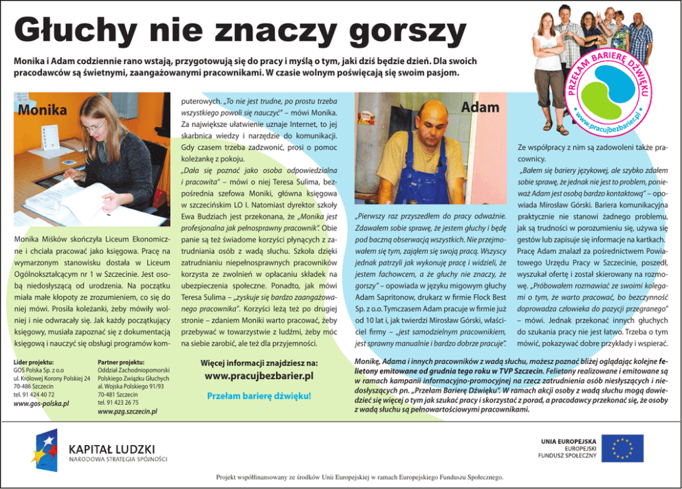 Głuchy nie znaczy gorszy Monika i Adam codziennie rano wstają, przygotowują się do pracy i myślą o tym, jaki dziś będzie dzień. Dla swoich pracodawców są świetnymi, zaangażowanymi pracownikami. W czasie wolnym poświęcają się swoim pasjom. Monika Monika Miśków skończyła Liceum Ekonomiczne i chciała pracować jako księgowa. Pracę na wymarzonym stanowisku dostała w Liceum Ogólnokształcącym nr 1 w Szczecinie. Jest osobą niedosłyszącą od urodzenia. Na początku miała małe kłopoty ze zrozumieniem, co się do niej mówi. Prosiła koleżanki, żeby mówiły wolniej i nie odwracały się. Jak każdy początkujący księgowy, musiała zapoznać się z dokumentacją księgową i nauczyć się obsługi programów komLider projektu: GOS Polska Sp. z o.o ul. Królowej Korony Polskiej 24 70-486 Szczecin tel. 91 424 40 72 www.gos-polska.pl Partner projektu: Oddział Zachodniopomorski Polskiego Związku Głuchych al. Wojska Polskiego 91/93 70-481 Szczecin tel. 91 423 26 75 www.pzg.szczecin.pl puterowych. „To nie jest trudne, po prostu trzeba wszystkiego powoli się nauczyć” – mówi Monika. Za największe ułatwienie uznaje Internet, to jej skarbnica wiedzy i narzędzie do komunikacji. Gdy czasem trzeba zadzwonić, prosi o pomoc koleżankę z pokoju. „Dała się poznać jako osoba odpowiedzialna i pracowita” – mówi o niej Teresa Sulima, bezpośrednia szefowa Moniki, główna księgowa w szczecińskim LO I. Natomiast dyrektor szkoły Ewa Budziach jest przekonana, że „Monika jest profesjonalna jak pełnosprawny pracownik”. Obie panie są też świadome korzyści płynących z zatrudniania osób z wadą słuchu. Szkoła dzięki zatrudnianiu niepełnosprawnych pracowników korzysta ze zwolnień w opłacaniu składek na ubezpieczenia społeczne. Ponadto, jak mówi Teresa Sulima – „zyskuje się bardzo zaangażowanego pracownika”. Korzyści leżą też po drugiej stronie – zdaniem Moniki warto pracować, żeby przebywać w towarzystwie z ludźmi, żeby móc na siebie zarobić, ale też dla przyjemności. Więcej informacji znajdziesz na: www.pracujbezbarier.pl Przełam barierę dźwięku! Adam „Pierwszy raz przyszedłem do pracy odważnie. Zdawałem sobie sprawę, że jestem głuchy i będę pod baczną obserwacją wszystkich. Nie przejmowałem się tym, zająłem się swoją pracą. Wszyscy jednak patrzyli jak wykonuję pracę i widzieli, że jestem fachowcem, a że głuchy nie znaczy, że gorszy” – opowiada w języku migowym głuchy Adam Sapritonow, drukarz w firmie Flock Best Sp. z o.o. Tymczasem Adam pracuje w firmie już od 10 lat i, jak twierdzi Mirosław Górski, właściciel firmy – „jest samodzielnym pracownikiem, jest sprawny manualnie i bardzo dobrze pracuje”. Ze współpracy z nim są zadowoleni także pracownicy. „Bałem się bariery językowej, ale szybko zdałem sobie sprawę, że jednak nie jest to problem, ponieważ Adam jest osobą bardzo kontaktową” – opowiada Mirosław Górski. Bariera komunikacyjna praktycznie nie stanowi żadnego problemu, jak są trudności w porozumieniu się, używa się gestów lub zapisuje się informacje na kartkach. Pracę Adam znalazł za pośrednictwem Powiatowego Urzędu Pracy w Szczecinie, poszedł, wyszukał ofertę i został skierowany na rozmowę. „Próbowałem rozmawiać ze swoimi kolegami o tym, że warto pracować, bo bezczynność doprowadza człowieka do pozycji przegranego” – mówi. Jednak przekonać innych głuchych do szukania pracy nie jest łatwo. Trzeba o tym mówić, pokazywać dobre przykłady i wspierać. Monikę, Adama i innych pracowników z wadą słuchu, możesz poznać bliżej oglądając kolejne felietony emitowane od grudnia tego roku w TVP Szczecin. Felietony realizowane i emitowane są w ramach kampanii informacyjno-promocyjnej na rzecz zatrudnienia osób niesłyszących i niedosłyszących pn. „Przełam Barierę Dźwięku”. W ramach akcji osoby z wadą słuchu mogą dowiedzieć się więcej o tym jak szukać pracy i skorzystać z porad, a pracodawcy przekonać się, że osoby z wadą słuchu są pełnowartościowymi pracownikami. Projekt współfinansowany ze środków Unii Europejskiej w ramach Europejskiego Funduszu Społecznego.