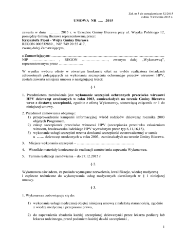 Zał. nr 3 do zarządzenia nr 32/2015 z dnia 9 kwietnia 2015 r. UMOWA NR ..... .2015 zawarta w dniu ……… 2015 r. w Urzędzie Gminy Bierawa przy ul. Wojska Polskiego 12, pomiędzy Gminą Bierawa reprezentowaną przez: Krzysztofa Ficoń - Wójta Gminy Bierawa REGON 000532889 , NIP 749 20 55 417, zwaną dalej Zamawiającym, a Zamawiającym: ………………………………………………………………………………. NIP ……………… , REGON …………………, zwanym dalej „Wykonawcą”, reprezentowanym przez ……………….. W wyniku wyboru oferty w otwartym konkursie ofert na wybór realizatora świadczeń zdrowotnych polegających na wykonaniu szczepienia ochronnego przeciw wirusowi HPV, została zawarta niniejsza umowa o następującej treści: § 1. 1. Przedmiotem zamówienia jest wykonanie szczepień ochronnych przeciwko wirusowi HPV dziewcząt urodzonych w roku 2003, zamieszkałych na terenie Gminy Bierawa wraz z dostawą szczepionki, zgodnie z ofertą Wykonawcy, stanowiącą załącznik nr 1 do niniejszej umowy. 2. Przedmiot zamówienia obejmuje: 1) przeprowadzenie kampanii informacyjnej wśród rodziców dziewcząt rocznika 2003 objętych Programem, 2) zakup szczepionek przeciwko wirusowi HPV (szczepionka przeciwko zakażeniom wirusem, brodawczaka ludzkiego HPV wywołanym przez typ 6,11,16,18), 3) wykonanie usługi szczepień trzema dawkami szczepionki czterowalentnej w sumie u …… dziewcząt urodzonych w roku 2003, zamieszkałych na terenie Gminy Bierawa. 3. Miejsce wykonania szczepień – ………………………………………. 4. Wszelkie materiały konieczne do realizacji zamówienia zapewnia Wykonawca. 5. Termin realizacji zamówienia – do 27.12.2015 r. § 2. Wykonawca oświadcza, że posiada wymagane zezwolenia, kwalifikacje, wiedzę medyczną i zaplecze techniczne do wykonywania usług medycznych określonych w § 1 niniejszej umowy. § 3. 1. Wykonawca zobowiązuje się do: 1) wykonania usługi medycznej objętej niniejszą umową z należytą starannością, zgodnie z wiedzą medyczną i przepisami prawa, 2) do zapewnienia zbadania każdej szczepionej dziewczynki przez lekarza pediatrę lub lekarza rodzinnego, przed podaniem każdej dawki szczepionki , 1 3) posiadania ubezpieczenia od odpowiedzialności cywilnej z tytułu wykonywania usługi medycznej objętej niniejszą umową, 4) pokrywania kosztów związanych z zakupem środków medycznych i innych niezbędnych do wykonania przedmiotu umowy. 2. Wykonawca nie może powierzyć wykonania usługi wynikającej z niniejszej umowy innej osobie bez pisemnej zgody zamawiającego. 3. Zamawiający wyznacza Panią Klaudię Janas do roboczych kontaktów z Wykonawcą. § 4. 1. Zamawiający zobowiązuje się zapłacić Wykonawcy wynagrodzenie zgodne z ofertą Wykonawcy, stanowiącą załącznik nr 1 do niniejszej umowy, które będzie płatne po zakończeniu każdego z niżej wymienionych etapów realizacji przedmiotu umowy i w następujących wysokościach: 1) szczepienie ochronne przeciwko wirusowi HPV wywołującego raka szyjki macicy – u … dziewcząt z rocznika 2003, zamieszkałych na terenie gminy Bierawa - podanie I dawki szczepionki: łącznie brutto …….. złotych (słownie: ……..) 2) szczepienie ochronne przeciwko wirusowi HPV wywołującego raka szyjki macicy – u …. dziewcząt z rocznika 2003, zamieszkałych na terenie gminy Bierawa - podanie II dawki szczepionki: łącznie brutto …….. złotych (słownie: …………..) 3) szczepienie ochronne przeciwko wirusowi HPV wywołującego raka szyjki macicy – u …. dziewcząt z rocznika 2003, zamieszkałych na terenie gminy Bierawa - podanie III dawki szczepionki: łącznie brutto …… złotych (słownie: osiem tysięcy siedemset złotych) 2. Łączne nieprzekraczalne wynagrodzenie Wykonawcy za wykonanie całego przedmiotu umowy wynosi brutto ……… zł (słownie: …………..). 3. W przypadku wykonania szczepień u mniejszej liczby dziewcząt niż określona w ust.1 pkt.1, 2 i 3 niniejszego paragrafu, Wynagrodzenie Wykonawcy określone w każdym z tych punktów i w ust.2 niniejszego paragrafu zostanie obliczone na podstawie faktycznej ilości wykonanych szczepionek i ceny jednostkowej za szczepienie jednej osoby, która wynosi brutto …….. zł (słownie: ….. złotych). § 5. 1. Rozliczenie za wykonanie przedmiotu umowy nastąpi fakturami VAT wystawionymi w ciągu 14 dni po zakończeniu każdego etapu realizacji przedmiotu umowy, wymienionego w § 4 ust.1 pkt.1-3 umowy. 2. Zapłata nastąpi w ciągu 14 dni od daty doręczenia Zamawiającemu faktury. 3. Należność Wykonawcy z tytułu realizacji umowy będzie płatna na jego konto podane na fakturze. 4. Za datę realizacji płatności uważa się datę obciążenia przez bank należnością konta Zamawiającego. 2 § 6. 1. W przypadku nie przystąpienia przez Wykonawcę do wykonywania przedmiotu umowy w terminie 14 dni od daty zawarcia niniejszej umowy Zamawiający ma prawo odstąpić od umowy i naliczyć Wykonawcy karę umowną w wysokości 20% wynagrodzenia brutto określonego w § 4 ust.2 niniejszej umowy. 2. W przypadku nienależytego wykonania obowiązków wynikających z umowy lub przerwania wykonywania obowiązków na czas dłuższy niż 10 dni, Zamawiający ma prawo odstąpić od umowy w trybie natychmiastowym i naliczyć Wykonawcy karę umowną w wysokości 20% wynagrodzenia brutto określonego w § 4 ust. 2 niniejszej umowy. 3. Wykonawca zobowiązany jest zapłacić karę umowną w terminie 14 dni od daty wystąpienia z żądaniem przez Zamawiającego. 4. W przypadku opóźnienia w zapłacie kary umownej Zamawiający potrąci należną karę z należności Wykonawcy. 5. Jeżeli wysokość szkody, poniesionej przez Zamawiającego, przewyższy wysokość kar umownych, o których mowa w ust.1, będzie on uprawniony do dochodzenia odszkodowania na zasadach ogólnych kodeksu cywilnego. § 7. 1. W sprawach nie uregulowanych w niniejszej umowie bę