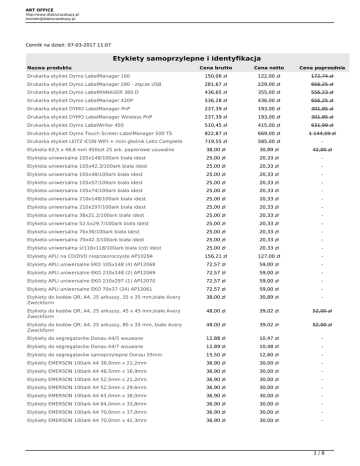 ART OFFICE http://www.dlabiurazakupy.pl [email protected] Cennik na dzień: 07-03-2017 11:07 Etykiety samoprzylepne i identyfikacja Nazwa produktu Cena brutto Cena netto Cena poprzednia Drukarka etykiet Dymo LabelManager 160 150,06 zł 122,00 zł 172,74 zł Drukarka etykiet Dymo LabelManager 280 - złącze USB 281,67 zł 229,00 zł 656,25 zł Drukarka etykiet Dymo LabelMANAGER 360 D 436,65 zł 355,00 zł 556,23 zł Drukarka etykiet Dymo LabelManager 420P 536,28 zł 436,00 zł 656,25 zł Drukarka etykiet DYMO LabelManager PnP 237,39 zł 193,00 zł 301,95 zł Drukarka etykiet DYMO LabelManager Wireless PnP 237,39 zł 193,00 zł 301,95 zł Drukarka etykiet Dymo LabelWriter 450 510,45 zł 415,00 zł 631,99 zł Drukarka etykiet Dymo Touch Screen LabelManager 500 TS 822,87 zł 669,00 zł 1 144,59 zł Drukarka etykiet LEITZ ICON WIFI + mini głośnik Leitz Complete 719,55 zł 585,00 zł - Etykieta 63,5 x 46,6 mm 450szt 25 ark. papierowe usuwalne 38,00 zł 30,89 zł 42,00 zł Etykieta uniwersalna 105x148/100ark biała idest 25,00 zł 20,33 zł - Etykieta uniwersalna 105x42.3/100ark biała idest 25,00 zł 20,33 zł - Etykieta uniwersalna 105x48/100ark biała idest 25,00 zł 20,33 zł - Etykieta uniwersalna 105x57/100ark biała idest 25,00 zł 20,33 zł - Etykieta uniwersalna 105x74/100ark biała idest 25,00 zł 20,33 zł - Etykieta uniwersalna 210x148/100ark biała idest 25,00 zł 20,33 zł - Etykieta uniwersalna 210x297/100ark biała idest 25,00 zł 20,33 zł - Etykieta uniwersalna 38x21.2/100ark biała idest 25,00 zł 20,33 zł - Etykieta uniwersalna 52.5x29.7/100ark biała idest 25,00 zł 20,33 zł - Etykieta uniwersalna 70x36/100ark biała idest 25,00 zł 20,33 zł - Etykieta uniwersalna 70x42.3/100ark biała idest 25,00 zł 20,33 zł - Etykieta uniwersalna śr118x118/100ark biała (cd) idest 25,00 zł 20,33 zł - Etykiety APLI na CD/DVD nieprzezroczyste AP10294 156,21 zł 127,00 zł - Etykiety APLI uniwersalne EKO 105x148 (4) AP12068 72,57 zł 59,00 zł - Etykiety APLI uniwersalne EKO 210x148 (2) AP12069 72,57 zł 59,00 zł - Etykiety APLI uniwersalne EKO 210x297 (1) AP12070 72,57 zł 59,00 zł - Etykiety APLI uniwersalne EKO 70x37 (24) AP12061 72,57 zł 59,00 zł - Etykiety do kodów QR; A4, 25 arkuszy, 35 x 35 mm,białe Avery Zweckform 38,00 zł 30,89 zł - Etykiety do kodów QR; A4, 25 arkuszy, 45 x 45 mm,białe Avery Zweckform 48,00 zł 39,02 zł 52,00 zł Etykiety do kodów QR; A4, 25 arkuszy, 80 x 35 mm, białe Avery Zweckform 48,00 zł 39,02 zł 52,00 zł Etykiety do segregatorów Donau A4/5 wsuwane 12,88 zł 10,47 zł - Etykiety do segregatorów Donau A4/7 wsuwane 12,89 zł 10,48 zł - Etykiety do segregatorów samoprzylepne Donau 55mm 15,50 zł 12,60 zł - Etykiety EMERSON 100ark A4 38,0mm x 21,2mm 36,90 zł 30,00 zł - Etykiety EMERSON 100ark A4 48,5mm x 16,9mm 36,90 zł 30,00 zł - Etykiety EMERSON 100ark A4 52,5mm x 21,2mm 36,90 zł 30,00 zł - Etykiety EMERSON 100ark A4 52,5mm x 29,6mm 36,90 zł 30,00 zł - Etykiety EMERSON 100ark A4 63,0mm x 38,0mm 36,90 zł 30,00 zł - Etykiety EMERSON 100ark A4 64,0mm x 33,8mm 36,90 zł 30,00 zł - Etykiety EMERSON 100ark A4 70,0mm x 37,0mm 36,90 zł 30,00 zł - Etykiety EMERSON 100ark A4 70,0mm x 42,3mm 36,90 zł 30,00 zł - 1/8 ART OFFICE http://www.dlabiurazakupy.pl [email protected] Etykiety EMERSON 100ark A4 70,0mm x 50,8mm 36,90 zł 30,00 zł - Etykiety EMERSON 100ark A4 97,0mm x 42,4mm 36,90 zł 30,00 zł - 105,00 zł 85,37 zł 115,00 zł Etykiety na CD/DVD Classic Size. białe, matowe bez nakładki, 25 arkuszy 44,00 zł 35,77 zł 55,00 zł Etykiety na CD/DVD Classic Size. białe, matowe z nakładką centrującą 44,00 zł 35,77 zł 55,00 zł Etykiety na CD/DVD Super Size. białe, błyszczące do druku atramentowego 105,00 zł 85,37 zł 115,00 zł Etykiety na CD/DVD Super Size. białe, błyszczące do druku laserowego 61,00 zł 49,59 zł 66,00 zł Etykiety poliestrowe, wodoodporne, białe. Avery Zweckform 210 x 297 mm 112,00 zł 91,06 zł 125,00 zł Etykiety poliestrowe, wodoodporne, białe. Avery Zweckform 63,5 x 33,9 mm 112,00 zł 91,06 zł 125,00 zł Etykiety poliestrowe, wodoodporne, białe. Avery Zweckform 99,1 x 139 mm 111,19 zł 90,40 zł 125,00 zł Etykiety poliestrowe, wodoodporne, białe. Avery Zweckform 99,1 x 42,3 mm 111,19 zł 90,40 zł 125,00 zł Etykiety poliestrowe, wodoodporne, białe. Avery Zweckform 99,1 x 67,7 mm 111,19 zł 90,40 zł 125,00 zł Etykiety poliestrowe, wodoodporne, białe. Avery Zweckform Ø 30 mm 111,19 zł 90,40 zł 125,00 zł Etykiety poliestrowe, wodoodporne, żółte. Avery Zweckform 99,1 x 139 mm 111,19 zł 90,40 zł 125,00 zł Etykiety poliestrowe, wodoodporne, żółte. Avery Zweckform Ø 30 mm 111,19 zł 90,40 zł 125,00 zł Etykiety samoprzylepne do serii drukarek Label Writer. Dymo adres zwrotny 25x54 mm - 1x500 szt. 47,60 zł 38,70 zł 54,75 zł Etykiety samoprzylepne do serii drukarek Label Writer. Dymo adresowe 89x36 mm - 2x260 szt. 108,00 zł 87,80 zł 124,99 zł Etykiety samoprzylepne do serii drukarek Label Writer. Dymo adresowe białe 89x28 mm - 2x130 szt. 53,90 zł 43,82 zł 60,58 zł Etykiety samoprzylepne do serii drukarek Label Writer. Dymo adresowe przezr. 89x36 mm - 1x260 szt. 122,00 zł 99,19 zł 136,69 zł Etykiety samoprzylepne do serii drukarek Label Writer. Dymo identyf. imienny 41x89 mm - 1x300 szt. 81,75 zł 66,46 zł 94,10 zł Etykiety samoprzylepne do serii drukarek Label Writer. Dymo identyf. przezr. 101x54 mm - 1x220szt. 90,55 zł 73,62 zł 104,23 zł Etykiety samoprzylepne do serii drukarek Label Writer. Dymo identyf.z dziurką 62x106 mm - 1x250szt. 89,00 zł 72,36 zł 99,75 zł Etykiety samoprzylepne do serii drukarek Label Writer. Dymo na segregatory 38x190 mm - 1x110szt. 88,00 zł 71,54 zł 113,43 zł Etykiety samoprzylepne do serii drukarek Label Writer. Dymo na teczkę zawieszk. 50x12 mm 60,11 zł 48,87 zł - Etykiety samoprzylepne do serii drukarek Label Writer. Dymo różnego przezn. 19x51 mm - 1x500szt. 61,00 zł 49,59 zł 70,22 zł Etykiety samoprzylepne do 