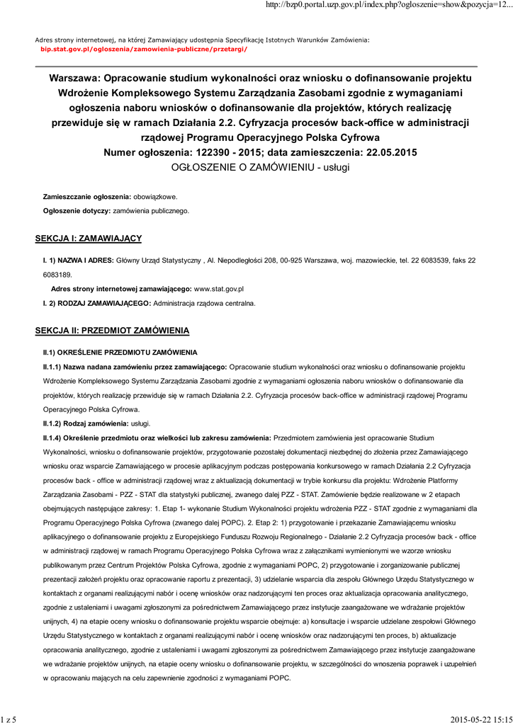 1z5 http://bzp0.portal.uzp.gov.pl/index.php?ogloszenie=show&pozycja=12... Adres strony internetowej, na której Zamawiający udostępnia Specyfikację Istotnych Warunków Zamówienia: bip.stat.gov.pl/ogloszenia/zamowienia-publiczne/przetargi/ Warszawa: Opracowanie studium wykonalności oraz wniosku o dofinansowanie projektu Wdrożenie Kompleksowego Systemu Zarządzania Zasobami zgodnie z wymaganiami ogłoszenia naboru wniosków o dofinansowanie dla projektów, których realizację przewiduje się w ramach Działania 2.2. Cyfryzacja procesów back-office w administracji rządowej Programu Operacyjnego Polska Cyfrowa Numer ogłoszenia: 122390 - 2015; data zamieszczenia: 22.05.2015 OGŁOSZENIE O ZAMÓWIENIU - usługi Zamieszczanie ogłoszenia: obowiązkowe. Ogłoszenie dotyczy: zamówienia publicznego. SEKCJA I: ZAMAWIAJĄCY I. 1) NAZWA I ADRES: Główny Urząd Statystyczny , Al. Niepodległości 208, 00-925 Warszawa, woj. mazowieckie, tel. 22 6083539, faks 22 6083189. Adres strony internetowej zamawiającego: www.stat.gov.pl I. 2) RODZAJ ZAMAWIAJĄCEGO: Administracja rządowa centralna. SEKCJA II: PRZEDMIOT ZAMÓWIENIA II.1) OKREŚLENIE PRZEDMIOTU ZAMÓWIENIA II.1.1) Nazwa nadana zamówieniu przez zamawiającego: Opracowanie studium wykonalności oraz wniosku o dofinansowanie projektu Wdrożenie Kompleksowego Systemu Zarządzania Zasobami zgodnie z wymaganiami ogłoszenia naboru wniosków o dofinansowanie dla projektów, których realizację przewiduje się w ramach Działania 2.2. Cyfryzacja procesów back-office w administracji rządowej Programu Operacyjnego Polska Cyfrowa. II.1.2) Rodzaj zamówienia: usługi. II.1.4) Określenie przedmiotu oraz wielkości lub zakresu zamówienia: Przedmiotem zamówienia jest opracowanie Studium Wykonalności, wniosku o dofinansowanie projektów, przygotowanie pozostałej dokumentacji niezbędnej do złożenia przez Zamawiającego wniosku oraz wsparcie Zamawiającego w procesie aplikacyjnym podczas postępowania konkursowego w ramach Działania 2.2 Cyfryzacja procesów back - office w administracji rządowej wraz z aktualizacją dokumentacji w trybie konkursu dla projektu: Wdrożenie Platformy Zarządzania Zasobami - PZZ - STAT dla statystyki publicznej, zwanego dalej PZZ - STAT. Zamówienie będzie realizowane w 2 etapach obejmujących następujące zakresy: 1. Etap 1- wykonanie Studium Wykonalności projektu wdrożenia PZZ - STAT zgodnie z wymaganiami dla Programu Operacyjnego Polska Cyfrowa (zwanego dalej POPC). 2. Etap 2: 1) przygotowanie i przekazanie Zamawiającemu wniosku aplikacyjnego o dofinansowanie projektu z Europejskiego Funduszu Rozwoju Regionalnego - Działanie 2.2 Cyfryzacja procesów back - office w administracji rządowej w ramach Programu Operacyjnego Polska Cyfrowa wraz z załącznikami wymienionymi we wzorze wniosku publikowanym przez Centrum Projektów Polska Cyfrowa, zgodnie z wymaganiami POPC, 2) przygotowanie i zorganizowanie publicznej prezentacji założeń projektu oraz opracowanie raportu z prezentacji, 3) udzielanie wsparcia dla zespołu Głównego Urzędu Statystycznego w kontaktach z organami realizującymi nabór i ocenę wniosków oraz nadzorującymi ten proces oraz aktualizacja opracowania analitycznego, zgodnie z ustaleniami i uwagami zgłoszonymi za pośrednictwem Zamawiającego przez instytucje zaangażowane we wdrażanie projektów unijnych, 4) na etapie oceny wniosku o dofinansowanie projektu wsparcie obejmuje: a) konsultacje i wsparcie udzielane zespołowi Głównego Urzędu Statystycznego w kontaktach z organami realizującymi nabór i ocenę wniosków oraz nadzorującymi ten proces, b) aktualizacje opracowania analitycznego, zgodnie z ustaleniami i uwagami zgłoszonymi za pośrednictwem Zamawiającego przez instytucje zaangażowane we wdrażanie projektów unijnych, na etapie oceny wniosku o dofinansowanie projektu, w szczególności do wnoszenia poprawek i uzupełnień w opracowaniu mających na celu zapewnienie zgodności z wymaganiami POPC. 2015-05-22 15:15 2z5 http://bzp0.portal.uzp.gov.pl/index.php?ogloszenie=show&pozycja=12... II.1.6) Wspólny Słownik Zamówień (CPV): 71.24.10.00-9. II.1.7) Czy dopuszcza się złożenie oferty częściowej: nie. II.1.8) Czy dopuszcza się złożenie oferty wariantowej: nie. II.2) CZAS TRWANIA ZAMÓWIENIA LUB TERMIN WYKONANIA: Zakończenie: 30.11.2015. SEKCJA III: INFORMACJE O CHARAKTERZE PRAWNYM, EKONOMICZNYM, FINANSOWYM I TECHNICZNYM III.1) WADIUM Informacja na temat wadium: Wadium należy wnieść przed upływem terminu składania ofert w kwocie: 5 000,00 zł (słownie złotych: pięć tysięcy). Wadium wniesione w pieniądzu będzie wniesione skutecznie, jeżeli rachunek bankowy zostanie uznany kwotą wadium przed upływem terminu składania ofert. Wadium należy wnieść w jednej lub kilku formach przewidzianych w art. 45 ust. 6 ustawy: 1) pieniądzu; 2) poręczeniach bankowych lub poręczeniach spółdzielczej kasy oszczędnościowo-kredytowej, z tym że poręczenie kasy jest zawsze poręczeniem pieniężnym; 3) gwarancjach bankowych; 4) gwarancjach ubezpieczeniowych; 5) poręczeniach udzielanych przez podmioty, o których mowa w art. 6 b ust. 5 pkt 2 ustawy z dnia 9 listopada 2000 r. o utworzeniu Polskiej Agencji Rozwoju Przedsiębiorczości (Dz. U. z 2007 r. Nr 42, poz. 275 z późn. zm.) III.2) ZALICZKI III.3) WARUNKI UDZIAŁU W POSTĘPOWANIU ORAZ OPIS SPOSOBU DOKONYWANIA OCENY SPEŁNIANIA TYCH WARUNKÓW III. 3.1) Uprawnienia do wykonywania określonej działalności lub czynności, jeżeli przepisy prawa nakładają obowiązek ich posiadania Opis sposobu dokonywania oceny spełniania tego warunku Zamawiający dokona oceny spełniania ww. warunku na podstawie oświadczenia o spełnianiu warunków udziału w postępowaniu, o którym mowa w pkt III.4.1) ogłoszenia o zamówieniu, według formuły spełnia/nie spełnia. III.3.2) Wiedza i doświadczenie Opis sposobu dokonywania oceny spełniania tego warunku Zamawiający uzna ten warunek za spełniony, jeżeli wykon