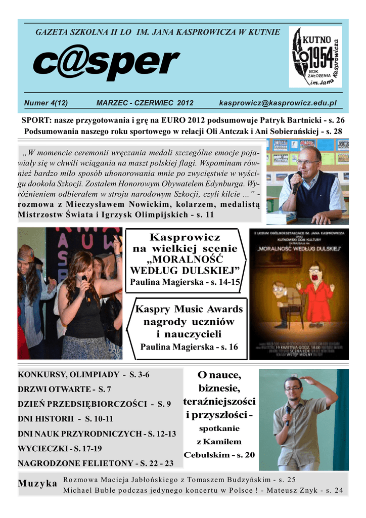 GAZETA SZKOLNA II LO IM. JANA KASPROWICZA W KUTNIE c@sper Numer 4(12) MARZEC - CZERWIEC 2012 [email protected] SPORT: nasze przygotowania i grę na EURO 2012 podsumowuje Patryk Bartnicki - s. 26 Podsumowania naszego roku sportowego w relacji Oli Antczak i Ani Sobierańskiej - s. 28 „W momencie ceremonii wręczania medali szczególne emocje pojawiały się w chwili wciągania na maszt polskiej flagi. Wspominam również bardzo miło sposób uhonorowania mnie po zwycięstwie w wyścigu dookoła Szkocji. Zostałem Honorowym Obywatelem Edynburga. Wyróżnieniem odbierałem w stroju narodowym Szkocji, czyli kilcie ...” rozmowa z Mieczysławem Nowickim, kolarzem, medalistą Mistrzostw Świata i Igrzysk Olimpijskich - s. 11 Kasprowicz na wielkiej scenie „MORALNOŚĆ WEDŁUG DULSKIEJ” Paulina Magierska - s. 14-15 Kaspry Music Awards nagrody uczniów i nauczycieli Paulina Magierska - s. 16 KONKURSY, OLIMPIADY - S. 3-6 DRZWI OTWARTE - S. 7 DZIEŃ PRZEDSIĘBIORCZOŚCI - S. 9 DNI HISTORII - S. 10-11 DNI NAUK PRZYRODNICZYCH - S. 12-13 WYCIECZKI - S. 17-19 O nauce, biznesie, teraźniejszości i przyszłości spotkanie z Kamilem Cebulskim - s. 20 NAGRODZONE FELIETONY - S. 22 - 23 Muz y ka Ro zmo wa Ma cie ja Jabło ńskiego z To mas zem Bu dzyńsk im - s. 25 M ic ha el Bu ble p o dc z as jed yne g o k o nce r t u w P o ls c e ! - M a t e u s z Z nyk - s . 2 4 Z życia szkoły Aktualności III-VI 2012 MARZEC 2.03 Olimpada Mediewistyczna 3.03 Drzwi Otwarte - s. 7 6.03 Warsztaty w Paragrafie - s. 18 6.03 Tomasz Lis na żywo - s. 18 8.03 Turniej siatkówki chłopców 16.03 XXII Seminarium Studenckie na UŁ - s. 13 18.03 warsztaty Akademii Ciekawej Chemii - s.13 22.03 Olimpiada Teologiczna - s. 4 22.03 Dzień Przedsiębiorczości - s. 9 23.03 Konkurs Matematyczny dla gimnazjalistów - s. 6 26.0-30.03 Tydzień Języków Obcych - s. 24 26.03 Tomasz Lis na żywo - s. 18 27.03 premiera spektaklu „Moralność według Dulskiej” - s. 14 - 15 28.03 Konkurs Wiedzy Pożarniczej - s. 5 28.03 i 4.04 Cyberprzemoc - spotkanie z policjantem - s. 8 29.03 rozdanie Casprów - s. 16 KWIECIEŃ 1.04 Pallotyńskie czuwanie - s. 9 2.04 Konkurs biologiczno-chemiczny dla gimnazjalistów - s. 6 3.04 Gala finałowa Fascynującej fizyki - s. 3 6-8.04 rekolekcje 18.04 Konkurs Akademii Ciekawej Chemii - s. 3 19.04 Gramy Dulską dla hospicjum - s. 14 -15 23.04 matematyczny sukces Mateusza Cierpikowskiego - s. 3 24.04 na toruńskim Festiwalu Nauki - s. 17 24.04 sąd nad Krzyżakami w Ic - s. 23 24.04 Konkurs Ekologiczny - s. 13 25.04 spotkanie z radcą prawnym - s. 21 27.04 pożegnanie kl. III - s. 8 27.0-3.05 rajd w Beskid Makowski - s. 19 28.04 warsztaty w Freseniusie - s. 12 MAJ 12.05 Konkurs wiedzy morskiej - s. 5 17.05 pokaz robota "linefollower"- s. 7 24.05 zajęcia w laboratorium chemicznym na UŁ - s. 12 28.05 sukces w Konkursie „Szkoła po nasze mu” - s. 4 29.05 Dni Historii - s. 10 - 11 29.05 debata o kulturze - s. 5 31.05-1.06 IIb w Biskupinie - s. 18 CZERWIEC 8.06 Szwedzi w Kutnie - Ic na wykładach 11.06 radiowe doświadczenia Ib -s. 17 13-15.06 wycieczka IIc i d - s. 19 13-15.06 warsztaty Klementyny - s. 13 15.06 warsztaty wolontariuszy na Małą Ligę Baseball'a - s. 28 18.06 spotkanie z Kamilem Cebulskim - s. 20 19.06 szkolny turniej piłki siatkowej 22.06 zawody strzeleckie 2 Koniec wyjątkowej przygody – początek kolejnego etapu! - Daria Jankowska - s. 21 Marzenia ściętej głowy? - Jakub Czarnecki - s. 22 Edukacja wrogiem efektywności? - Maja Ambroziewicz - s. 23 Michael Buble skradł serca Polaków podczas jedynego koncertu w Polsce! - Mateusz Znyk - s. 24 „Inspiracją jest przede wszystkim moje własne życie, bierze sie to z wnętrza ... - Maciej Jabłoński w rozmowie z Tomaszem Budzyńskim - s. 25 POLSKA NA EURO 2012 - Patryk Bartnicki - s. 26 Siatkówka moją pasją - s. Krzysztof Adamczyk i Adrianna Kobus - s. 27 Drodzy Sportoholicy! - podsumowanie szkolnych zmagań sportowych - Anna Sobierańska i Aleksandra Antczak - s. 28 Od Redakcji Cześć wszystkim! Za kilka dni upragnione wakacje, a co za tym idzie to już ostatni numer "C@spra" w tym roku szkolnym. Szybko minęły te miesiące nauki, prawda? Zanim jednak oddacie się letniemu lenistwu, przeczytajcie jeszcze, co napisali nasi szkolni dziennikarze. Tradycyjnie, w ciągu roku odbywają się dni poświęcone poszczególnym przedmiotom. W tym numerze: Dni Historii, Dni Nauk Przyrodniczych i Dni Języków Obcych. Oczywiście w związku z tym odbywało się mnóstwo konkursów, spotkań i wykładów, o których możecie przeczytać w środku. Nasi uczniowie nigdy nie ustają w pracy i dzięki temu odnoszą liczne sukcesy. Doskonałym na to przykładem może być wygrana Kuby i Mai w konkursie na felieton "Moja Szkoła". Obie prace umieściliśmy w gazecie. Zgadzacie się z ich poglądami? Maj i czerwiec to czas na kilkudniowe wyjazdy. Gdzie, kto i dlaczego możecie przeczytać. Rozkładówka poświęcona jest przedstawieniu "Moralność Pani Dulskiej", nad którym klasa IIb razem z sorką Nowacką wytrwale pracowała cały rok. Tekst jest swoistym podsumowaniem wszystkich naszych działań realizowanych w tym zakresie - prób, warsztatów teatralnych, premiery i spektaklu na rzecz kutnowskiego hospicjum. Daria podzieliła się swoimi przeżyciami związanymi z udziałem w programie "X - Factor" - od pierwszego występu, aż do pobytu w domach jurorskich. Mateusz i Maciek, tradycyjnie przedstawili nam najświeższe wieści ze świata muzyki. Patryk, zastępując Daniela dokończył cykl artykułów dotyczących "Euro 2012". Kończąc już chciałabym w imieniu całej redakcji życzyć Wam udanych wakacji! Nowych i trwałych przyjaźni, poznawania świata, słonecznej opalenizny i oczywiście nabrania sił na przyszły rok szkolny... Do września! Paulina Magierska REDAKCJA „C@SPRA” R e d a k t o r n a c z e l n y : Paulina Magierska Dziennikarze: Krzysztof Adamczyk, Marta, Maja Ambroziewicz, Angelika Andrzejczak, Aleksandra Antczak, Pat