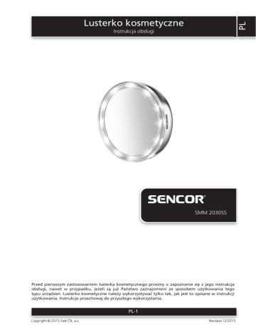 PL Lusterko kosmetyczne Instrukcja obsługi SMM 2030SS Przed pierwszym zastosowaniem lusterka kosmetycznego prosimy o zapoznanie się z jego instrukcja obsługi, nawet w przypadku, jeżeli są już Państwo zaznajomieni ze sposobem użytkowania tego typu urządzeń. Lusterko kosmetyczne należy wykorzystywać tylko tak, jak jest to opisane w instrukcji użytkowania. Instrukcje przechowaj do przyszłego wykorzystania. PL-1 2015 12/2015 PL Lusterko kosmetyczne SMM 2030SS SPIS TREŚCI ISTOTNE WSKAZÓWKI BEZPIECZEŃSTWA..................................................................................................... 3 OPIS LUSTERKA KOSMETYCZNEGO................................................................................................................ 5 INSTALACJA / WYMIANA BATERII.................................................................................................................. 5 PODSTAWOWE FUNKCJE LUSTERKA KOSMETYCZNEGO.............................................................................. 6 SPOSÓB UŻYCIA LUSTERKA KOSMETYCZNEGO............................................................................................ 6 INSTALACJA I WYMIANA BATERII.................................................................................................................. 6 KONSERWACJA I CZYSZCZENIE...................................................................................................................... 6 MAGAZYNOWANIE......................................................................................................................................... 7 LIKWIDACJA ZUŻYTYCH BATERII................................................................................................................... 7 DANE TECHNICZNE.......................................................................................................................................... 7 WSKAZÓWKI I INFORMACJE DOTYCZĄCE POSTĘPOWANIA ZE ZUŻYTYM OPAKOWANIEM.................... 8 LIKWIDACJA ZUŻYTYCH URZĄDZEŃ ELEKTRYCZNYCH I ELEKTRONICZNYCH............................................ 8 PL-2 2015 12/2015 PL Lusterko kosmetyczne SMM 2030SS ISTOTNE WSKAZÓWKI BEZPIECZEŃSTWA PROSIMY UWAŻNIE PRZECZYTAĆ I ZACHOWAĆ NA PRZYSZŁOŚĆ. • Rozpakuj uważnie wyrób, zwracając przy tym uwagę, abyś nie wyrzucił żadnej części materiału opakowaniowego, zanim nie znajdziesz wszystkich części wyrobu. • To lusterko kosmetyczne nie jest przeznaczone dla osób (łącznie z dziećmi) o ograniczonych zdolnościach fizycznych, psychicznych lub mentalnych lub dla osób o niewielkim doświadczeniu i wiedzy, o ile nie jest nad nimi sprawowany nadzór przez osobę odpowiedzialną za ich bezpieczeństwo lub jeśli nie zostały im podane instrukcje dotyczące używania tego lusterka kosmetycznego. • Dzieci powinny być pod nadzorem zapewniającym, że nie będą się bawić lusterkiem. • W żadnym przypadku nie naprawiaj sam urządzenia ani nie dokonuj w nim żadnych przeróbek – niebezpieczeństwo porażenia prądem elektrycznym! Wszelkie naprawy i regulację niniejszego urządzenia powierz wyspecjalizowanej firmie / serwisowi. Otwierając urządzenie w okresie gwarancyjnym ryzykujesz utratę gwarancji. • Z urządzenia korzystaj i przechowuj go poza zasięgiem materiałów palnych i lotnych. • Nie narażaj lusterka na oddziaływanie wysokiej temperatury, bezpośredniego światła słonecznego, nadmiernej wilgoci i nie ustawiaj go w nadmiernie zakurzonym środowisku. • Nie umieszczaj go w pobliżu elementów grzewczych, otwartego płomienia oraz innych odbiorników lub urządzeń, które są źródłami ciepła. • Lusterka należy używać wyłącznie do celów, do których jest przeznaczone. • Lusterko przymocuj do mocnej, stabilnej powierzchni. • Lusterka nie spryskuj wodą, ani żadnym innym płynem. Do lusterka nie wlewaj wody ani innych płynów. Nigdy nie zanurzaj lusterka w wodzie ani innej cieczy. PL-3 2015 12/2015 PL Lusterko kosmetyczne SMM 2030SS • W lusterku nie stosuj akumulatorków. • Jeżeli przez dłuższy czas nie będziesz korzystał z lusterka, wyjmij z niego baterie. W odwrotnym przypadku może dojść do ich wycieku do lusterka i do jego niezwrotnego uszkodzenia. • Producent nie odpowiada za szkody spowodowane na skutek niewłaściwego użycia urządzenia i jego wyposażenia (za skaleczenia, oparzenia, pożar itp.). PL-4 2015 12/2015 PL Lusterko kosmetyczne SMM 2030SS OPIS LUSTERKA KOSMETYCZNEGO A 3 1 2 4 5 1 Lusterko 4 Przyssawki 2 Oświetlenie LED lusterka 5 Przycisk włączone / wyłączone 3 Przegub zawieszenia lusterka INSTALACJA / WYMIANA BATERII B PL-5 2015 12/2015 PL Lusterko kosmetyczne SMM 2030SS PODSTAWOWE FUNKCJE LUSTERKA KOSMETYCZNEGO Możliwość zastosowania - lusterko można przymocować przy pomocy przyssawek (część opakowania) do zwierciadła - lusterko można przymocować na ścianie przy pomocy śrub (śruby nie są częścią opakowania) - lusterko można trzymać w ręce, albo zabrać go ze sobą do torebki Ustawianie lusterka w wymaganej pozycji Mocowanie lusterka rozwiązane jest tak, by można było go wychylać do góry i w dół oraz w bok. Jednocześnie można lusterko wyjąć z uchwytu. Oświetlenie LED lusterka Oświetlenie lusterka można włączyć przy pomocy przycisku A5. Przycisk A5 znajduje się na tylnej stronie korpusu lusterka. Do oświetlenia lusterka kosmetycznego zastosowane zostało LED źródło światła. Źródło światła LED charakteryzuje się niskim zużyciem energii i długą żywotnością. SPOSÓB UŻYCIA LUSTERKA KOSMETYCZNEGO 1) Wyjmij lusterko z opakowania. 2) Przed pierwszym zastosowaniem lusterka trzeba włożyć baterie (patrz rozdział INSTALACJA I WYMIANA BATERII). 3) W uchwycie lusterka zamocuj przyssawki, które są częścią opakowania. Przyssawki lekko zwilż wodą. 4) Uchwyt lusterka przymocuj do gładkiej, czystej i odtłuszczonej powierzchni. 5) Lusterko przyłóż tylną stroną do uchwyt