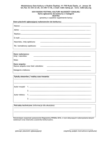 Młodzieżowy Dom Kultury w Rudzie Śląskiej; 41-700 Ruda Śląska, ul. Janasa 28 tel./fax 32 243 22 20, 32 248 13 46, e-mail: [email protected]; www. mdkruda.org XXVI RUDZKI FESTIWAL KULTURY MŁODZIEŻY SZKOLNEJ Karta zgłoszenia do konkursu w kategorii MUZYKA (prosimy o czytelne wypełnienie karty) Dane placówki zgłaszającej wykonawców do konkursu: Nazwa: ……………………………………………………………………………………………………………………………………… Adres: ……………………………………………………………………………………………………………………………..…….. Telefon:……………………………………………………………………………………………………………………………………… E-mail: …………………………………………………………………………………………………………………………………….. Nazwisko, imię opiekuna: ………………………………………………………………………………………………. Tel. kontaktowy opiekuna: ………………………………………………………………………………………………. Dane wykonawcy: Imię i nazwisko: ……………………………………………………………………………………………………………. Wiek: ……………………………………………………………………………………………………………. Dane zespołu: Nazwa zespołu oraz ilość członków: …………………………………………………………………………………… Kategoria wiekowa: …………………………………………………………………………….……. Tytuły utworów / realny czas trwania: …………………………………………………………………………………………………………………………………………………… …………………………………………………………………………………………………………………………………………………… Autor muzyki 1. …………………………………………………………………………………………………………………….. 2. …………………………………………………………………………………………………………………….. Autor tekstu: 1. …………………………………………………………………………………………………………………….. 2. …………………………………………………………………………………………………………………….. Potrzeby techniczne (informacje dla akustyka): …………………………………………………………………………………………………………………………………………………… …………………………………………………………………………………………………………………………………………………… Potwierdzam znajomość postanowień Regulaminu RFKMSz 2016, w tym dotyczących wykorzystania danych osobowych oraz wizerunku uczestnika konkursu(ów). …………………………………… (pieczęć placówki zgłaszającej) …………………………………………… (czytelny podpis instruktora/opiekuna) Młodzieżowy Dom Kultury w Rudzie Śląskiej; 41-700 Ruda Śląska, ul. Janasa 28 tel./fax 32 243 22 20, 32 248 13 46, e-mail: [email protected]; www. mdkruda.org XXVI RUDZKI FESTIWAL KULTURY MŁODZIEŻY SZKOLNEJ Karta zgłoszenia do konkursu plastycznego – drużynowego na formę przestrzenną (prosimy o czytelne wypełnienie karty) Dane placówki: Nazwa: ……………………………………………………………………………………………………………………………………… Adres: ……………………………………………………………………………………………………………………………..…….. Telefon:……………………………………………………………………………………………………………………………………… E-mail: …………………………………………………………………………………………………………………………………….. Nazwisko, imię opiekuna: ………………………………………………………………………………………………. Tel. kontaktowy opiekuna: ………………………………………………………………………………………………. Imiona i nazwiska członków zespołu, wiek, klasa: ……………………………………………………………………………………………….. ……………………………………………………………………………………………….. ……………………………………………………………………………………………….. ……………………………………………………………………………………………….. Kategoria wiekowa zespołu: ……………………………………………………………………………………………….. Tytuł pracy: ……………………………………………………………………………………………….. ……………………………………………………………………………………………….. Potwierdzam znajomość postanowień Regulaminu RFKMSz 2016, w tym dotyczących wykorzystania danych osobowych oraz wizerunku uczestnika konkursu(ów). …………………………………… (pieczęć placówki zgłaszającej) …………………………………………… (czytelny podpis instruktora/opiekuna) Młodzieżowy Dom Kultury w Rudzie Śląsk