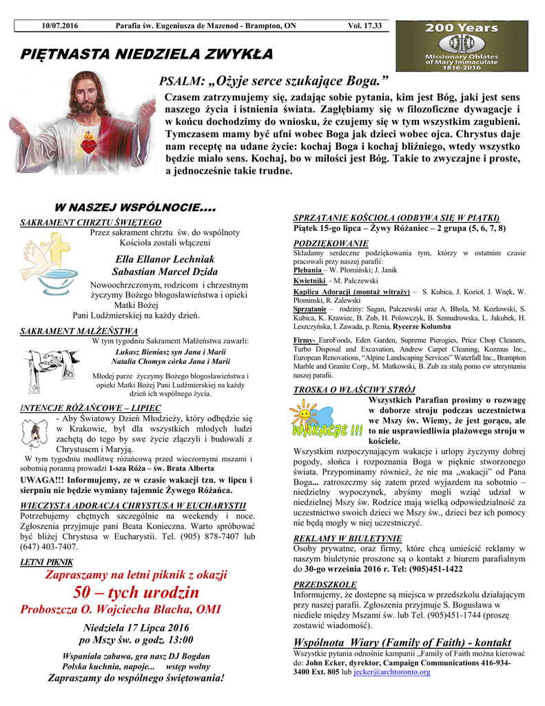 10/07.2016 Parafia św. Eugeniusza de Mazenod - Brampton, ON Vol. 17.33 PIĘTNASTA NIEDZIELA ZWYKŁA PSALM: „Ożyje serce szukające Boga.” Czasem zatrzymujemy się, zadając sobie pytania, kim jest Bóg, jaki jest sens naszego życia i istnienia świata. Zagłębiamy się w filozoficzne dywagacje i w końcu dochodzimy do wniosku, że czujemy się w tym wszystkim zagubieni. Tymczasem mamy być ufni wobec Boga jak dzieci wobec ojca. Chrystus daje nam receptę na udane życie: kochaj Boga i kochaj bliźniego, wtedy wszystko będzie miało sens. Kochaj, bo w miłości jest Bóg. Takie to zwyczajne i proste, a jednocześnie takie trudne. W NASZEJ WSPÓLNOCIE.... SAKRAMENT CHRZTU ŚWIĘTEGO Przez sakrament chrztu św. do wspólnoty Kościoła zostali włączeni Ella Ellanor Lechniak Sabastian Marcel Dzida Nowoochrzczonym, rodzicom i chrzestnym życzymy Bożego błogosławieństwa i opieki Matki Bożej Pani Ludźmierskiej na każdy dzień. SAKRAMENT MAŁŻEŃSTWA W tym tygodniu Sakrament Małżeństwa zawarli: Lukasz Bieniasz syn Jana i Marii Natalia Chomyn córka Jana i Marii Młodej parze życzymy Bożego błogosławieństwa i opieki Matki Bożej Pani Ludźmierskiej na każdy dzień ich wspólnego życia. INTENCJE RÓŻAŃCOWE – LIPIEC - Aby Światowy Dzień Młodzieży, który odbędzie się w Krakowie, był dla wszystkich młodych ludzi zachętą do tego by swe życie złączyli i budowali z Chrystusem i Maryją. W tym tygodniu modlitwę różańcową przed wieczornymi mszami i sobotnią poranną prowadzi 1-sza Róża – św. Brata Alberta UWAGA!!! Informujemy, ze w czasie wakacji tzn. w lipcu i sierpniu nie będzie wymiany tajemnic Żywego Różańca. WIECZYSTA ADORACJA CHRYSTUSA W EUCHARYSTII Potrzebujemy chętnych szczególnie na weekendy i noce. Zgłoszenia przyjmuje pani Beata Konieczna. Warto spróbować być bliżej Chrystusa w Eucharystii. Tel. (905) 878-7407 lub (647) 403-7407. LETNI PIKNIK Zapraszamy na letni piknik z okazji 50 – tych urodzin Proboszcza O. Wojciecha Błacha, OMI Niedziela 17 Lipca 2016 po Mszy św. o godz. 13:00 Wspaniała zabawa, gra nasz DJ Bogdan Polska kuchnia, napoje... wstęp wolny Zapraszamy do wspólnego świętowania! SPRZĄTANIE KOŚCIOŁA (ODBYWA SIĘ W PIĄTKI) Piątek 15-go lipca – Żywy Różaniec – 2 grupa (5, 6, 7, 8) PODZIĘKOWANIE Składamy serdeczne podziękowania tym, którzy w ostatnim czasie pracowali przy naszej parafii: Plebania – W. Płomiński; J. Janik Kwietniki - M. Palczewski Kaplica Adoracji (montaż witraży) – S. Kubica, J. Kozioł, J. Wnęk, W. Płominski, R. Zalewski Sprzątanie – rodziny: Sagan, Palczewski oraz A. Bhola, M. Kozłowski, S. Kubica, K. Krawiec, B. Zub, H. Polowczyk, B. Szmudrowska, L. Jakubek, H. Leszczyńska, I. Zawada, p. Renia, Rycerze Kolumba Firmy- EuroFoods, Eden Garden, Supreme Pierogies, Price Chop Cleaners, Turbo Disposal and Excavation, Andrew Carpet Cleaning, Kozmus Inc., European Renovations, “Alpine Landscaping Services” Waterfall Inc., Brampton Marble and Granite Corp., M. Matkowski, B. Zub za stałą pomo cw utrzymaniu naszej parafii. TROSKA O WŁAŚCIWY STRÓJ Wszystkich Parafian prosimy o rozwagę w doborze stroju podczas uczestnictwa we Mszy św. Wiemy, że jest gorąco, ale to nie usprawiedliwia plażowego stroju w kościele. Wszystkim rozpoczynającym wakacje i urlopy życzymy dobrej pogody, słońca i rozpoznania Boga w pięknie stworzonego świata. Przypominamy również, że nie ma „wakacji” od Pana Boga... zatroszczmy się zatem przed wyjazdem na sobotnio – niedzielny wypoczynek, abyśmy mogli wziąć udział w niedzielnej Mszy św. Rodzice mają wielką odpowiedzialność za uczestnictwo swoich dzieci we Mszy św., dzieci bez ich pomocy nie będą mogły w niej uczestniczyć. REKLAMY W BIULETYNIE Osoby prywatne, oraz firmy, które chcą umieścić reklamy w naszym biuletynie proszone są o kontakt z biurem parafialnym do 30-go września 2016 r. Tel: (905)451-1422 PRZEDSZKOLE Informujemy, że dostepne są miejsca w przedszkolu działającym przy naszej parafii. Zgłoszenia przyjmuje S. Bogusława w niediele między Mszami św. lub Tel. (905)451-1744 (proszę zostawić wiadomość). Wspólnota Wiary (Family of Faith) - kontakt Wszystkie pytania odnośnie kampanii „Family of Faith można kierować do: John Ecker, dyrektor, Campaign Communications 416-9343400 Ext. 805 lub [email protected] WYDARZENIA ..... KATOLICKIE RADIO RODZINA zaprasza dzisiaj na wielki piknik do Parku im. I. Paderewskiego. Mszę św. o godz.12:00 odprawi i homilię wygłosi O. Marian Gil OMI, Prowincjał. W programie Pikniku gorący bufet i napoje, konkursy z nagrodami dla dzieci i dorosłych, Loteria Fantowa i rodzinna atmosfera. Gościnnie z Polski wystąpi JAN PIETRZAK w programie kabaretowym i koncercie „Niech żyje Polska”. Do tańca zagra zespół NON STOP. Brama otwarta od godz. 9:00 am. Bilety: $ 15:00. Dzieci do lat 14:00 wstęp wolny.Dochód przeznaczony na utrzymanie Radia Rodzina. Więcej informacji: radiorodzina.com. lub Tel: 416.-588-.0555 Chór Quo Vadis i Zespół Camerata serdecznie zapraszają całą Polonię na Piknik z Zespołem Mr. System w niedzielę 24 Lipca po Mszy św. o godz: 11 w Domu Matki Boskiej Ludzmierskiej w Brampton, przy kościele św. Eugeniusza. 1252 Steels Ave West. Organizatorzy, oraz znakomity zespół Mr. System zapewniają wspaniałą zabawę: - wiele atrakcji - loterię z atrakcyjnymi nagrodami - wyśmienita polska kuchnia - tradycyjne polskie napoje... oraz ... - coś wyjątkowego - Śpiewać każdy może... trochę lepiej, lub... jeszcze lepiej..., czeka wspaniała nagroda ...to dopiero będzie zabawa!!! Wstęp jest bezpłatny.!!! Gorąco zapraszamy! XXVII FESTIWAL PIOSENKI RELIGIJNEJ Katolickie Radio Rodzina zaprasza wokalistów do udziału w 27 Festiwalu Piosenki Religijnej, który odbędzie się 19 i 20 listopada 2016 r. w Centrum Jana Pawła II w Mississauga. W nawiązaniu do 200 rocznicy istnienia Zgromadzenia Misjonarzy Oblatów Maryi Nie