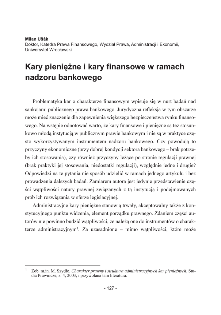 Milan Ušák Doktor, Katedra Prawa Finansowego, Wydział Prawa, Administracji i Ekonomii, Uniwersytet Wrocławski Kary pieniężne i kary finansowe w ramach nadzoru bankowego Problematyka kar o charakterze finansowym wpisuje się w nurt badań nad sankcjami publicznego prawa bankowego. Jurydyczna refleksja w tym obszarze może mieć znaczenie dla zapewnienia większego bezpieczeństwa rynku finansowego. Na wstępie odnotować warto, że kary finansowe i pieniężne są też stosunkowo młodą instytucją w publicznym prawie bankowym i nie są w praktyce często wykorzystywanym instrumentem nadzoru bankowego. Czy powodują to przyczyny ekonomiczne (przy dobrej kondycji sektora bankowego – brak potrzeby ich stosowania), czy również przyczyny leżące po stronie regulacji prawnej (brak praktyki jej stosowania, niedostatki regulacji), względnie jedne i drugie? Odpowiedzi na te pytania nie sposób udzielić w ramach jednego artykułu i bez prowadzenia dalszych badań. Zamiarem autora jest jedynie przedstawienie części wątpliwości natury prawnej związanych z tą instytucją i podejmowanych prób ich rozwiązania w sferze legislacyjnej. Administracyjne kary pieniężne stanowią trwały, akceptowalny także z konstytucyjnego punktu widzenia, element porządku prawnego. Zdaniem części autorów nie powinno budzić wątpliwości, że należą one do instrumentów o charakterze administracyjnym1. Za uzasadnione – mimo wątpliwości, które może 1 Zob. m.in. M. Szydło, Charakter prawny i struktura administracyjnych kar pieniężnych, Studia Prawnicze, z. 4, 2003, i przywołana tam literatura. - 127 - Milan Ušák niekiedy rodzić odróżnienie ich od grzywien – uznać trzeba traktowanie tej kategorii jako odrębnego rodzaju należności budżetowych2. Wśród instrumentów wykonywanego przez KNF nadzoru publicznego nad sektorem bankowym znajdują się kary finansowe i kary pieniężne (art. 138 ust. 3 pkt 3a i art. 141 ustawy z 29 sierpnia 1997 r. Prawo bankowe3). Kary finansowe mogą być nakładane na banki, oddziały instytucji kredytowych i banków zagranicznych oraz instytucje finansowe. Kary pieniężne mogą być stosowane do członków zarządu banku lub instytucji finansowej oraz władz oddziału instytucji kredytowej4. Jednym z podstawowych problemów wiążących się ze stosowaniem kar administracyjnych jest kwestia ich stosowania łącznie z innymi sankcjami. W literaturze wyrażono pogląd, w myśl którego przepisy art. 138 ust. 3 i art. 141 ust. 3 ustawy z 29 sierpnia 1997 r. – Prawo bankowe5 dopuszczają możliwość kumulatywnego stosowania przez KNF różnych środków nadzorczych pod adresem określonego członka zarządu – obok nałożonej kary pieniężnej (zgodnie z art. 141 p.b.) KNF może skierować do niego także inne (wymienione w art. 138 ust. 3 p.b.) środki nadzorcze. Z art. 141 ust. 3 p.b. w zw. z art. 138 ust. 3 p.b. wynika też dopuszczalność zastosowania przez KNF określonych środków nadzorczych zarówno w stosunku do danego członka zarządu banku, jak też i wobec samego banku (w tym kumulatywnego zastosowania kary finansowej i pieniężnej). Możliwe wydaje się również zastosowanie kumulatywne kar pieniężnych nakładanych na różnych członków zarządu6. Jednak wydaje się, że za zbyt daleko idące trzeba uznać twierdzenie, iż kara pieniężna może zostać nałożona na wszystkich członków zarządu, jeśli nie jest możliwe precyzyjne wskazanie, który z nich po2 M. Ślifirczyk, Niepodatkowe należności budżetowe – pojęcie i systematyka, Gdańskie Studia Prawnicze, t. XVI, 2007. 3 Tekst jednolity Dz.U. z 2002 r., Nr 72, poz. 665, ze zm.; dalej: p.b. 4 Art. 48 h ust. 5, art. 48 k ust. 2, art. 138 ust. 3 pkt 3a, art. 139 ust. 2, art. 148 a ust. 3 p.b. Ustawa nie przewiduje nakładania kar pieniężnych na władze oddziału banku zagranicznego. 5 6 Tekst jednolity Dz.U. z 2002 r., Nr 72, poz. 665, ze zm.; dalej: p.b. K. Kohutek (w:) F. Zoll (red.), Prawo bankowe. Komentarz, t. II, Warszawa 2005, s. 511 i 530. - 128 - Milan Ušák nosi odpowiedzialność7. Taka interpetacja art. 138 ust. 3 i 141 ust. 3 p.b. musi budzić wątpliwości ze względu na to, że organ nadzoru nie powinien karać dwa razy za to samo8. Pojawia się zatem kwestia przesłanek pozytywnych i negatywnych kumulatywnego nałożenia kar finansowych i pieniężnych na bank i członka zarządu, a także kar pieniężnych na dwóch lub więcej członków zarządu w związku ze stwierdzeniem przez KNF tych samych naruszeń. Ustawodawca na ten temat milczy. Prawo bankowe w lakonicznej regulacji dotyczącej kar finansowych i pieniężnych nie normuje też kwestii kumulowania kar z innymi sankcjami o charakterze administracyjnym, jak i wielokrotnego ich nakładania9. Kolejnym problemem (którego rozwiązanie, jak słusznie zauważa się w literaturze10, nie może być przeniesione tylko na organy stosujące prawo, poprzez odwołanie się do reguł wykładni) jest kwestia karania dwiema karami – sankcją administracyjną i karą kryminalną za ten sam czyn. Przepisy prawa winny zawierać wyraźne unormowania, jak należy postępować w przypadku zbiegu odpowiedzialności administracyjnej z odpowiedzialnością karną za czyn o tych samych znamionach przedmiotowych i podmiotowych, gdy jedyną różnicą w konstrukcji normy są odmienne zasady odpowiedzialności – obiektywna i na zasadzie winy11. 7 Inaczej: L. Mazur, Prawo bankowe. Komentarz, Warszawa 2005, s. 720. 8 Zob. dalsze uwagi dot. Rekomendacji Komitetu Ministrów Rady Europy R (91)1 z 13 lutego 1991 r. w sprawie sankcji administracyjnych i Konwencji o Ochronie Praw Człowieka i Podstawowych Wolności. 9 W porównaniu z przepisami p.b. rozwiązania przyjęte np. w ustawie z 28 sierpnia 1997 r. o organizacji i funkcjonowaniu funduszy emerytalnych (tj. Dz.U. z 2004 r., Nr 159, poz. 1667, ze zm.; dalej: u. o o f.e.) – np. art. 173 ust. 8 (także art. 165 do 176a) są bardziej rozbudowane. 10 M. Wincenci