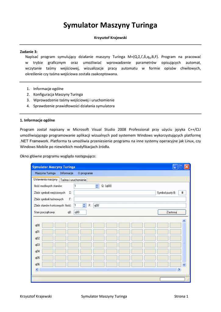 Napisad program symulujący działanie maszyny Turinga M=(Q,Σ,Γ,δ,q0,B,F). Program na pracowad